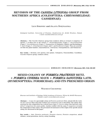 A N N A L E S Z O O L O G I C I (Warszawa), 2001, 51(2): 153-184 REVISION OF THE CASSIDA LITIGIOSA GROUP FROM SOUTHERN AFRICA (COLEOPTERA: CHRYSOMELIDAE: CASSIDINAE) LECH BOROWIEC and JOLANTA WIÊTOJAÑSKA Zoological Institute, University of Wroc³aw, Sienkiewicza 21, 50-335 Wroc³aw, Poland, e-mail: [email protected] Abstract. The Cassida litigiosa group from southern Africa is revised. It comprises 13 species, 7 of them new to the science: C. chrysanthemoides (Cape), C. diversepunctata (Cape), C. foveolatipennis (Cape), C. limpopoana (S Zimbabwe, Malawi, and Mozambique), C. lycii (Cape), C. reticulipennis (Cape), and C. spatiosiformis (Cape). They are associated with four plant families: Amaranthaceae, Asteraceae, Chenopodiaceae, and Solanaceae. Ë Key words. Revision, new species, host plants, Coleoptera, Chrysomelidae, Cassidinae, Cassida litigiosa group, southern Africa. A N N A L E S Z O O L O G I C I (Warszawa), 2001, 51(2): 205-209 MIXED COLONY OF FORMICA PRATENSIS RETZ. + FORMICA CINEREA MAYR + FORMICA SANGUINEA LATR. (HYMENOPTERA: FORMICIDAE) AND ITS PRESUMED ORIGIN WOJCIECH CZECHOWSKI Museum and Institute of Zoology, Polish Academy of Sciences, Wilcza 64, 00-679 Warszawa, Poland, e-mail: [email protected] Abstract. A case of a queenright colony of Formica pratensis Retz. mixed with the workers of F. cinerea Mayr and some workers of F. sanguinea Latr. is described. The colony characterized by this composition has evolved from a pure F. cinerea colony that had been raided by F. sanguinea two years earlier. Another conflict with the same F. sanguinea revealed the composition of this colony. The presumed circumstances of the origin of the specific mixed colony are discussed in this paper. Ë Key words. Ants, Formica pratensis, Formica cinerea, Formica sanguinea, mixed colonies, social parasitism, slavery, colony founding. A N N A L E S Z O O L O G I C I (Warszawa), 2001, 51(2): 233-250 A REDESCRIPTION OF MICROTROMBIDIUM PUSILLUM (HERMANN, 1804) (ACARI: PARASITENGONA: MICROTROMBIDIIDAE) WITH NOTES ON TAXONOMY AND BIOLOGY GRZEGORZ GABRY1,2,4 and ANDREAS WOHLTMANN3 1 Department of Zoology, Agricultural University of Wroc³aw, Cybulskiego 20, 50-205 Wroc³aw, Poland, e-mail: [email protected] 2 Department of Biology, Institute of Biotechnology and Environmental Sciences, Pedagogical University, Monte Cassino 21B, 65-561 Zielona Góra, Poland, e-mail: [email protected] 3 Institut für Biologie/Zoologie, Freie Universität Berlin, Königin-Luise-Strasse 1-3, D-14195 Berlin, Germany, e-mail: [email protected] 4 to whom all correspondence should be sent Abstract. The adult and deutonymph of Microtrombidium pusillum (Hermann, 1804) are redescribed; the heteromorphic larva reared in laboratory is described for the first time. The taxonomic status of the genus is revised; diagnoses of all active instars are provided. The neotype is designated basing on the female from which larvae have been obtained by experimental rearing. Megophthrombium Mullen and Vercammen-Grandjean, 1978, Phlebotrombium Fain and Baker, 1993 and Crinitrombium Southcott, 1994 are considered subjective junior synonyms of Microtrombidium Haller, 1882. Larvae hitherto described as Microtrombidium do not belong to this genus; their generic status is discussed. Alexothrombium gen. nov. based on Microtrombidium baerti Fain and Grootaert, 1993 as type species and Parawillungella gen. nov. based on Microtrombidium nitidum Southcott, 1994 as type species are described. The phenology, life cycle and parasitism of M. pusillum are discussed and compared with adequate data for other Microtrombidiidae. Ë Key words. Acarology, taxonomy, biology, life cycle, neotype, Microtrombidiidae, Microtrombidium, M. pusillum. A N N A L E S Z O O L O G I C I (Warszawa), 2001, 51(2): 227-231 A REDESCRIPTION OF ABROLOPHUS SCHWEIZERI (EVANS, 1952) COMB. NOV. (ACARI: PARASITENGONA: ERYTHRAEIDAE) GRZEGORZ GABRY1, 2 1Department of Zoology, Agricultural University of Wroc³aw, Cybulskiego 20, 50-205 Wroc³aw, Poland, e-mail: [email protected] 2Department of Biology, Institute of Biotechnology and Environmental Sciences, Pedagogical University, Monte Cassino 21B, 65-561 Zielona Góra, Poland, e-mail: [email protected] Abstract. Abrolophus schweizeri (Evans, 1952) comb. nov. is redescribed basing on holotype. Diagnosis and description are supplemented with standard measurements, not considered in original paper. Morphological structures, not included in original description, are figured. The taxonomic status of the species is discussed. Ë Key words Acarology, Erythraeidae, Abrolophus schweizeri, redescription, new combination. A N N A L E S Z O O L O G I C I (Warszawa), 2001, 51(2): 147-152 TWO NEW SPECIES OF PSEUDOBLAPS GUÉRIN, 1834 (COLEOPTERA: TENEBRIONIDAE: PLATYNOTINI) FROM ASIA DARIUSZ IWAN Museum and Institute of Zoology, Polish Academy of Sciences, Wilcza 64, 00-679 Warszawa, Poland; e-mail: [email protected] Abstract. Pseudoblaps becvari sp. nov. from Pakistan and P. kazakhstaniensis sp. nov. from Kazakhstan are described and illustrated. Ë Key words. Entomology, taxonomy, Coleoptera, Tenebrionidae, Platynotini, Pseudoblaps, new species, Pakistan, Kazakhstan. A N N A L E S Z O O L O G I C I (Warszawa), 2001, 51(2): 197-203 A REVIEW OF THE GENUS BYRSINUS FIEBER, 1860 (HEMIPTERA: HETEROPTERA: CYDNIDAE) IN AUSTRALIA, WITH A KEY TO AUSTRALO-PACIFIC SPECIES JERZY A. LIS Department of Biosystematics, Division of Zoology, University of Opole, Oleska 22, 45-052 Opole, Poland, e-mail: [email protected] Abstract. A review of Australian species of the genus Byrsinus Fieber, 1860 is presented. Byrsinus australis sp. nov. (New South Wales, South Australia), and B. multitrichus sp. nov. (South Australia, Victoria) are described and compared with B. ochraceus (Distant). The latter is redescribed based on the type specimen from Tasmania and other specimens recorded for the first time from New South Wales, Northern Territory, and South Australia. B. setosus J.A.
