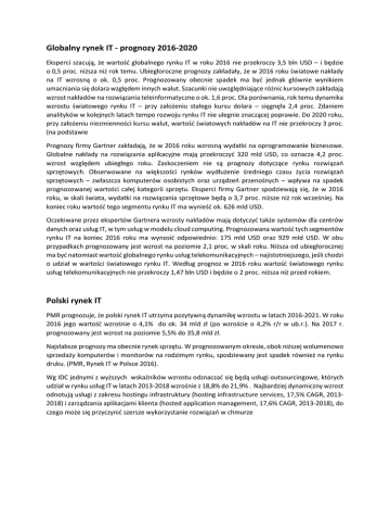 Globalny rynek IT - prognozy 2016-2020 Eksperci szacują, że wartość globalnego rynku IT w roku 2016 nie przekroczy 3,5 bln USD – i będzie o 0,5 proc. niższa niż rok temu. Ubiegłoroczne prognozy zakładały, że w 2016 roku światowe nakłady na IT wzrosną o ok. 0,5 proc. Prognozowany obecnie spadek ma być jednak głównie wynikiem umacniania się dolara względem innych walut. Szacunki nie uwzględniające różnic kursowych zakładają wzrost nakładów na rozwiązania teleinformatyczne o ok. 1,6 proc. Dla porównania, rok temu dynamika wzrostu światowego rynku IT – przy założeniu stałego kursu dolara – sięgnęła 2,4 proc. Zdaniem analityków w kolejnych latach tempo rozwoju rynku IT nie ulegnie znaczącej poprawie. Do 2020 roku, przy założeniu niezmienności kursu walut, wartość światowych nakładów na IT nie przekroczy 3 proc. (na podstawie Prognozy firmy Gartner zakładają, że w 2016 roku wzrosną wydatki na oprogramowanie biznesowe. Globalne nakłady na rozwiązania aplikacyjne mają przekroczyć 320 mld USD, co oznacza 4,2 proc. wzrost względem ubiegłego roku. Zaskoczeniem nie są prognozy dotyczące rynku rozwiązań sprzętowych. Obserwowane na większości rynków wydłużenie średniego czasu życia rozwiązań sprzętowych – zwłaszcza komputerów osobistych oraz urządzeń przenośnych – wpływa na spadek prognozowanej wartości całej kategorii sprzętu. Eksperci firmy Gartner spodziewają się, że w 2016 roku, w skali świata, wydatki na rozwiązania sprzętowe będą o 3,7 proc. niższe niż rok wcześniej. Na koniec roku wartość tego segmentu rynku IT ma wynieść ok. 626 mld USD. Oczekiwane przez ekspertów Gartnera wzrosty nakładów mają dotyczyć także systemów dla centrów danych oraz usług IT, w tym usług w modelu cloud computing. Prognozowana wartość tych segmentów rynku IT na koniec 2016 roku ma wynosić odpowiednio: 175 mld USD oraz 929 mld USD. W obu przypadkach prognozowany jest wzrost na poziomie 2,1 proc. w skali roku. Niższa od ubiegłorocznej ma być natomiast wartość globalnego rynku usług telekomunikacyjnych – najistotniejszego, jeśli chodzi o udział w wartości światowego rynku IT. Według prognoz w 2016 roku wartość światowego rynku usług telekomunikacyjnych nie przekroczy 1,47 bln USD i będzie o 2 proc. niższa niż przed rokiem. Polski rynek IT PMR prognozuje, że polski rynek IT utrzyma pozytywną dynamikę wzrostu w latach 2016-2021. W roku 2016 jego wartość wzrośnie o 4,1% do ok. 34 mld zł (po wzroście o 4,2% r/r w ub.r.). Na 2017 r. prognozowany jest wzrost na poziomie 5,5% do 35,8 mld zł. Najsłabsze prognozy ma obecnie rynek sprzętu. W prognozowanym okresie, obok niższej wolumenowo sprzedaży komputerów i monitorów na rodzimym rynku, spodziewany jest spadek również na rynku druku. (PMR, Rynek IT w Polsce 2016). Wg IDC jednymi z wyższych wskaźników wzrostu odznaczać się będą usługi outsourcingowe, których udział w rynku usług IT w latach 2013-2018 wzrośnie z 18,8% do 21,9% . Najbardziej dynamiczny wzrost odnotują usługi z zakresu hostingu infrastruktury (hosting infrastructure services, 17,5% CAGR, 20132018) i zarządzania aplikacjami klienta (hosted application management, 17,6% CAGR, 2013-2018), do czego może się przyczynić szersze wykorzystanie rozwiązań w chmurze 1. Usługi chmurowe Wg PMR1 jednym z najważniejszych trendów w outsourcingu IT w Polsce w nadchodzących latach będzie wzrost popularności i wykorzystania usług w chmurze. W kolejnych latach, na rynku polskim, większe znaczenie będzie mieć chmura publiczna. Na korzyść rozwiązań chmury publicznej działa przede wszystkim potencjalna liczba odbiorców, w tym popularyzacja rozwiązań wśród małych i średnich firm. W przypadku chmury prywatnej natomiast czynnikiem o podobnym kierunku oddziaływania jest wielkość kontraktów, które zwykle mają zupełnie inny charakter i skalę niż w przypadku rozwiązań kupowanych w segmencie chmury publicznej. Zdaniem analityków PMR skala zjawiska w MŚP i wyższe wolumeny sprzedaży usług wezmą górę, natomiast duże firmy zaadoptują rozwiązania chmurowe częściowo, wpasowując je w obecną infrastrukturę i wykorzystując de facto model hybrydowy. Najwięcej przychodów z usług chmurowych generuje oprogramowanie w modelu SaaS (62 proc.), nieco mniejszy udział mają usługi IaaS (28 proc.) oraz PaaS (10 proc.). Analitycy twierdzą, iż skłonność do skorzystania z chmury nie zależy od wielkości firmy czy branży, a głównie od świadomości klientów. 1 Raport PMR: „Rynek przetwarzania danych w chmurze w Polsce 2016 – Analiza rynku i prognozy rozwoju na lata 2016-2021” 2. Sprzęt komputerowy Rynek PC w I kw. 2016 roku nie pokazał oznak poprawy. Według IDC spadek wyniósł 11,5 proc., a w ocenie Gartnera 9,6 proc. rok do roku. Po raz pierwszy od 2007 r. sprzedano mniej niż 65 mln urządzeń w jednym kwartale. Dostawy komputerów w I kw. 2016 r. (dane wstępne) Dostawy w I kw. 2016 r. (mln szt.) Udział w rynku w I kw. 2016 r. (%) Lenovo 12,484 19,3 13,458 18,8 -7,2 HP Inc. 11,408 17,6 12,537 17,5 -9,0 Dell 9,145 14,1 9,182 12,8 -0,4 Asus 5,365 8,3 5,288 7,4 1,5 Apple 4,611 7,1 4,563 6,4 1,0 Inni 21,764 33,6 26,657 37,2 -18,4 Razem 64,776 100,0 71,687 100,0 -9,6 Producent Dostawy w I kw. Udział w rynku w I Wzrost rok 2015 r. (mln szt.) kw. 2015 r. (%) do roku (%) Źródło: Gartner 3. Pamięci masowe W 2015 r. wartość polskiego rynku pamięci masowych wyniosła 147,36 mln USD – według IDC. To o 6,6 proc. więcej niż rok wcześniej. Rynek pamięci masowych liczony w petabajtach (PB) sprzedanej pojemności zanotował jeszcze większy wzrost, niż w ujęciu wartościowym - o 17,2 proc., do 134,2 PB. Pogłębił się natomiast trend spadkowy liczby sprzedanych macierzy – w stosunku do 2014 r. klienci kupili ich o 13,4 proc. mniej, tj. 5516 szt. Jest to związane z postępującą konsolidacją i wirtualizacją pamię