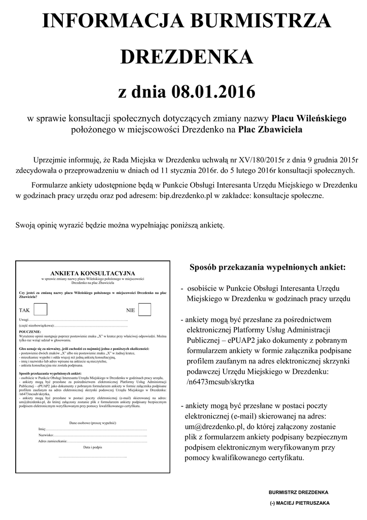INFORMACJA BURMISTRZA DREZDENKA z dnia 08.01.2016 w sprawie konsultacji społecznych dotyczących zmiany nazwy Placu Wileńskiego położonego w miejscowości Drezdenko na Plac Zbawiciela Uprzejmie informuję, że Rada Miejska w Drezdenku uchwałą nr XV/180/2015r z dnia 9 grudnia 2015r zdecydowała o przeprowadzeniu w dniach od 11 stycznia 2016r. do 5 lutego 2016r konsultacji społecznych. Formularze ankiety udostępnione będą w Punkcie Obsługi Interesanta Urzędu Miejskiego w Drezdenku w godzinach pracy urzędu oraz pod adresem: bip.drezdenko.pl w zakładce: konsultacje społeczne. Swoją opinię wyrazić będzie można wypełniając poniższą ankietę. ANKIETA KONSULTACYJNA Sposób przekazania wypełnionych ankiet: w sprawie zmiany nazwy placu Wileńskiego położonego w miejscowości Drezdenko na plac Zbawiciela Czy jesteś za zmianą nazwy placu Wileńskiego położonego w miejscowości Drezdenko na plac Zbawiciela? TAK - osobiście w Punkcie Obsługi Interesanta Urzędu Miejskiego w Drezdenku w godzinach pracy urzędu NIE Uwagi………………………………………………………………………….. (część nieobowiązkowa):……………………………………………………… POUCZENIE: Wyrażenie opinii następuje poprzez postawienie znaku „X” w kratce przy właściwej odpowiedzi. Można tylko raz wziąć udział w głosowaniu. Głos uznaje się za nieważny, jeśli zachodzi co najmniej jedna z poniższych okoliczności: - postawienie dwóch znaków „X” albo nie postawienie znaku „X” w żadnej kratce, - mieszkaniec wypełni i odda więcej niż jedną ankietę konsultacyjną, - imię i nazwisko lub adres wpisane na ankiecie są nieczytelne, - ankieta konsultacyjna nie została podpisana. Sposób przekazania wypełnionych ankiet: - osobiście w Punkcie Obsługi Interesanta Urzędu Miejskiego w Drezdenku w godzinach pracy urzędu, - ankiety mogą być przesłane za pośrednictwem elektronicznej Platformy Usług Administracji Publicznej – ePUAP2 jako dokumenty z pobranym formularzem ankiety w formie załącznika podpisane profilem zaufanym na adres elektronicznej skrzynki podawczej Urzędu Miejskiego w Drezdenku: /n6473mcsub/skrytka, - ankiety mogą być przesłane w postaci poczty elektronicznej (e-mail) skierowanej na adres: [email protected], do której załączony zostanie plik z formularzem ankiety podpisany bezpiecznym podpisem elektronicznym weryfikowanym przy pomocy kwalifikowanego certyfikatu. Dane osobowe (proszę wypełnić) Imię:…………………………………………………………………………… Nazwisko:……………………………………………………………………... Adres zamieszkania:…………………………………………………………… Data i podpis ………………………………………………….. - ankiety mogą być przesłane za pośrednictwem elektronicznej Platformy Usług Administracji Publicznej – ePUAP2 jako dokumenty z pobranym formularzem ankiety w formie załącznika podpisane profilem zaufanym na adres elektronicznej skrzynki podawczej Urzędu Miejskiego w Drezdenku: /n6473mcsub/skrytka - ankiety mogą być przesłane w postaci poczty elektronicznej (e-mail) skierowanej na adres: [email protected], do której załączony zostanie plik z formularzem ankiety podpisany bezpiecznym podpisem elektronicznym weryfikowanym przy pomocy kwalifikowanego certyfikatu. BURMISTRZ DREZDENKA (-) MACIEJ PIETRUSZAKA