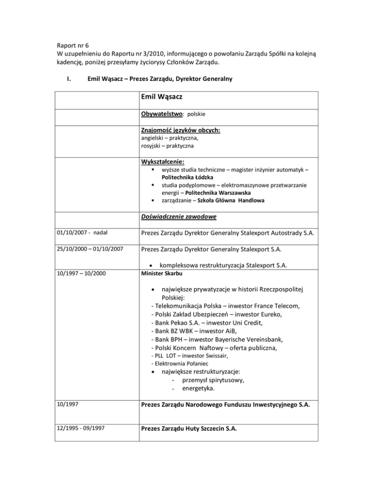Raport nr 6 W uzupełnieniu do Raportu nr 3/2010, informującego o powołaniu Zarządu Spółki na kolejną kadencję, poniżej przesyłamy życiorysy Członków Zarządu. I. Emil Wąsacz – Prezes Zarządu, Dyrektor Generalny Emil Wąsacz Obywatelstwo: polskie Znajomość języków obcych: angielski – praktyczna, rosyjski – praktyczna Wykształcenie: § § § wyższe studia techniczne – magister inżynier automatyk – Politechnika Łódzka studia podyplomowe – elektromaszynowe przetwarzanie energii – Politechnika Warszawska zarządzanie – Szkoła Główna Handlowa Doświadczenie zawodowe 01/10/2007 - nadal Prezes Zarządu Dyrektor Generalny Stalexport Autostrady S.A. 25/10/2000 – 01/10/2007 Prezes Zarządu Dyrektor Generalny Stalexport S.A. 10/1997 – 10/2000 • kompleksowa restrukturyzacja Stalexport S.A. Minister Skarbu największe prywatyzacje w historii Rzeczpospolitej Polskiej: - Telekomunikacja Polska – inwestor France Telecom, - Polski Zakład Ubezpieczeń – inwestor Eureko, - Bank Pekao S.A. – inwestor Uni Credit, - Bank BZ WBK – inwestor AiB, - Bank BPH – inwestor Bayerische Vereinsbank, - Polski Koncern Naftowy – oferta publiczna, • - PLL LOT – inwestor Swissair, - Elektrownia Połaniec • największe restrukturyzacje: - przemysł spirytusowy, energetyka. 10/1997 Prezes Zarządu Narodowego Funduszu Inwestycyjnego S.A. 12/1995 - 09/1997 Prezes Zarządu Huty Szczecin S.A. • restrukturyzacja Huty Szczecin, 11/1994 – 12/1995 Doradca Prezesów Zarządów: Banku Pekao S.A., Banku Śląskiego S.A., Stalexport S.A. 1991 – 10/1994 Prezes Zarządu Dyrektor Naczelny Huty Katowice • restrukturyzacja Huty Katowice, 1989 – 1990 Przewodniczący NSZZ „Solidarność” Huty Katowice 1976 – 1990 Praca na różnych stanowiskach w utrzymaniu ruchu automatyki w Hucie Katowice 07/1969 – 03/1976 Praca w biurze projektowo-konstrukcyjnym układów napędowych Apator • kilka patentów w dziedzinie automatyki napędów. Członkostwo w Radzie Nadzorczej Grupy Kapitałowej Stalexport Autostrady: stan na 2010 r. II. • Przewodniczący RN Stalexport Autostrada Małopolska S.A. Mieczysław Skołożyński – Wiceprezes Zarządu, Dyrektor Finansowy Mieczysław Skołożyński Obywatelstwo: polskie Znajomość języków obcych: Angielski – biegła Francuski – praktyczna Rosyjski - praktyczna 1977 Wykształcenie: wyższe § Szkoła Główna Planowania i Statystyki (obecnie SGH) Absolwent Wydziału Finansów i Statystyki (Finanse Międzynarodowe) Doświadczenie zawodowe 2007-nadal Stalexport Autostrady S.A. Wiceprezes Zarządu, Dyrektor Finansowy Odpowiedzialny za kierowanie finansami spółki. 2001-2007 Stalexport S.A. Odpowiedzialny za kompleksowy program restrukturyzacji finansowej Spółki, polegające na zawarciu układu, zamianie części długu na akcje i rozłożeniu, a następnie spłacie pozostałych zobowiązań w okresie 5-letnim. 1994-2000 Bank Polska Kasa Opieki S.A. Centrala w Warszawie Doradca Prezesa (1994-1995) Członek Zarządu (od II 1995 do IV 2000) Odpowiedzialny za gospodarkę pieniężną Banku oraz zarządzanie ryzykiem rynkowym i kredytowym; po prywatyzacji w 1999r. kierujący pionem korporacyjnym i międzynarodowym Od 1995r. Przewodniczący Komitetu Zarządzania Aktywami i Pasywami oraz wiceprzewodniczący Komitetu Kredytowego Zarządu, a także przewodniczący trzech rad nadzorczych spółek kontrolowanych przez Bank i członek rady nadzorczej spółki Budimex S.A. 1988-1994 Bank Polska Kasa Opieki S.A. Centrala w Paryżu Chief dealer (1988-1992) Zastępca Dyrektora (1992-1994) 1983-1988 Bank Polska Kasa Opieki S.A. Centrala w Warszawie Dealer (1983-1986) Chief dealer (1986-1988) Bank Handlowy w Warszawie S.A. Centrala w Warszawie 1977-1983 Członkostwo w Radzie Nadzorczej Grupy Kapitałowej Stalexport Autostrady: stan na 2010 r. • • • • • Przewodniczący Rady Nadzorczej Stalexport Transroute Autostrada S.A., Wiceprzewodniczący Rady Nadzorczej Stalexport Autostrada Małopolska S.A., Członek rady Nadzorczej Stalexport Autostrada Dolnośląska S.A., Członek Rady Nadzorczej Autostrada Mazowsze S.A., Członek Rady Nadzorczej Centrozap S.A.. III. Wojciech Roman Gębicki – Wiceprezes Zarządu, Dyrektor Operacyjny Wojciech Roman Gębicki Obywatelstwo: polskie, brytyjskie Znajomość języków obcych: Angielski – biegła Francuski – biegła Niemiecki – praktyczna Rosyjski – praktyczna Wykształcenie: • • • INSEAD, Fontainbleau, dyplom MBA Szkoła Główna Handlowa, Warszawa, wydziału Handlu Zagranicznego, dyplom magisterski Universite Libre de Bruxelles, Studia ekonomiczne Doświadczenie zawodowe 04/2009 - nadal Stalexport Autostrady S.A., Wiceprezes Zarządu, Dyrektor Operacyjny Odpowiedzialny za pozyskiwanie i rozwój nowych projektów oraz nadzór nad istniejącymi spółkami operacyjnymi Grupy. Stalexport Autostrada Małopolska S.A. Prezes Zarządu Zarządza projektem A4 Katowice-Kraków i odpowiada za strategię jego rozwoju. 09/2002 – 12/2008 Wycliffe Management, Londyn, Warszawa, Nowy Jork, Afryka Founder and Managing Partner Spółka doradcza z siedzibą w Polsce. Zajmował się pozyskiwaniem finansowania dla znaczących projektów infrastrukturalnych i transportowych w Europie Środkowo-Wschodniej. Autostrada Wielkopolska S.A. Londyn, Warszawa, Poznań Wiceprezes Zarządu, Dyrektor Finansowy Odpowiedzialny za wynegocjowanie i zawarcie prekursorskiego 37 – letniego pakietu finansowania o wartości 930 milionów euro dla projektu autostrady płatnej A2 realizowanego w systemie BOT. Credit Lyonnais Bank Polska S.A. Warszawa Wiceprezes Zarządu Odpowiedzialny za obsługę klientów: Commercial Banking, Customer Service Department, Corporate Finance Department, Capital Markets i M&A Departments, w tym pełna odpowiedzialność za sieć krajowych oddziałów. 10/1999 – 01/2002 11/1998 – 11/1999 10/1997 – 10/1999 Credit Lyonnais, z siedzibą UK, Londyn Dyrektor, Doradztwo Korporacyjne na Europę