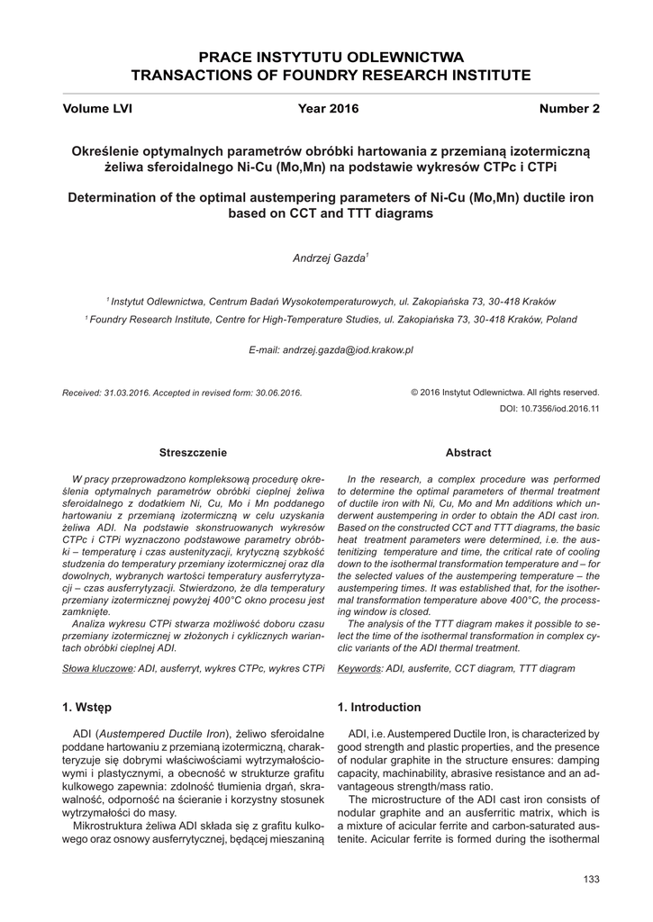 Określenie optymalnych parametrów obróbki hartowania z przemianą izotermiczną żeliwa sferoidalnego Ni-Cu (Mo,Mn) na podstawie wykresów CTPc i CTPi Determination of the optimal austempering parameters of Ni-Cu (Mo,Mn) ductile iron based on CCT and TTT diagrams Andrzej Gazda1 1 1 Instytut Odlewnictwa, Centrum Badań Wysokotemperaturowych, ul. Zakopiańska 73, 30-418 Kraków Foundry Research Institute, Centre for High-Temperature Studies, ul. Zakopiańska 73, 30-418 Kraków, Poland E-mail: [email protected] Received: 31.03.2016. Accepted in revised form: 30.06.2016. © 2016 Instytut Odlewnictwa. All rights reserved. DOI: 10.7356/iod.2016.11 Streszczenie Abstract W pracy przeprowadzono kompleksową procedurę określenia optymalnych parametrów obróbki cieplnej żeliwa sferoidalnego z dodatkiem Ni, Cu, Mo i Mn poddanego hartowaniu z przemianą izotermiczną w celu uzyskania żeliwa ADI. Na podstawie skonstruowanych wykresów CTPc i CTPi wyznaczono podstawowe parametry obróbki – temperaturę i czas austenityzacji, krytyczną szybkość studzenia do temperatury przemiany izotermicznej oraz dla dowolnych, wybranych wartości temperatury ausferrytyzacji – czas ausferrytyzacji. Stwierdzono, że dla temperatury przemiany izotermicznej powyżej 400°C okno procesu jest zamknięte. Analiza wykresu CTPi stwarza możliwość doboru czasu przemiany izotermicznej w złożonych i cyklicznych wariantach obróbki cieplnej ADI. In the research, a complex procedure was performed to determine the optimal parameters of thermal treatment of ductile iron with Ni, Cu, Mo and Mn additions which underwent austempering in order to obtain the ADI cast iron. Based on the constructed CCT and TTT diagrams, the basic heat treatment parameters were determined, i.e. the austenitizing temperature and time, the critical rate of cooling down to the isothermal transformation temperature and – for the selected values of the austempering temperature – the austempering times. It was established that, for the isothermal transformation temperature above 400°C, the processing window is closed. The analysis of the TTT diagram makes it possible to select the time of the isothermal transformation in complex cyclic variants of the ADI thermal treatment. Słowa kluczowe: ADI, ausferryt, wykres CTPc, wykres CTPi Keywords: ADI, ausferrite, CCT diagram, TTT diagram 1. Wstęp 1. Introduction ADI (Austempered Ductile Iron), żeliwo sferoidalne poddane hartowaniu z przemianą izotermiczną, charakteryzuje się dobrymi właściwościami wytrzymałościowymi i plastycznymi, a obecność w strukturze grafitu kulkowego zapewnia: zdolność tłumienia drgań, skrawalność, odporność na ścieranie i korzystny stosunek wytrzymałości do masy. Mikrostruktura żeliwa ADI składa się z grafitu kulkowego oraz osnowy ausferrytycznej, będącej mieszaniną ADI, i.e. Austempered Ductile Iron, is characterized by good strength and plastic properties, and the presence of nodular graphite in the structure ensures: damping capacity, machinability, abrasive resistance and an advantageous strength/mass ratio. The microstructure of the ADI cast iron consists of nodular graphite and an ausferritic matrix, which is a mixture of acicular ferrite and carbon-saturated austenite. Acicular ferrite is formed during the isothermal 133 A. Gazda: Określenie optymalnych parametrów obróbki hartowania z przemianą izotermiczną żeliwa sferoidalnego … ferrytu iglastego i austenitu nasyconego węglem. Ferryt iglasty powstaje podczas przemiany izotermicznej austenitu w temperaturowym zakresie tworzenia bainitu. Przemiana ta w żeliwie sferoidalnym zachodzi wolniej niż w stalach, a wysoka zawartość krzemu zapobiega tworzeniu się węglików. W pierwszym stadium przemiany prowadzącej do powstania struktury ausferrytycznej, austenit rozkłada się na ferryt iglasty α i austenit γs(C), który w miarę zachodzenia przemiany wzbogaca się w węgiel aż do zahamowania procesu powstawania ferrytu iglastego. Rośnie stabilność nasyconego węglem austenitu względem powstawania martenzytu podczas ochłodzenia do temperatury otoczenia. Po określonym czasie stabilności struktury α + γs(C) (okno procesu) następuje drugie stadium procesu – rozkład austenitu wzbogaconego w węgiel na ferryt i fazy węglikowe Fe3C (lub ε). Żeliwo ADI jest przedmiotem wielu badań i publikacji ze względu na swoje atrakcyjne właściwości użytkowe oraz możliwość analizy mechanizmu i kinetyki przemian fazowych prowadzących do powstania struktury ausferrytycznej, np. [1−6]. Dodatek pierwiastków stopowych polepsza hartowność żeliwa i ma znaczenie jedynie w odlewach grubościennych. Ponieważ przemiana ausferrytyczna rozpoczyna się w pobliżu wydzieleń węgla (obniżona zawartość węgla w austenicie), a w obszarach międzydendrytycznych o podwyższonej zawartości węgla, inicjowana jest później, mogą pojawić się w strukturze stopu dwa rodzaje austenitu – wchodzący w skład ausferrytu (podwyższona zawartość Ni, Si) i niskowęglowy, niestabilny, skłonny do utworzenia martenzytu po ochłodzeniu do temperatury otoczenia. Mangan wpływa znacząco na hartowność żeliwa, lecz ponieważ w czasie krzepnięcia segreguje na granicy kolonii eutektycznych gdzie tworzy węgliki, jego zawartość nie powinna przekroczyć 0,3% wag. Z podobnych względów zawartość molibdenu ogranicza się do 0,2% wag. Nikiel i miedź zwiększają hartowność i plastyczność w temperaturze przemiany izotermicznej poniżej 350°C. Podstawowymi parametrami obróbki cieplnej są: temperatura i czas austenityzacji (Ta, ta) oraz temperatura i czas przemiany izotermicznej (Tpi, tpi). Wzrost temperatury austenityzacji zwiększa zawartość węgla w austenicie, zwiększając jego hartowność, ale wpływa to niekorzystnie na przebieg przemiany izotermicznej, wydłużając jej czas. Obniżenie temperatury austenityzacji zwiększa siłę pędną przemiany w pierwszym stadium, lecz