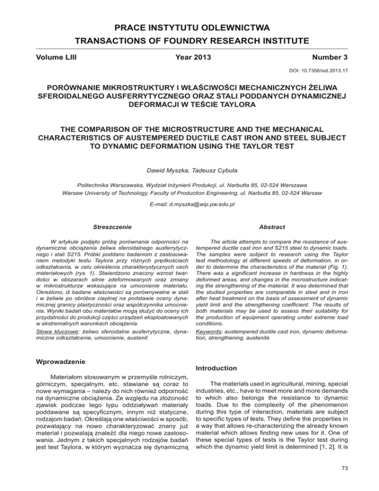 PRACE INSTYTUTU ODLEWNICTWA TRANSACTIONS OF FOUNDRY RESEARCH INSTITUTE Volume LIII Year 2013 Number 3 DOI: 10.7356/iod.2013.17 Porównanie mikrostruktury i właściwości mechanicznych żeliwa sferoidalnego ausferrytycznego oraz stali poddanych dynamicznej deformacji w teście Taylora The comparison of the microstructure and the mechanical characteristics of austempered ductile cast iron and steel subject to dynamic deformation using the Taylor test Dawid Myszka, Tadeusz Cybula Politechnika Warszawska, Wydział Inżynierii Produkcji, ul. Narbutta 85, 02-524 Warszawa Warsaw University of Technology, Faculty of Production Engineering, ul. Narbutta 85, 02-524 Warsaw E-mail: [email protected] Streszczenie Abstract W artykule podjęto próbę porównania odporności na dynamiczne obciążenia żeliwa sferoidalnego ausferrytycznego i stali S215. Próbki poddano badaniom z zastosowaniem metodyki testu Taylora przy różnych prędkościach odkształcenia, w celu określenia charakterystycznych cech materiałowych (rys. 1). Stwierdzono znaczny wzrost twardości w obszarach silnie zdeformowanych oraz zmiany w mikrostrukturze wskazujące na umocnienie materiału. Określono, iż badane właściwości są porównywalne w stali i w żeliwie po obróbce cieplnej na podstawie oceny dynamicznej granicy plastyczności oraz współczynnika umocnienia. Wyniki badań obu materiałów mogą służyć do oceny ich przydatności do produkcji części urządzeń eksploatowanych w ekstremalnych warunkach obciążenia. The article attempts to compare the resistance of austempered ductile cast iron and S215 steel to dynamic loads. The samples were subject to research using the Taylor test methodology at different speeds of deformation, in order to determine the characteristics of the material (Fig. 1). There was a significant increase in hardness in the highly deformed areas, and changes in the microstructure indicating the strengthening of the material. It was determined that the studied properties are comparable in steel and in iron after heat treatment on the basis of assessment of dynamic yield limit and the strengthening coefficient. The results of both materials may be used to assess their suitability for the production of equipment operating under extreme load conditions. Słowa kluczowe: żeliwo sferoidalne ausferrytyczne, dynamiczne odkształcenie, umocnienie, austenit Keywords: austempered ductile cast iron, dynamic deformation, strengthening, austenite Wprowadzenie Materiałom stosowanym w przemyśle rolniczym, górniczym, specjalnym, etc. stawiane są coraz to nowe wymagania – należy do nich również odporność na dynamiczne obciążenia. Ze względu na złożoność zjawisk podczas tego typu oddziaływań materiały poddawane są specyficznym, innym niż statyczne, rodzajom badań. Określają one właściwości w sposób, pozwalający na nowo charakteryzować znany już materiał i pozwalają znaleźć dla niego nowe zastosowania. Jednym z takich specjalnych rodzajów badań jest test Taylora, w którym wyznacza się dynamiczną Introduction The materials used in agricultural, mining, special industries, etc., have to meet more and more demands to which also belongs the resistance to dynamic loads. Due to the complexity of the phenomenon during this type of interaction, materials are subject to specific types of tests. They define the properties in a way that allows re-characterizing the already known material which allows finding new uses for it. One of these special types of tests is the Taylor test during which the dynamic yield limit is determined [1, 2]. It is 73 D. Myszka, T. Cybula: Porównanie mikrostruktury i właściwości mechanicznych żeliwa sferoidalnego ausferrytycznego… granicę plastyczności [1, 2]. Jest on niezwykle przydatny ze względu na możliwość szerokiego porównania z innymi materiałami oraz możliwość przełożenia jego wyników na aplikacyjne możliwości badanego materiału. Test Taylora zakłada dynamiczną deformację cylindrycznej próbki, która uderza z założoną prędkością w nieodkształcalną przegrodę (rys. 1). Parametry uderzenia oraz stopień deformacji próbki, który jest możliwy do określenia za pomocą geometrycznych pomiarów, jest miarą dynamicznych właściwości badanego materiału. Zastosowanie wyznaczonych w teście parametrów uderzenia oraz stopnia deformacji próbki do zależności (1) podanej przez Taylora pozwala na wyznaczenie tzw. dynamicznej granicy plastyczności. Zależność ta umożliwia porównanie różnych materiałów w warunkach dynamicznych obciążeń. incredibly useful due to the possibility to make a wide comparison with other materials and the possibility to translate the results to the application possibilities of the tested material. The Taylor test assumes the dynamic deformation of a cylindrical sample that hits with the assumed speed in a non-deformable barrier (Fig. 1). The parameters of the hit and the level of deformation of the sample, which can be identified with geometric measurements, is a measure of the dynamic properties of a material. The use of the parameters set in the impact test and the level of deformation of the sample to dependance (1) given by Taylor test allows for determining the so called dynamic yield limit. This dependance allows the comparison of different materials under dynamic loads. l 1 � ρV �1 � � � L 2 R� � L� L �1 � � l� � � L l� (1) Rys. 1. Założenia testu Taylora: a) próbka po deformacji, b) próbka przed deformacją; zależność (1), gdzie: Rd – dynamiczna granica plastyczności, ρ – gęstość materiału, V – prędkość uderzenia próbki, L – długość próbki przed uderzeniem, Lf – długość próbki po uderzeniu, lf – długość nieodkształconej części próbki po uderzeniu [2] Fig. 1. Taylor Test Assumptions: a) sample after deformation, b) sample before deformation; dependence (1), where: Rd – dynamic yield limit