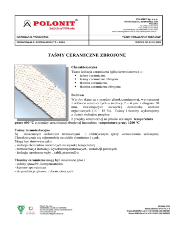 POLONIT Sp. z o.o. 95-010 Stryków, SOSNOWIEC 21B POLSKA Tel: (+48 42) 643 5916 Faks: (+48 42) 643 5906 Dział Handlowy Tel./Faks (+48 42) 643 5555 email: [email protected] http://www.polonit.com.pl INFORMACJA TECHNICZNA TAŚMY CERAMICZNE ZBROJONE OPRACOWAŁA: BOŻENA BORUTA - JURA WAŻNE OD 01.01.2009 TAŚMY CERAMICZNE ZBROJONE Charakterystyka Tkana izolacja ceramiczna (glinokrzemianowa) to : taśmy ceramiczne taśmy ceramiczne zbrojone tkanina ceramiczna tkanina ceramiczna zbrojona Budowa Wyroby tkane są z przędzy glinokrzemianowej, wytwarzanej z włókien ceramicznych o średnicy 2 – 4 µm i długości 50 mm, zawierających niewielką domieszkę włókien organicznych (14 – 18 %). Taśmy i tkaniny wykonujemy z dwóch rodzajów przędzy: z przędzy ceramicznej na pilocie szklanym temperatura pracy 600 ºC z przędzy ceramicznej zbrojonej inconelem temperatura pracy 1200 ºC Taśmy termoizolacyjne Są doskonałym izolatorem termicznymi i elektrycznym (przy wzmocnieniu szklanym). Charakteryzują się odpornością na ciekłe aluminium i cynk. Mogą być stosowane jako: - izolacja elementów narażonych na wysoką temperaturę - termoizolacja instalacji wysokotemperaturowych , instalacji parowych - izolacja termiczna węży , kabli, przewodów Tkaniny ceramiczne mogą być stosowane jako : - osłony spawów, kompensatorów - kurtyny spawalnicze - do produkcji rękawic i ubrań roboczych POLONIT Sp. z o.o. 95-010 Stryków, SOSNOWIEC 21B POLSKA Tel: (+48 42) 643 5916 Faks: (+48 42) 643 5906 Dział Handlowy Tel./Faks (+48 42) 643 5555 email: [email protected] http://www.polonit.com.pl INFORMACJA TECHNICZNA TAŚMY CERAMICZNE ZBROJONE OPRACOWAŁA: BOŻENA BORUTA - JURA WAŻNE OD 01.01.2009 Wymiary Taśmy termoizolacyjne ceramiczne (temp. pracy 600°C) i ceramiczne zbrojone (temp. pracy 1200°C) szer. taśmy [mm] 20 25 30 40 50 60 70 80 100 grub. taśmy 2mm x x x x x x -x x grub. taśmy 3mm x x x x x x -x x grub. taśmy 5mm x x x x x x -x -grub. taśmy 6mm ----x x x x -grub. taśmy 8mm ----x x x x --- nie występują x występują, minimalna ilość taśmy w szpuli wynosi 25 mb niezależnie od wymiaru. 120 x x ---- Tkanina ceramiczna (temp. pracy 600°C) i ceramiczna zbrojona (temp. pracy 1200°C) Szerokość tkaniny [mm] Grubość tkaniny [mm] Masa powierzchniowa [g/m2] 1000 2 980 1000 3 1250 Minimalna ilość tkaniny w beli 30 mb.