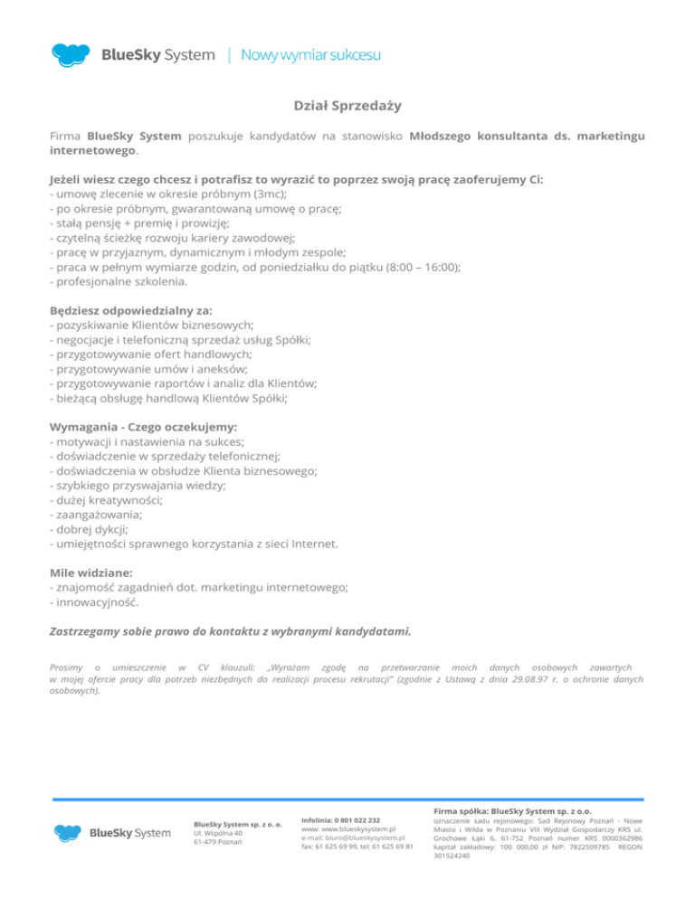 Dział Sprzedaży Firma BlueSky System poszukuje kandydatów na stanowisko Młodszego konsultanta ds. marketingu internetowego. Jeżeli wiesz czego chcesz i potrafisz to wyrazić to poprzez swoją pracę zaoferujemy Ci: - umowę zlecenie w okresie próbnym (3mc); - po okresie próbnym, gwarantowaną umowę o pracę; - stałą pensję + premię i prowizję; - czytelną ścieżkę rozwoju kariery zawodowej; - pracę w przyjaznym, dynamicznym i młodym zespole; - praca w pełnym wymiarze godzin, od poniedziałku do piątku (8:00 – 16:00); - profesjonalne szkolenia. Będziesz odpowiedzialny za: - pozyskiwanie Klientów biznesowych; - negocjacje i telefoniczną sprzedaż usług Spółki; - przygotowywanie ofert handlowych; - przygotowywanie umów i aneksów; - przygotowywanie raportów i analiz dla Klientów; - bieżącą obsługę handlową Klientów Spółki; Wymagania - Czego oczekujemy: - motywacji i nastawienia na sukces; - doświadczenie w sprzedaży telefonicznej; - doświadczenia w obsłudze Klienta biznesowego; - szybkiego przyswajania wiedzy; - dużej kreatywności; - zaangażowania; - dobrej dykcji; - umiejętności sprawnego korzystania z sieci Internet. Mile widziane: - znajomość zagadnień dot. marketingu internetowego; - innowacyjność. Zastrzegamy sobie prawo do kontaktu z wybranymi kandydatami. Prosimy o umieszczenie w CV klauzuli: „Wyrażam zgodę na przetwarzanie moich danych osobowych zawartych w mojej ofercie pracy dla potrzeb niezbędnych do realizacji procesu rekrutacji” (zgodnie z Ustawą z dnia 29.08.97 r. o ochronie danych osobowych). BlueSky System sp. z o. o. Ul. Wspólna 40 61-479 Poznań Infolinia: 0 801 022 232 www: www.blueskysystem.pl e-mail: [email protected] fax: 61 625 69 99, tel: 61 625 69 81 Firma spółka: BlueSky System sp. z o.o. oznaczenie sadu rejonowego: Sad Rejonowy Poznań - Nowe Miasto i Wilda w Poznaniu VIII Wydział Gospodarczy KRS ul. Grochowe Łąki 6, 61-752 Poznań numer KRS 0000362986 kapitał zakładowy: 100 000,00 zł NIP: 7822509785 REGON 301524240