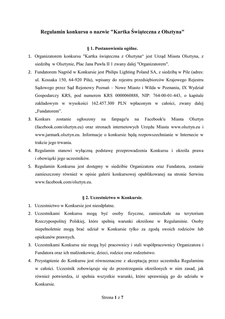 Regulamin konkursu o nazwie "Kartka Świąteczna z Olsztyna" § 1. Postanowienia ogólne. 1. Organizatorem konkursu "Kartka świąteczna z Olsztyna“ jest Urząd Miasta Olsztyna, z siedzibą w Olsztynie, Plac Jana Pawła II 1 zwany dalej "Organizatorem". 2. Fundatorem Nagród w Konkursie jest Philips Lighting Poland SA, z siedzibą w Pile (adres: ul. Kossaka 150, 64-920 Piła), wpisany do rejestru przedsiębiorców Krajowego Rejestru Sądowego przez Sąd Rejonowy Poznań – Nowe Miasto i Wilda w Poznaniu, IX Wydział Gospodarczy KRS, pod numerem KRS 0000060888, NIP: 764-00-01-443, o kapitale zakładowym w wysokości 162.457.300 PLN wpłaconym w całości, zwany dalej „Fundatorem”. 3. Konkurs zostanie ogłoszony na fanpage'u na Facebook'u Miasta Olsztyn (facebook.com/olsztyn.eu) oraz stronach internetowych Urzędu Miasta www.olsztyn.eu i www.jarmark.olsztyn.eu. Informacje o konkursie będą rozpowszechnianie w Internecie w trakcie jego trwania. 4. Regulamin stanowi wyłączną podstawę przeprowadzenia Konkursu i określa prawa i obowiązki jego uczestników. 5. Regulamin Konkursu jest dostępny w siedzibie Organizatora oraz Fundatora, zostanie zamieszczony również w opisie galerii konkursowej opublikowanej na stronie Serwisu www.facebook.com/olsztyn.eu. § 2. Uczestnictwo w Konkursie. 1. Uczestnictwo w Konkursie jest nieodpłatne. 2. Uczestnikami Konkursu mogą być osoby fizyczne, zamieszkałe na terytorium Rzeczypospolitej Polskiej, które spełnią warunki określone w Regulaminie. Osoby niepełnoletnie mogą brać udział w Konkursie tylko za zgodą swoich rodziców lub opiekunów prawnych. 3. Uczestnikami Konkursu nie mogą być pracownicy i stali współpracownicy Organizatora i Fundatora oraz ich małżonkowie, dzieci, rodzice oraz rodzeństwo. 4. Przystąpienie do Konkursu jest równoznaczne z akceptacją przez uczestnika Regulaminu w całości. Uczestnik zobowiązuje się do przestrzegania określonych w nim zasad, jak również potwierdza, iż spełnia wszystkie warunki, które uprawniają go do udziału w Konkursie. Strona 1 z 7 5. Uczestnictwa w Konkursie, jak i praw i obowiązków z nimi związanych, w tym także prawa do żądania wydania nagrody, nie można przenosić na inne osoby. §3. Warunki udziału i przebieg konkursu. 1. Konkurs trwa od momentu jego ogłoszenia na fanpage'u na FB Urzędu Miasta Olsztyna o godz. 10.00 we wtorek 09.12.2014 roku do momentu publicznego ogłoszenia listy zwycięzców. Zgłaszania prac konkursowych można dokonywać od 09.12.2014 roku od godz. 10:00 do 13.12.2014 roku do godziny 18:30 zgodnie ze sposobem opisanym w §3 pkt. 2. 2. Aby zostać Uczestnikiem Konkursu należy w terminie od dnia 09.12.2014 od godz. 10:00 do dnia 13.12.2014 do godz. 18:30 przygotować kartkę świąteczną z Olsztyna w formie grafiki lub zdjęcia ukazującą Olsztyn w świątecznym klimacie. Zgłoszone zdjęcia mogą być wykonane np. podczas Warmińskiego Jarmarku Świątecznego. 3. Przygotowaną kartkę należy wysłać na adres email: [email protected]. Przy zgłoszeniu (wysyłaniu pracy konkursowej) w treści maila musi być podana formuła: "Oświadczam, że zapoznałem/-am się z postanowieniami regulaminu konkursu "Kartka Świąteczna z Olsztyna" organizowanego przez Urząd Miasta Olsztyna i akceptuję bez zastrzeżeń jego treść" podpisana imieniem i nazwiskiem autora pracy konkursowej. Załącznik dołączony do wiadomości email nie może przekraczać 15 MB. Uczestnik może wysłać kilka wiadomości email. 4. Dłuższy bok przesłanej grafiki/zdjęcia musi być co najmniej w wymiarze 1920px. 5. Podczas trwania Jarmarku zgłoszone kartki będą codziennie wyświetlane przy użyciu projektora na wybranych elewacjach budynków na Starym Mieście w Olsztynie. 6. Zwycięskie zdjęcia zostaną oznaczone specjalnymi znacznikami i będą wyświetlone na elewacjach w ostatni dzień trwania Jarmarku 14.12.2014r. Dokładna godzina wyświetlenia zwycięskich prac zostanie podana na fanpage'u na Facebook'u Urzędu Miasta Olsztyna. 7. Każdy uczestnik może zgłosić do udziału w Konkursie dowolną ilość utworów graficzno/fotograficznych. 8. Uczestnik Konkursu - w odniesieniu do zgłoszonego utworu graficzno/fotograficznego oświadcza, że: przedstawiony przez Uczestnika utwór jest dziełem oryginalnym, wykonanym w Olsztynie, a Uczestnik ma do niego pełne i wyłączne prawa autorskie, nie jest obciążony jakimikolwiek prawami osób trzecich, nie narusza jakichkolwiek praw osób trzecich, ani obowiązujących przepisów prawa, a Uczestnik Konkursu jest uprawniony do wyrażenia zgód i zezwoleń, o których mowa w pkt. od 8a) do 9. Strona 2 z 7 9. Uczestnik konkursu oświadcza, że udziela Organizatorowi i Fundatorowi licencji na wykorzystanie zdjęć do celów przeprowadzenia konkursu, jego promocji i stworzenia dokumentacji jego przeprowadzenia, w tym umieszczenia wykonanych zdjęć/grafik w galerii prac konkursowych na fanpage'ach oraz stronach internetowych Organizatora i Fundatora oraz wyświetlenia zdjęć/grafik za pomocą rzutnika na elewacjach budynków w czasie Warmińskiego Jarmarku Świątecznego w Olsztynie. 10. Uczestnik konkursu oświadcza, że w przypadku otrzymania I, II lub III miejsca w konkursie, przenosi na rzecz Organizatora autorskie prawa zależne i majątkowe do zdjęć, o których mowa w §3 pkt. 2 na następujących polach eksploatacji: a) w zakresie utrwalania i zwielokrotniania zdjęć, ich części albo fragmentów wytwarzanie określoną techniką, ich części albo fragmentów, w tym techniką drukarską, reprograficzną, zapisu magnetycznego oraz techniką cyfrową, kopiowania, utrwalenia i zwielokrotnienia wszelkimi znanymi technikami, w tym cyfrowymi, elektronicznymi, wszelkimi technikami video, technikami poligraficznymi, a także w zakresie: • zwielokrotniania, utrwalania, wykorzystania w wydawnictwach promocyjnych; • zwielokrotniania, utrwalania, wykorzystania w telewizji; • zwielokrotniania i wykorzystania