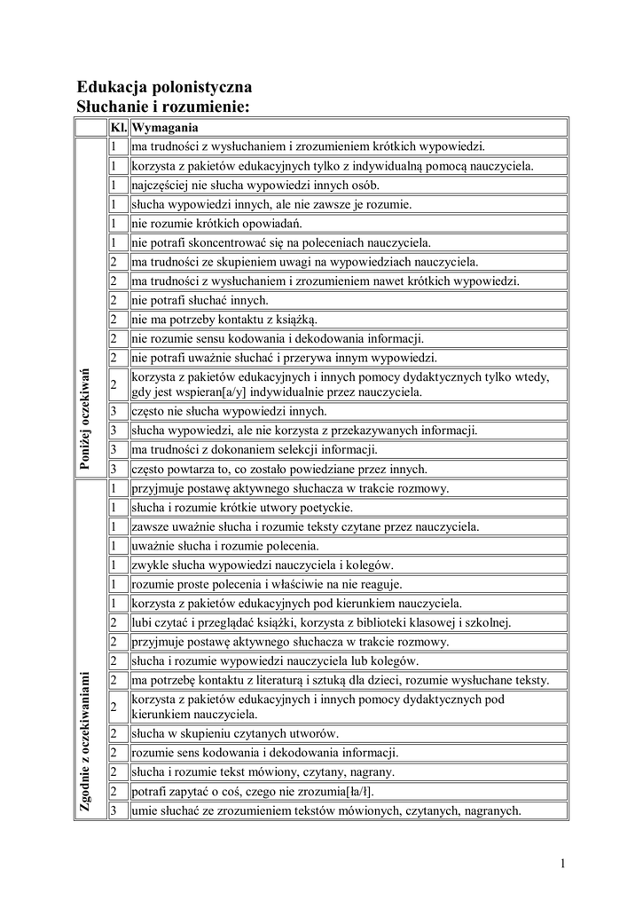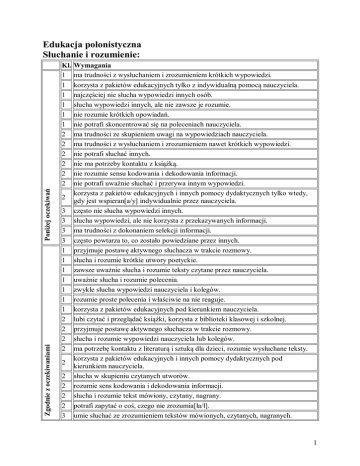 Edukacja polonistyczna Słuchanie i rozumienie: Zgodnie z oczekiwaniami Poniżej oczekiwań Kl. 1 1 1 1 1 1 2 2 2 2 2 2 2 3 3 3 3 1 1 1 1 1 1 1 2 2 2 2 2 2 2 2 2 3 Wymagania ma trudności z wysłuchaniem i zrozumieniem krótkich wypowiedzi. korzysta z pakietów edukacyjnych tylko z indywidualną pomocą nauczyciela. najczęściej nie słucha wypowiedzi innych osób. słucha wypowiedzi innych, ale nie zawsze je rozumie. nie rozumie krótkich opowiadań. nie potrafi skoncentrować się na poleceniach nauczyciela. ma trudności ze skupieniem uwagi na wypowiedziach nauczyciela. ma trudności z wysłuchaniem i zrozumieniem nawet krótkich wypowiedzi. nie potrafi słuchać innych. nie ma potrzeby kontaktu z książką. nie rozumie sensu kodowania i dekodowania informacji. nie potrafi uważnie słuchać i przerywa innym wypowiedzi. korzysta z pakietów edukacyjnych i innych pomocy dydaktycznych tylko wtedy, gdy jest wspieran[a/y] indywidualnie przez nauczyciela. często nie słucha wypowiedzi innych. słucha wypowiedzi, ale nie korzysta z przekazywanych informacji. ma trudności z dokonaniem selekcji informacji. często powtarza to, co zostało powiedziane przez innych. przyjmuje postawę aktywnego słuchacza w trakcie rozmowy. słucha i rozumie krótkie utwory poetyckie. zawsze uważnie słucha i rozumie teksty czytane przez nauczyciela. uważnie słucha i rozumie polecenia. zwykle słucha wypowiedzi nauczyciela i kolegów. rozumie proste polecenia i właściwie na nie reaguje. korzysta z pakietów edukacyjnych pod kierunkiem nauczyciela. lubi czytać i przeglądać książki, korzysta z biblioteki klasowej i szkolnej. przyjmuje postawę aktywnego słuchacza w trakcie rozmowy. słucha i rozumie wypowiedzi nauczyciela lub kolegów. ma potrzebę kontaktu z literaturą i sztuką dla dzieci, rozumie wysłuchane teksty. korzysta z pakietów edukacyjnych i innych pomocy dydaktycznych pod kierunkiem nauczyciela. słucha w skupieniu czytanych utworów. rozumie sens kodowania i dekodowania informacji. słucha i rozumie tekst mówiony, czytany, nagrany. potrafi zapytać o coś, czego nie zrozumia[ła/ł]. umie słuchać ze zrozumieniem tekstów mówionych, czytanych, nagranych. 1 3 Powyżej oczekiwań 3 3 3 3 3 1 1 1 1 2 2 3 3 nie przerywa wypowiedzi innych. zawsze słucha innych, śledzi treść wypowiedzi w celu uniknięcia powtarzania tego, co już zostało powiedziane. uważnie słucha wypowiedzi i korzysta z przekazywanych informacji. przyjmuje postawę aktywnego słuchacza w trakcie rozmowy. wyciąga z przeczytanych tekstów wnioski. zawsze słucha wypowiedzi innych i buduje własne. samodzielnie korzysta z pakietów edukacyjnych. rozumie złożone polecenia i właściwie na nie reaguje. słucha i chętnie buduje odpowiedzi. łatwo zapamiętuje słyszane wypowiedzi. ma zainteresowania czytelnicze. potrafi skupiać się na wypowiedziach innych i buduje własne wypowiedzi. zawsze słucha wypowiedzi innych, potrafi je ocenić i zapamiętać najważniejsze informacje. dokonuje selekcji informacji. Formy wypowiedzi: 1 1 1 1 1 Poniżej oczekiwań 1 2 2 2 2 2 2 3 3 3 3 3 wypowiada się niechętnie. nie potrafi wygłosić wiersza z pamięci. nie potrafi omówić pojedynczego obrazka. Na pytania nauczyciela odpowiada pojedynczymi słowami. ma trudności z konstruowaniem pytań i odpowiedzi. ma trudności z odtwarzaniem z pamięci krótkich wierszy, piosenek i fragmentów prozy. Wypowiedzi są niespójne logicznie. wypowiada się niechętnie, zazwyczaj wyrazami. wypowiada się niezgodnie z tematem. wypowiada się pojedynczymi wyrazami. nie uczestniczy w rozmowach na tematy związane z życiem rodzinnym i szkolnym. wypowiada się niechętnie. ma trudności z doborem właściwej formy wypowiedzi do różnych sytuacji społecznych. potrzebuje wielu zachęt do wypowiedzi. ma trudności w opisywaniu przedmiotów. ma trudności z samodzielnymi wypowiedziami w formie opowiadania i opisu. nie potrafi złożyć życzeń z okazji urodzin i imienin. wypowiada się niechętnie na temat przeczytanego tekstu. 3 2 1 1 1 1 1 1 1 Zgodnie z oczekiwaniami 2 2 2 2 2 2 2 3 3 3 3 3 3 3 3 Powyżej oczekiwań 3 3 3 1 1 1 2 2 mówi niezbyt głośno, dostosowując ton głosu do sytuacji. opowiada o swoich przeżyciach, gdy zostanie zachęcon[a/y] lub zapytan[a/y] przez nauczyciela. wygłasza z pamięci krótkie wiersze, piosenki i fragmenty prozy. uczestniczy w rozmowach na tematy związane z życiem rodzinnym i szkolnym, także inspirowane literaturą. zadaje pytania i odpowiada na pytania innych osób. wyraża swoje myśli i potrzeby. wypowiada się na temat treści tekstu, własnych przeżyć i otaczającej rzeczywistości. potrafi omówić etapy i efekty własnego działania. mówi niezbyt głośno, dostosowując ton głosu do sytuacji. wypowiada się na temat treści tekstu, własnych przeżyć i otaczającej rzeczywistości. jasno wyraża swoje myśli i potrzeby. chętnie opowiada o swoich przeżyciach i doświadczeniach. uczestniczy w rozmowach na tematy związane z życiem rodzinnym i szkolnym. zadaje pytania i udziela poprawnych odpowiedzi na pytania innych osób. dobiera właściwe formy komunikowania się w różnych sytuacjach społecznych. umiejętnie reguluje natężenie i silę głosu. jasno i komunikatywnie wyraża swoje myśli i potrzeby. chętnie dzieli się wrażeniami na temat przeczytanej lektury lub oglądanego spektaklu. tworzy w formie ustnej krótkie opowiadanie i opis, list prywatny, życzenia, zaproszenie. opisuje przedmioty, osoby i zjawiska, ujmując najważniejsze ich cechy. potrafi odtworzyć treść tekstu po jednorazowym przeczytaniu i zwięźle go opowiedzieć. wypowiada się na temat treści tekstu, własnych przeżyć i otaczającej rzeczywistości. wypowiada się spontanicznie, swobodnie i logicznie na określony temat. posługuje się różnymi formami wypowiedzi. buduje kilkuzdaniowe spójne wypowiedzi. z własnej inicjatywy wypowiada się na temat własnych przeżyć, ilustracji i utworów lit