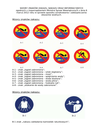 WZORY ZNAKÓW ZAKAZU, NAKAZU ORAZ INFORMACYJNYCH zgodnych z rozporządzeniem Ministra Spraw Wewnętrznych z dnia 6 marca 2012 roku w sprawie sposobu oznakowania i zabezpieczania obszarów wodnych. Wzory znaków zakazu: A-1 A-2 A-3 A-4 A-5 A-6 A-7 A-8 – – – – – – – – znak znak znak znak znak znak znak znak „kąpiel zabroniona”; „kąpiel zabroniona – szlak żeglowny”; „kąpiel zabroniona – most”; „kąpiel zabroniona – spiętrzenie wody”; „kąpiel zabroniona – woda skażona”; „kąpiel zabroniona – woda pitna”; „kąpiel zabroniona – hodowla ryb”; „skakanie do wody zabronione”. Wzory znaków nakazu: B-1 znak „nakazu zakładania kamizelek ratunkowych”; B-2 znak „nakazu ustawicznego nadzoru nad dziećmi”. Wzory znaków informacyjnych: C-1 – znak „wiry”; C-2 – znak niebezpieczna głębokość wody”; C-3 – znak „nagły uskok”; C-4 – znak „pale” C-5 – znak „skały podwodne”; C-6 – znak kamieniste dno”; C-7 – znak „sieci rybackie”; C-8 – znak „wodorosty”; C-9 – znak „zimna woda”; C-10 – znak „plaża strzeżona”; C-11 – znak „punkt medyczny”; C-12 – znak „telefon”.