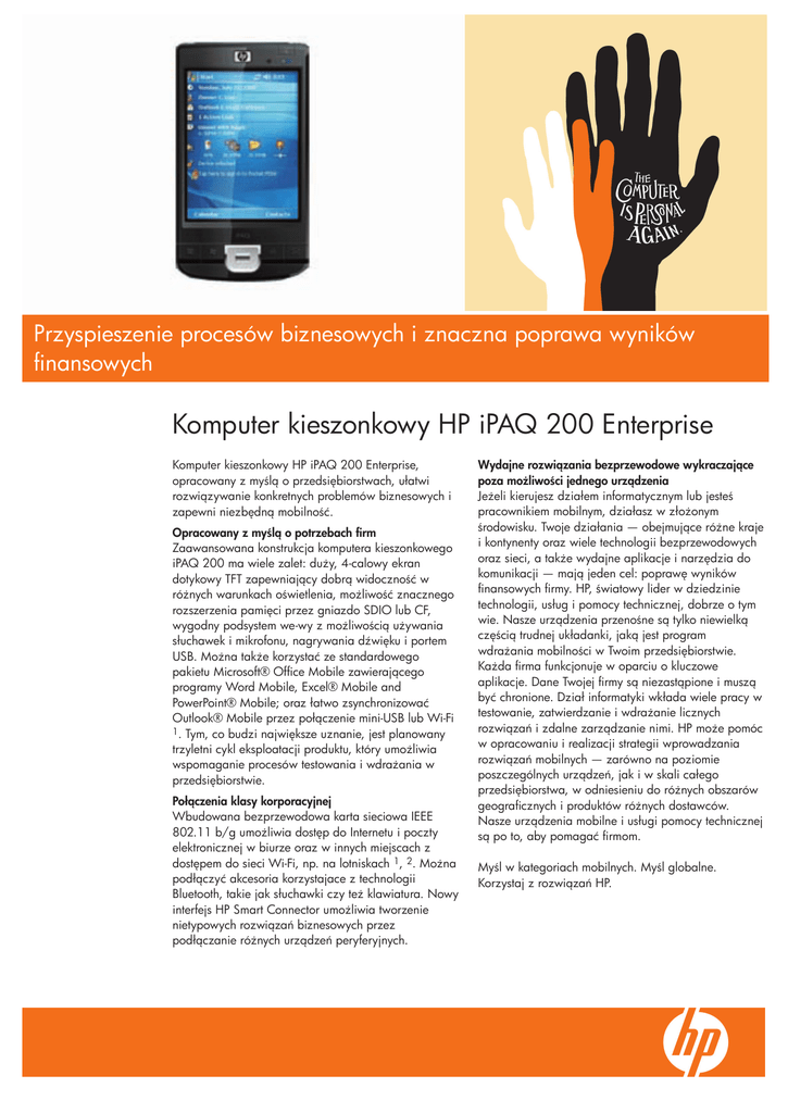 Przyspieszenie procesów biznesowych i znaczna poprawa wyników finansowych Komputer kieszonkowy HP iPAQ 200 Enterprise Komputer kieszonkowy HP iPAQ 200 Enterprise, opracowany z myślą o przedsiębiorstwach, ułatwi rozwiązywanie konkretnych problemów biznesowych i zapewni niezbędną mobilność. Opracowany z myślą o potrzebach firm Zaawansowana konstrukcja komputera kieszonkowego iPAQ 200 ma wiele zalet: duży, 4-calowy ekran dotykowy TFT zapewniający dobrą widoczność w różnych warunkach oświetlenia, możliwość znacznego rozszerzenia pamięci przez gniazdo SDIO lub CF, wygodny podsystem we-wy z możliwością używania słuchawek i mikrofonu, nagrywania dźwięku i portem USB. Można także korzystać ze standardowego pakietu Microsoft® Office Mobile zawierającego programy Word Mobile, Excel® Mobile and PowerPoint® Mobile; oraz łatwo zsynchronizować Outlook® Mobile przez połączenie mini-USB lub Wi-Fi 1. Tym, co budzi największe uznanie, jest planowany trzyletni cykl eksploatacji produktu, który umożliwia wspomaganie procesów testowania i wdrażania w przedsiębiorstwie. Połączenia klasy korporacyjnej Wbudowana bezprzewodowa karta sieciowa IEEE 802.11 b/g umożliwia dostęp do Internetu i poczty elektronicznej w biurze oraz w innych miejscach z dostępem do sieci Wi-Fi, np. na lotniskach 1, 2. Można podłączyć akcesoria korzystajace z technologii Bluetooth, takie jak słuchawki czy też klawiatura. Nowy interfejs HP Smart Connector umożliwia tworzenie nietypowych rozwiązań biznesowych przez podłączanie różnych urządzeń peryferyjnych. Wydajne rozwiązania bezprzewodowe wykraczające poza możliwości jednego urządzenia Jeżeli kierujesz działem informatycznym lub jesteś pracownikiem mobilnym, działasz w złożonym środowisku. Twoje działania — obejmujące różne kraje i kontynenty oraz wiele technologii bezprzewodowych oraz sieci, a także wydajne aplikacje i narzędzia do komunikacji — mają jeden cel: poprawę wyników finansowych firmy. HP, światowy lider w dziedzinie technologii, usług i pomocy technicznej, dobrze o tym wie. Nasze urządzenia przenośne są tylko niewielką częścią trudnej układanki, jaką jest program wdrażania mobilności w Twoim przedsiębiorstwie. Każda firma funkcjonuje w oparciu o kluczowe aplikacje. Dane Twojej firmy są niezastąpione i muszą być chronione. Dział informatyki wkłada wiele pracy w testowanie, zatwierdzanie i wdrażanie licznych rozwiązań i zdalne zarządzanie nimi. HP może pomóc w opracowaniu i realizacji strategii wprowadzania rozwiązań mobilnych — zarówno na poziomie poszczególnych urządzeń, jak i w skali całego przedsiębiorstwa, w odniesieniu do różnych obszarów geograficznych i produktów różnych dostawców. Nasze urządzenia mobilne i usługi pomocy technicznej są po to, aby pomagać firmom. Myśl w kategoriach mobilnych. Myśl globalne. Korzystaj z rozwiązań HP. Komputer kieszonkowy HP iPAQ 200 Enterprise System operacyjny Windows Mobile® 6 Classic Procesor Procesor Marvell PXA310 624 MHz Pamięć 128 MB pamięci SDRAM do uruchamiania aplikacji, 256 MB pamięci flash ROM Oprogramowanie Outlook® Mobile (kalendarz, kontakty, wiadomości, zadania), Office Mobile (Word Mobile, Excel® Mobile, Powerpoint® Mobile), Internet Explorer® Mobile, Windows Media® Player 10 Mobile, gry, kalkulator, dyktafon, File Manager, MSN Messenger Aplikacje oferowane wyłącznie przez HP: HP iPAQ Help and Support, HP iPAQ QuickStart Tour, HP iPAQ Setup Assistant, Certificate Enroller, Asset Viewer, iPAQ Wireless Manager, HP Photosmart Mobile, Bluetooth® Manager, Today Panel Lite, HP Enterprise Mobility Agent, HP Mobile Print Wymiary (sz. x gł. x wys.) 7,6 x 1,6 x 12,6 cm Waga 192 g Wyświetlacz Ekran dotykowy pochłaniający zewnętrzne światło (transflective) TFT 4,0", 260 tys. kolorów, 640 x 480 pikseli, podświetlanie LED Wbudowana karta sieci bezprzewodowej Wbudowane interfejsy WLAN 802.11b/g, Bluetooth® 2.0 i EDR Gniazda rozszerzeń Gniazdo na kartę pamięci SDIO i CF Multimedia Oprogramowanie HP Photosmart Mobile, Windows Media Player 10 Mobile Zasilanie Akumulator: wymienny akumulator litowy o pojemności 2200 mAh (wymieniany przez użytkownika) Zasilanie sieciowe – napięcie wejściowe: 100~240 V, 50/60 Hz, natężenie wejściowe: maks. 0,5 A, napięcie wyjściowe: prąd stały 5,2 V (typowe), natężenie wyjściowe: 2 A (typowe) Urządzenie wskazujące Ekran dotykowy i rysik Karta dźwiękowa Wbudowany mikrofon, odbiornik, dwa głośniki i jedno gniazdo słuchawek stereo 3,5 mm (4-stykowe) Gwarancja 1 rok serwisu z odbiorem i odesłaniem do klienta, 90 dni pomocy technicznej dla oprogramowania, warunki mogą zależeć od regionu Zawartość opakowania Wymienny akumulator litowy 2200 mAh, zasilacz z kablem (1,83 m), przewód Smart Connector do synchronizacji i ładowania, rysik, futerał, dysk CD HP iPAQ Companion, pakiet dokumentacji Właściwości konstrukcyjne 9-kierunkowa nawigacja uaktywniana jednym naciśnięciem przycisku, 4 przyciski programowalne, dyktafon, przycisk zasilania, przycisk resetowania Bezpieczeństwo HP Enterprise Mobility Agent 1 Warunkiem korzystania z komunikacji bezprzewodowej może być dostęp do standardowej infrastruktury WLAN (Wi-Fi) oraz innych urządzeń Bluetooth, posiadanie oddzielnie zakupionego sprzętu i zawarcie umowy z operatorem sieci bezprzewodowych. Bezprzewodowe korzystanie z Internetu wymaga zawarcia oddzielnej umowy o świadczeniu usługi. Informacje o zasięgu sieci bezprzewodowych na danym obszarze można uzyskać u operatora. Niektóre treści internetowe mogą być niedostępne 2 Wymaga punktów dostępu bezprzewodowego, które nie wchodzą w skład zestawu. Możliwość korzystania z publicznych bezprzewodowych punktów dostępowych jest ograniczona. Bezprzewodowe korzystanie z Internetu wymaga zawarcia oddzielnej umowy o świadczenie usług internetowych. © Copyright 2007 Hewlett-Packard Development Compan