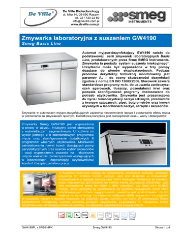De Ville Biotechnology ul. Miła 14, 05-090 Raszyn tel. 22 / 720 22 59 [email protected] www.deville.com.pl Zmywarka laboratoryjna z suszeniem GW4190 Smeg Basic Line Automat myjąco-dezynfekujący GW4190 należy do podstawowej serii zmywarek laboratoryjnych Basic Line, produkowanych przez firmę SMEG Instruments. Zmywarka ta posiada system suszenia iniekcyjnego*. Urządzenie może być wyposażone w trzy pompy dozujące do płynów eksploatacyjnych. Podczas procesów dezynfekcji termicznej monitorowany jest parametr A0 – do oceny skuteczności dezynfekcji zgodnie z normą EN ISO 15883:2006. Sterownik zawiera standardowe programy m.in. do usuwania zanieczyszczeń agarowych, tłuszczy, pozostałości krwi oraz pozwala skonfigurować programy dostosowane do potrzeb użytkownika. Zmywarka jest przeznaczona do mycia i termodezynfekcji naczyń szklanych, przedmiotów z tworzyw sztucznych, pipet, butyrometrów oraz innych używanych w laboratoriach naczyń, narzędzi i akcesoriów. Zmywanie w automatach myjąco-dezynfekujących zapewnia nieporównanie lepsze i powtarzalne efekty mycia w porównaniu ze zmywaniem ręcznym. Dodatkową korzyścią jest oszczędność czasu, wody i detergentów. Zmywarka Smeg GW4190 jest wyposażona w prosty w użyciu, intuicyjny panel sterowania z wyświetlaczem segmentowym. Umożliwia on wybór jednego z 9 standardowych programów mycia oraz skonfigurowanie dodatkowych 6 programów własnych użytkownika. Możliwość zainstalowania nawet trzech dozujących pomp perystaltycznych oraz szeroki wybór akcesoriów i opcji wyposażenia pozwala na skuteczne umycie większości zanieczyszczeń występujących w laboratoriach, zapewniając użytkownikowi komfort i bezpieczeństwo pracy. *) Suszenie iniekcyjne polega na dostarczaniu strumienia suchego, gorącego powietrza do wnętrza mytych naczyń. Jest ono dostępne w zmywarkach wyposażonych w agregat suszący oraz wózki iniekcyjne. Powietrze po przejściu przez nagrzewnicę jest tłoczone do komory mycia za pomoca dmuchawy. Jest ono oczyszczane przez filtr klasy C 98% (standard) lub klasy H13 99,95% (opcja). Jeżeli naczynia są umieszczone na dyszach iniekcyjnych, przez które wtryskiwany jest roztwór myjący i woda, powietrze jest wdmuchiwane do ich wnętrza tą sama drogą, co zapewnia najlepsze efekty suszenia – szczególnie w przypadku naczyń o wąskich otworach, jak próbówki, pipety, cylindry, czy kolby. W zmywarkach Smeg zastosowano inteligentny system suszenia gorącym powietrzem, wyposażony w niezależną sondę temperaturową, kontrolującą działanie systemu, co zapewnia optymalizację zużycia energii. GW4190PL v.07/2014PK Smeg GW4190 Strona 1 z 4 GW4190 – konstrukcja i parametry techniczne Programowanie i kontrola procesu mycia max. temperatura w komorze zmywania 95°C max. ilość wszystkich programów mycia 15 - w tym ilość programów własnych użytkownika 6 max. ilość faz mycia w jednym cyklu 6 parametry, które można ustawić dla danej fazy mycia rodzaj/ilość wody (ciepła, zimna, demineralizowana), rodzaj/ilość detergentu/płynu eksploatacyjnego, temperatura, czas ekspozycji w danej temperaturze sterowanie i kontrola mikroprocesor panel sterowania i wyświetlacz LED-owy wyświetlacz segmentowy (4 znaki + podświetlane ikony), klawiatura membranowa zabezpieczona folią przed wilgocią System dozowania detergentów i płynów eksploatacyjnych dozownik detergentu proszkowego TAK (tylko w wersji GW4190 i GW4190C) max. ilość pomp perystaltycznych 3 możliwość mycia zanieczyszczeń petrochemicznych z użyciem sody kaustycznej i środka zapobiegającego powstawaniu piany TAK schowek na pojemniki z płynami eksploatacyjnymi TAK (w szafce bocznej) wydajność pompy głównej 400 l/min filtrowanie roztworu myjącego 4-stopniowe regulacja ciśnienia górny/dolny poziom mycia TAK System suszenia termodynamiczne NIE strumieniem gorącego powietrza TAK kondensator pary TAK (wersja GW4190C i GW4190SC) funkcja automatycznego otwierania drzwi po procesie TAK Zasilanie wodą możliwość zasilania wodą zimną TAK możliwość zasilania wodą ciepłą NIE możliwość zasilania wodą demineralizowaną pod ciśnieniem TAK możliwość zasilania wodą demi ze zbiornika nieciśnieniowego opcja (dodatkowa pompa PAD) wbudowany zmiękczacz wody TAK czujnik poziomu soli do regeneracji złoża zmiękczacza TAK max. ilość ramion spryskujących w komorze 3 Kontrola i archiwizacja procesu sonda temperatury w komorze mycia PT100 klasy B IEC 60751 wyjście szeregowe na komputer TAK wyjście szeregowe na drukarkę TAK drukarka opcja dodatkowa kalendarz i zegar TAK kontrola parametru A0 (odczyt na wyświetlaczu + wydruk) TAK Inne parametry max. głośność < 50 dB waga urządzenia bez wyposażenia dodatkowego 83 kg wymiary zewnętrzne (szer. x głęb. x wys.) 900 x 605 x 850 mm (830 mm - wersja do zabudowy) wymiary wewnętrzne (szer. x głeb. x wys.) 520 x 515 x 545 mm pojemność komory mycia 150 l ilość poziomów mycia 1 lub 2 komora mycia: stal nierdzewna AISI 316L obudowa: stal nierdzewna AISI 304 ~3/N/PE 400 V 50 Hz 7,0 kW (standard) ~1/N/PE 230 V 50 Hz 2,8 kW (tylko GW4190x1) materiał zasilanie elektryczne GW4190PL v.07/2014PK Smeg GW4190 Strona 2 z 4 Wersje modelu GW4190, opcje dodatkowe i inne akcesoria nr katalogowy GW4190 zdjęcie opis Wersja podstawowa: z dozownikiem detergentu proszkowego i jedną pompą perystaltyczną (do neutralizatora). GW4190C Jak GW4190 + kondensator pary. GW4190S Wersja z dwoma dozującymi pompami perystaltycznymi (do detergentu płynnego i neutralizatora). GW4190SC Jak GW4190S + kondensator pary. GW4190x1 Wersja do zasilania 1-fazowego ~230 V. PAD1 Pompa umożliwiająca pobieranie wody demineralizowanej z nieciśnieniowego zbiornika ustawionego powyżej poziomu blatu zmywarki. PAD2 Pompa umożliwiająca pobieranie wody demineralizowanej z nieciśnieniowego zbiornika ustawionego poniżej poziomu blatu zmywarki (na podłodze); wymaga zainstalowania dodatkowego przeka