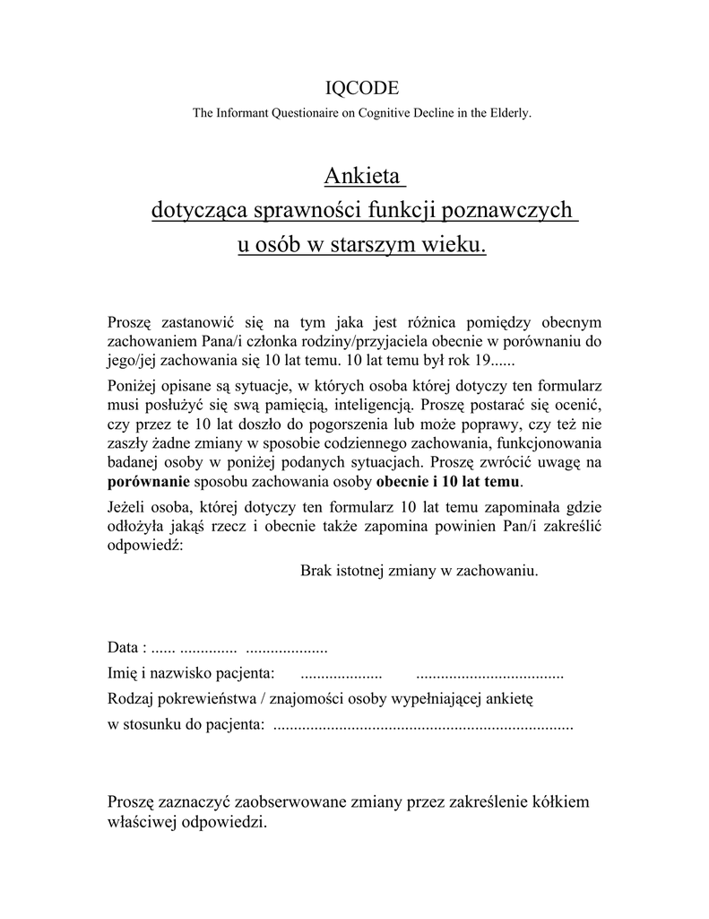 IQCODE The Informant Questionaire on Cognitive Decline in the Elderly. Ankieta dotycząca sprawności funkcji poznawczych u osób w starszym wieku. Proszę zastanowić się na tym jaka jest różnica pomiędzy obecnym zachowaniem Pana/i członka rodziny/przyjaciela obecnie w porównaniu do jego/jej zachowania się 10 lat temu. 10 lat temu był rok 19...... Poniżej opisane są sytuacje, w których osoba której dotyczy ten formularz musi posłużyć się swą pamięcią, inteligencją. Proszę postarać się ocenić, czy przez te 10 lat doszło do pogorszenia lub może poprawy, czy też nie zaszły żadne zmiany w sposobie codziennego zachowania, funkcjonowania badanej osoby w poniżej podanych sytuacjach. Proszę zwrócić uwagę na porównanie sposobu zachowania osoby obecnie i 10 lat temu. Jeżeli osoba, której dotyczy ten formularz 10 lat temu zapominała gdzie odłożyła jakąś rzecz i obecnie także zapomina powinien Pan/i zakreślić odpowiedź: Brak istotnej zmiany w zachowaniu. Data : ...... .............. .................... Imię i nazwisko pacjenta: .................... .................................... Rodzaj pokrewieństwa / znajomości osoby wypełniającej ankietę w stosunku do pacjenta: ......................................................................... Proszę zaznaczyć zaobserwowane zmiany przez zakreślenie kółkiem właściwej odpowiedzi. W porównaniu do 10 lat wstecz osoba, której dotyczy ten formularz: 1. Rozpoznaje twarze osób z rodziny i przyjaciół. 2. Pamięta imiona osób z rodziny i przyjaciół. 3. Pamięta rzeczy dotyczące rodziny i przyjaciół (np. zawód, dzień urodzin, adresy). 4. Pamięta rzeczy które miały niedawno miejsce. 1 2 znaczna lekka poprawa poprawa znaczna lekka poprawa poprawa znaczna lekka poprawa poprawa znaczna lekka poprawa poprawa 3 brak istotnych zmian brak istotnych zmian brak istotnych zmian 4 lekkie pogorszenie 5 znaczne pogorszenie lekkie pogorszenie znaczne pogorszenie lekkie pogorszenie znaczne pogorszenie lekkie pogorszenie znaczne pogorszenie lekkie pogorszenie znaczne pogorszenie brak istotnych zmian brak istotnych zmian brak istotnych zmian lekkie pogorszenie znaczne pogorszenie lekkie pogorszenie znaczne pogorszenie lekkie pogorszenie znaczne pogorszenie brak istotnych zmian brak istotnych zmian 5. Potrafi odtworzyć rozmowę sprzed kilku dni. znaczna lekka poprawa poprawa 6. Zapomina w środku rozmowy co chciał/a powiedzieć. 7. Pamięta swój adres i numer telefonu. znaczna lekka poprawa poprawa 8. Orientuje się jaki jest dzień tygodnia, miesiąc, rok. znaczna lekka poprawa poprawa 9. Pamięta gdzie zazwyczaj trzymane są różne rzeczy. znaczna lekka poprawa poprawa brak istotnych zmian lekkie pogorszenie znaczne pogorszenie 10.Umie przypomnieć sobie gdzie można znaleźć rzeczy odłożone w inne niż zazwyczaj miejsce. 11. Umie przystosować się do zmian w codziennym planie dnia. 12.Umie posługiwać się zmechanizowanym sprzętem gospodarstwa domowego. 13. Jest w stanie nauczyć się jak używać nowych przyrządów lub maszyn w gospodarstwie domowym. 14. Posiada ogólną znaczna lekka poprawa poprawa brak istotnych zmian lekkie pogorszenie znaczne pogorszenie znaczna lekka poprawa poprawa brak istotnych zmian brak istotnych zmian lekkie pogorszenie znaczne pogorszenie lekkie pogorszenie znaczne pogorszenie znaczna lekka poprawa poprawa znaczna lekka poprawa poprawa znaczna lekka poprawa poprawa brak istotnych zmian lekkie pogorszenie znaczne pogorszenie znaczna brak lekkie znaczne lekka zdolność uczenia się różnych nowych rzeczy. 15. Pamięta wydarzenia które miały miejsce w jego / jej młodości. poprawa poprawa 16. Pamięta rzeczy których nauczył(a) się w młodości. 17. Rozumie znaczenie rzadko używanych słów. znaczna lekka poprawa poprawa znaczna lekka poprawa poprawa 18. Rozumie artykuły z czasopism lub gazet. znaczna lekka poprawa poprawa 19. Jest zdolny śledzić przebieg akcji w książkach lub serialach telewizyjnych. 20. Daje sobie radę z napisaniem listu do przyjaciela lub w sprawach służbowych. 21.Orientuje się w ważnych wydarzeniach historycznych. 22. Podejmuje decyzje dotyczące codziennych spraw. 23. Umie właściwie gospodarować pieniędzmi na zakupach. 23. Potrafi zajmować się finansami (np. emerytura, renta, załatwienie spraw w banku, na poczcie). 24. Daje sobie radę z innymi problemami życia codziennego (umie określić jak dużo kupić żywności, jak częste są odwiedziny przyjaciół). znaczna lekka poprawa poprawa znaczna lekka poprawa poprawa istotnych zmian brak istotnych zmian pogorszenie pogorszenie lekkie pogorszenie znaczne pogorszenie brak istotnych zmian brak istotnych zmian brak istotnych zmian brak istotnych zmian lekkie pogorszenie znaczne pogorszenie lekkie pogorszenie znaczne pogorszenie lekkie pogorszenie znaczne pogorszenie lekkie pogorszenie znaczne pogorszenie znaczna lekka poprawa poprawa brak istotnych zmian lekkie pogorszenie znaczne pogorszenie znaczna lekka poprawa poprawa brak istotnych zmian brak istotnych zmian brak istotnych zmian brak istotnych zmian lekkie pogorszenie znaczne pogorszenie lekkie pogorszenie znaczne pogorszenie lekkie pogorszenie znaczne pogorszenie lekkie pogorszenie znaczne pogorszenie znaczna lekka poprawa poprawa znaczna lekka poprawa poprawa znaczna lekka poprawa poprawa znaczna lekka poprawa poprawa brak istotnych zmian lekkie pogorszenie znaczne pogorszenie 26.Umie zorientować się, znaczna lekka co się wokół niego / niej poprawa poprawa dzieje, rozumie dlaczego się tak dzieje. brak istotnych zmian lekkie pogorszenie znaczne pogorszenie Tłumaczenie: lek.med. Aleksandra Klimkowicz, Szpital uniwersytecki, Kraków, Polska E-mail: [email protected]