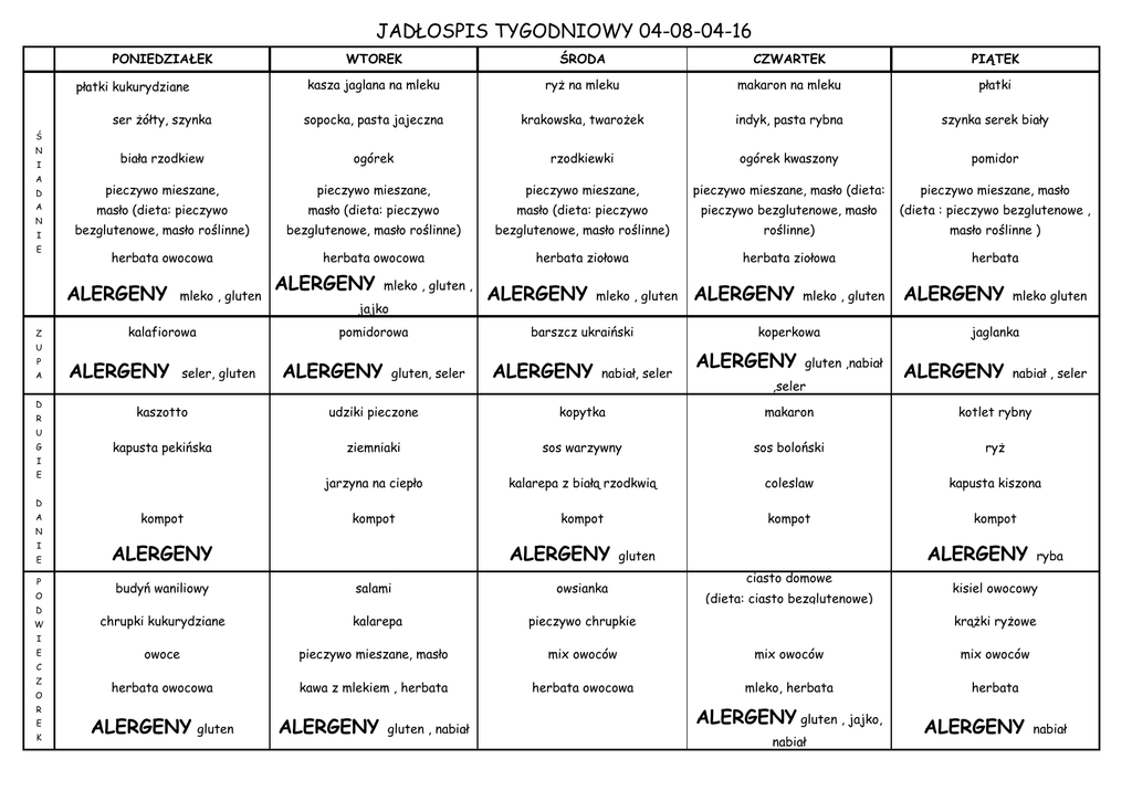 JADŁOSPIS TYGODNIOWY 04-08-04-16 PONIEDZIAŁEK WTOREK ŚRODA CZWARTEK PIĄTEK kasza jaglana na mleku ryż na mleku makaron na mleku płatki ser żółty, szynka sopocka, pasta jajeczna krakowska, twarożek indyk, pasta rybna szynka serek biały biała rzodkiew ogórek rzodkiewki ogórek kwaszony pomidor płatki kukurydziane Ś N I A D pieczywo mieszane, pieczywo mieszane, pieczywo mieszane, pieczywo mieszane, masło (dieta: pieczywo mieszane, masło A masło (dieta: pieczywo masło (dieta: pieczywo masło (dieta: pieczywo pieczywo bezglutenowe, masło (dieta : pieczywo bezglutenowe , bezglutenowe, masło roślinne) bezglutenowe, masło roślinne) bezglutenowe, masło roślinne) roślinne) masło roślinne ) herbata owocowa herbata owocowa herbata ziołowa herbata ziołowa herbata N I E ALERGENY Z mleko , gluten kalafiorowa ALERGENY mleko , gluten , jajko pomidorowa ALERGENY mleko , gluten barszcz ukraiński U P A D R U G I ALERGENY seler, gluten ALERGENY gluten, seler ALERGENY nabiał, seler ALERGENY mleko , gluten koperkowa ALERGENY gluten ,nabiał ,seler ALERGENY mleko gluten jaglanka ALERGENY nabiał , seler kaszotto udziki pieczone kopytka makaron kotlet rybny kapusta pekińska ziemniaki sos warzywny sos boloński ryż jarzyna na ciepło kalarepa z białą rzodkwią coleslaw kapusta kiszona kompot kompot kompot kompot E D A N I E P O D W kompot ALERGENY budyń waniliowy chrupki kukurydziane ALERGENY salami kalarepa ALERGENY gluten owsianka ciasto domowe (dieta: ciasto bezglutenowe) pieczywo chrupkie ryba kisiel owocowy krążki ryżowe I E C Z O R E K owoce pieczywo mieszane, masło mix owoców mix owoców mix owoców herbata owocowa kawa z mlekiem , herbata herbata owocowa mleko, herbata herbata ALERGENY gluten ALERGENY gluten , nabiał ALERGENY gluten , jajko, nabiał ALERGENY nabiał