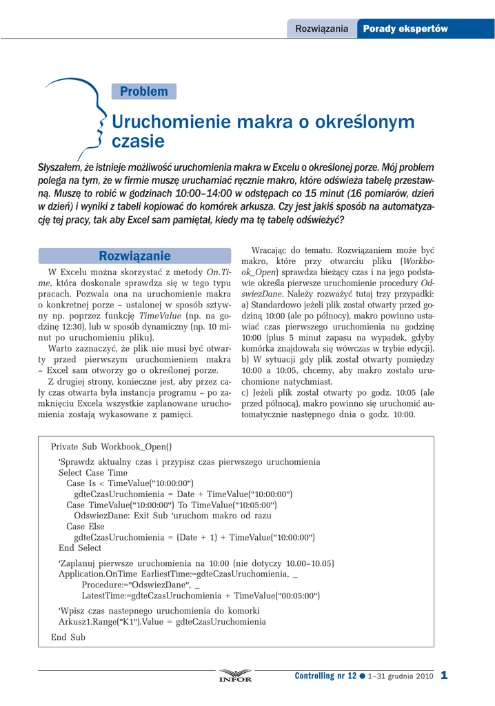 o konkretnej porze – ustalonej w sposób sztywny np. poprzez funkcję TimeValue (np. na godzinę 12:30), lub w sposób dynamiczny (np. 10 minut po uruchomieniu pliku).