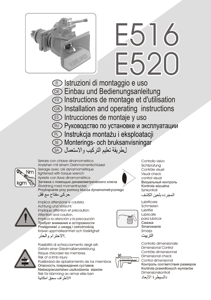 GB Istruzioni di montaggio e uso Einbau und Bedienungsanleitung Instructions de montage et d'utilisation Installation and operating instructions ES Intrucciones de montaje y uso RU Руководство по установке и эксплуатации PL Instrukcja montażu i eksploatacji SE Monterings- och bruksanvisningar ﻝﻃﺮﻳﻘﺔ ﺗﻌﻠﻴﻢ اﻟﺘﺮﻛﻴﺐ ﻭاﻻﺳﺘﻌﻤﺎﻝ IT DE FR SA Nm kgm E516 E520 Serrare con chiave dinamometrica Anziehen mit einem Drehmomentschlüssel Serrage avec clé dynamométrique tightened with torque wrench Apriete con llave dinamométrica Затяжка с помощью динамометрического ключа Åtvridning med momentnyckel Przykręcanie przy pomocy klucza dynamometrycznego Controllo visivo Sichtprüfung Contrôle visuel Visual check control visual Визуальный контроль Kontrola wizualna Synkontroll ﺣﺮﻛﻰ ﻣﻔﺘﺎﺡ ﻣﻊ ﻗﻔﻞ اﻟﻤﺠﺮدﻩ ﺑﻠﻌﻴﻦ اﻟﻜﺸﻒ Implica attenzione e cautela. Achtung und Vorsicht. Implique attention et précaution. Attention and caution. Implica la atención y la precaución Требует внимания и осторожности Postępować z uwagą i ostrożnością Kräver uppmärksamhet och försiktighet Lubrificare Schmieren Lubrifier Lubricate para lubricar Смазка Smarowanie Smörja ااﻻﺣﺘﺮام ﻭاﻟﺤﺬﺭ. اﻟﺘﺰﻳﻴﺖ Possibilità di schiacciamento degli arti. Gefahr einer Gliedmaßenverletzung. Risque d'écraser les membres. Risk of a limb injury Posilibidad de aplastamiento de los miembros Опасность повреждения суставов Niebezpieczeństwo uszkodzenia stawów Risk för klämning av armar eller ben Controllo dimensionale Dimensional Control Contrôle dimensionnel Dimensional check Control dimensional Контроль соответствия размеров Kontrola prawidłowych wymiarów Dimensionskontroll ااﻻﻃﺮاف ﺳﺤﻖ اﻣﻜﺎﻧﻴﺔ 0 10 0 20 30 40 داﻟﺴﻴﻄﺮﺓ اﻷﺑﻌﺎد 1 - Montaggio / Einbau / Montage / Installation/ Montaje / МОНТАЖ / Montaz / Montering /ﺗﺼﺎﻋﺪ 30,5 for E520 35,5 for E516 0 10 20 30 E520 40 0 Nm Nm kgm kgm E 516 M 20- 8.8 330-370 Nm E 520 M 20- 8.8 330-370 Nm E520 1 - Montaggio / Einbau / Montage / Installation/ Montaje / МОНТАЖ / Montaz / Montering /ﺗﺼﺎﻋﺪ ° 90 ° 90 30,5 for E520 35,5 for E516 E520 3/8 1 - Montaggio / Einbau / Montage / Installation/ Montaje / МОНТАЖ / Montaz / Montering /ﺗﺼﺎﻋﺪ E 516 M =600 750 Nm E 520 M=600 750 Nm Nm kgm 3° m m 3° 4/8 . ax . ax 2 - Uso / Verwenden / utiliser / utiliser / Usage / ЭКСПЛУАТАЦИЯ / uzyc / använda / ماﻻﺳﺘﺨﺪام STOP STOP 5/8 2 - Uso / Verwenden / utiliser / utiliser / Usage / ЭКСПЛУАТАЦИЯ / uzyc / använda / ماﻻﺳﺘﺨﺪام STOP 41.5 min STOP 0 51.5 max 6/8 10 0 20 30 40 3 - controllo delle usure / Contrôle des usures / Kontrolle tragen / wear check / Seguimiento del desgaste ПЕРИОДИЧЕСКИЙ КОНТРОЛЬ / kontrola zuzycia / kontroll slitage / اﺭﺗﺪاء اﻟﺴﻴﻄﺮﺓ 0 10 20 30 40 0 Ø 61 min C X XX X Ø 63,5 max A B D A Ø 36,2 max. Ø 47.7 min. D 4 max. Ø 46.5 min. Ø 34 min. B Ø 49,9 max. min. 18 C (6) B 7/8 FR V.Orlandi remercie la clientèle pour le choix du produit. Pour toute information concernant la Concessionnaire Officielle et/ou sur le Centre d'Assistance le plus proche, veuillez consulter notre Site Internet : GB The company V.Orlandi thanks the customers for choosing this product. Visit our internet site for information of the official distributors or of the nearest workshop. ES V.Orlandi S.p.a. agradece a los clientes la elección de este producto. Para obtener información de los distribuidores oficiales y/o Centro de Servicio más cercano, consulte nuestra página web : RU Компания Orlandi S.p.A. благодарит своих клиентов за сделанный выбор. Для получения информации об официальном дистрибьюторе и/или адресах сервисных центров посетите наш интернет-сайт: PL Firma Orlandi S.p.A. dziękuje klientom za dokonanie zakupu. Żeby uzyskać informacje o oficjalnym dystrybutorze lub adresach serwisów prosimy odwiedzić naszą stronę internetową. SE V. Orlandi S.p.A. tackar för att ni valt den här produkten. Konsultera vår webbsida för mer information om närmaste officiella generalagent och/eller Servicecenter: SA ﺷﺮﻛﺔv.orlandi s.p.a ﻰﻠﻋ ﻠﻰﺗﻣﻮﻗ ﻨﺎﺗاﻭزﻳ ﺭﺓﺗ ﻨﺎﺗﻣ زﻉﺗﺑﺎ ﺮبﺗاﻻاﺗﺼ ﻝﺗاﺳﺘﻔﺴ ﺭﺗﻭﻻا ﺗﺗﻬ ﺗﻣﻨﺘﺠ ﺗﻻﺧﺘﻴﺎﺭ ﺗﺸﻜﺮﻛﻢ ﺷﻧ ﺷاﻻﻧﺘﺮ ﺷﺒﻜﺔ www.orlandi.it Via Quinzano, 3 25020 Flero -BS- Italy tel. +39-0303582722 fax +39-0303582262 e-mail: [email protected] http: www.orlandi.it ORL S I S T E M I D I DI T R A I N O codice: 1990289-B DE Die Firma V.Orlandi bedankt sich für den Kauf dieses Produkts Auf unserer Internet-Site, erhalten Sie weitere Informationen zum offiziellen Vertriebsnetz, sowie des nächtsgelegen Fachhändlers Ihrer Region Subject to technical changes without prior notice IT La V. Orlandi S.p.A. ringrazia la clientela per la scelta del prodotto. Per avere informazioni sul Concessionario Ufficiale e/o Centro Assistenza più vicino, consultare il nostro Sito Internet: