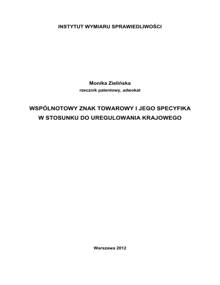 INSTYTUT WYMIARU SPRAWIEDLIWOŚCI Monika Zielińska rzecznik patentowy, adwokat WSPÓLNOTOWY ZNAK TOWAROWY I JEGO SPECYFIKA W STOSUNKU DO UREGULOWANIA KRAJOWEGO Warszawa 2012 Spis treści Wstęp ......................................................................................................................... 1 I. Źródła prawa znaków towarowych i zarys ich wzajemnych powiązań w ramach prawa europejskiego .............................................................................................. 4 I.1. Źródła prawa znaków towarowych .................................................................... 4 I.2. Zarys europejskiego prawa znaków towarowych .............................................. 8 I.2.1. Harmonizacja prawa znaków towarowych w ramach Unii Europejskiej .... 13 I.2.2. Zasada bezpośredniego stosowania prawa unijnego i jego nadrzędności w stosunku do prawa krajowego ................................................................. 17 II. Podstawowe cechy systemowe wspólnotowego znaku towarowego .................... 20 II.1. Autonomiczny charakter znaku wspólnotowego ............................................ 20 II.1.1. Urząd Harmonizacji w ramach Rynku Wewnętrznego (znaki towarowe i wzory) ...................................................................................................... 20 II.1.2. Przedmiotowy zakres praw wyłącznych .................................................. 21 II.1.3. Dochodzenie naruszeń – wyłączna jurysdykcja sądów wspólnotowych znaków towarowych ................................................................................. 33 II.1.4. Wyjątki od zasady autonomii znaku wspólnotowego ............................... 43 II.2. Jednolity charakter znaku wspólnotowego ..................................................... 48 II.2.1. Terytorialny zakres ochrony..................................................................... 49 II.2.2. Zakres terytorialny przy ustalaniu renomy i rzeczywistego charakteru używania znaku ....................................................................................... 59 II.2.2.1. Zakres terytorialny przy ustalaniu renomy......................................... 59 II.2.2.2. Zakres terytorialny przy ustalaniu rzeczywistego charakteru używania znaku ................................................................................................. 64 II.2.3. Wyczerpanie prawa ................................................................................. 70 II.2.4. Rozszerzenie ........................................................................................... 74 II.3. Koegzystencja znaku wspólnotowego ze znakami krajowymi ........................ 80 II.4. Równoważny charakter prawa z rejestracji znaku wspólnotowego z prawem do znaku krajowego ....................................................................................... 84 II.4.1. Kolizja między znakiem krajowym a „wcześniejszym” znakiem wspólnotowym ......................................................................................... 84 II.4.2. Inne przypadki kolizji między znakiem krajowym a znakiem wspólnotowym ................................................................................................................. 91 II.4.3. Kolizja w przypadku wygaśnięcia znaku z powodu jego nieużywania ..... 91 II.5. Uprzywilejowanie znaku wspólnotowego wobec znaków krajowych poprzez możliwość zastrzeżenia pierwszeństwa, starszeństwa oraz konwersji na znak krajowy ........................................................................................................... 94 Zakończenie ............................................................................................................. 96 ii Stan prawny na dzień 1.10.2012 Wstęp Od przystąpienia Polski do Unii Europejskiej w dniu 1 maja 2004 roku, krajowy i wspólnotowy system ochrony znaków towarowych współistnieją na obszarze naszego kraju. Wzrasta przy tym liczba i znaczenie znaków wspólnotowych w stosunku do znaków krajowych. Świadczą o tym dane statystyczne odnośnie do ilości zgłoszeń i udzielonych praw, udostępniane przez Urząd Harmonizacji Rynku Wewnętrznego w Alicante1 oraz Urząd Patentowy Rzeczypospolitej Polskiej2. Liczba zgłoszeń krajowych w latach 2008-2011 oscyluje między 14.000 a ca. 15.000 rocznie. W roku 2011 wyniosła 15.049 - przy uwzględnieniu zagranicznych i krajowych zgłaszających. Do tego dochodzi 3.247 zgłoszeń odnotowanych w 2011 roku w trybie Porozumienia Madryckiego lub Protokołu do tego Porozumienia. Można przy tym zauważyć, że liczba zgłoszeń międzynarodowych, w których Polska jest krajem wyznaczonym zdaje się wykazywać od 2004 roku znaczną tendencję spadkową od 8.140 w roku 2004, poprzez 6.500 w roku 2005, 6.286 w roku 2006, 5.589 w roku 2007, 4.827 w roku 2008, 4.191 w roku 2009, 3.112 w roku 2010, aż do 3.247 w 2011 roku. Wydaje się, że tendencja ta może być związana ze wzrostem znaczenia ochrony znaków w ramach systemu wspólnotowego. Tendencja ta jest także zauważalna w statystykach prowadzonych przez Międzynarodową Organizację Własności Intelektualnej3. W 2004 roku zgłoszeń 1 Statistics on Community Trade Marks in Year 2012 na stronie: http://oami.europa.eu/ows/rw/resource/documents/OHIM/statistics/ssc009statistics_of_community_trade_marks_2012.pdf oraz Country Report 2012 Poland na stronie: http://oami.europa.eu/country_reports/SSC003.1%20%20Statistical%20travel%20pack%20by%20country%20%28PL%29.pdf 2 Raport roczny 2011 Urzędu Patentowego Rzeczypospolitej Polskiej dostępny na stronie: http://www.uprp.pl/uprp/_gAllery/47/71/47712/raport_roczny_2011.pdf, a także raporty roczne Urzędu Patentowego za lata 2004, 2005, 2007, 2008, 2009, 2010 wydane przez Urząd Patentowy RP. 3 Archiwalne dane statystyczne Międzynarodowej Organizacji Własności Intelektualnej na stronie: http://www.wipo.int/madrid/en/statistics/annual_stats.jsp