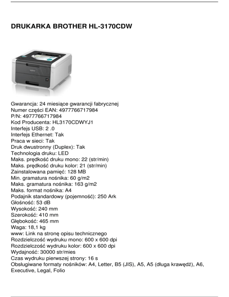 DRUKARKA BROTHER HL-3170CDW Gwarancja: 24 miesiące gwarancji fabrycznej Numer części EAN: 4977766717984 P/N: 4977766717984 Kod Producenta: HL3170CDWYJ1 Interfejs USB: 2 .0 Interfejs Ethernet: Tak Praca w sieci: Tak Druk dwustronny (Duplex): Tak Technologia druku: LED Maks. prędkość druku mono: 22 (str/min) Maks. prędkość druku kolor: 21 (str/min) Zainstalowana pamięć: 128 MB Min. gramatura nośnika: 60 g/m2 Maks. gramatura nośnika: 163 g/m2 Maks. format nośnika: A4 Podajnik standardowy (pojemność): 250 Ark Głośność: 53 dB Wysokość: 240 mm Szerokość: 410 mm Głębokość: 465 mm Waga: 18,1 kg www: Link na stronę opisu technicznego Rozdzielczość wydruku mono: 600 x 600 dpi Rozdzielczość wydruku kolor: 600 x 600 dpi Wydajność: 30000 str/mies Czas wydruku pierwszej strony: 16 s Obsługiwane formaty nośników: A4, Letter, B5 (JIS), A5, A5 (długa krawędź), A6, Executive, Legal, Folio Standardowa taca odbiorcza (poj): 100 Ark Podajnik uniwersalny: 1 Toner startowy czarny (wydajność): 1000 Ark Toner startowy CMY (wydajność): 1000 Ark Materiały eksploatacyjne: TN-241BK, TN-241C/M/Y, TN-245 C/M/Y, DR-241CL, BU-220CL, WT-220CL P/N:: 4977766717984 Numer części EAN:: 4977766717984 Interfejs Paralell: Nie Interfejs inny: karta sieci bezprzewodowej 802.11b/g/n Obsługa DOS: Nie Dodatkowy port USB: Nie Nadruk na płytach CD,DVD,BD: Nie Cena: 1203.74 PLN Powered by TCPDF (www.tcpdf.org)