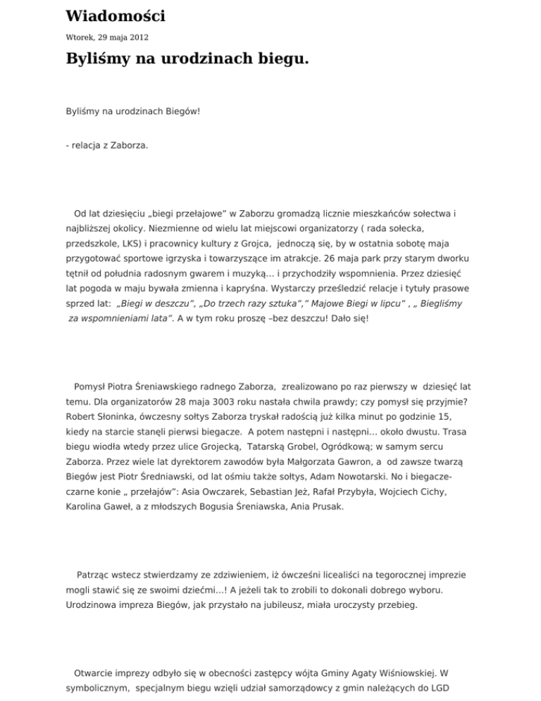 Wiadomości Wtorek, 29 maja 2012 Byliśmy na urodzinach biegu. Byliśmy na urodzinach Biegów! - relacja z Zaborza. Od lat dziesięciu „biegi przełajowe” w Zaborzu gromadzą licznie mieszkańców sołectwa i najbliższej okolicy. Niezmienne od wielu lat miejscowi organizatorzy ( rada sołecka, przedszkole, LKS) i pracownicy kultury z Grojca, jednoczą się, by w ostatnia sobotę maja przygotować sportowe igrzyska i towarzyszące im atrakcje. 26 maja park przy starym dworku tętnił od południa radosnym gwarem i muzyką… i przychodziły wspomnienia. Przez dziesięć lat pogoda w maju bywała zmienna i kapryśna. Wystarczy prześledzić relacje i tytuły prasowe sprzed lat: „Biegi w deszczu”, „Do trzech razy sztuka”,” Majowe Biegi w lipcu” , „ Biegliśmy za wspomnieniami lata”. A w tym roku proszę –bez deszczu! Dało się! Pomysł Piotra Śreniawskiego radnego Zaborza, zrealizowano po raz pierwszy w dziesięć lat temu. Dla organizatorów 28 maja 3003 roku nastała chwila prawdy; czy pomysł się przyjmie? Robert Słoninka, ówczesny sołtys Zaborza tryskał radością już kilka minut po godzinie 15, kiedy na starcie stanęli pierwsi biegacze. A potem następni i następni… około dwustu. Trasa biegu wiodła wtedy przez ulice Grojecką, Tatarską Grobel, Ogródkową; w samym sercu Zaborza. Przez wiele lat dyrektorem zawodów była Małgorzata Gawron, a od zawsze twarzą Biegów jest Piotr Średniawski, od lat ośmiu także sołtys, Adam Nowotarski. No i biegaczeczarne konie „ przełajów”: Asia Owczarek, Sebastian Jeż, Rafał Przybyła, Wojciech Cichy, Karolina Gaweł, a z młodszych Bogusia Śreniawska, Ania Prusak. Patrząc wstecz stwierdzamy ze zdziwieniem, iż ówcześni licealiści na tegorocznej imprezie mogli stawić się ze swoimi dziećmi…! A jeżeli tak to zrobili to dokonali dobrego wyboru. Urodzinowa impreza Biegów, jak przystało na jubileusz, miała uroczysty przebieg. Otwarcie imprezy odbyło się w obecności zastępcy wójta Gminy Agaty Wiśniowskiej. W symbolicznym, specjalnym biegu wzięli udział samorządowcy z gmin należących do LGD „Dolina Soły” : Brzeszcze i Chełmek. Przybył przedstawiciel Powiatu Oświęcimskiego, wicestarosta Zbigniew Starzec. W gronie dziesięciu biegaczy znalazł się pierwszy finalista biegu open z 2003 roku, Zbigniew Przybyła i były sołtys Robert Słoninka. Gminę Oświęcim reprezentował sekretarz Robert Dziuba i radny Rafał Stachura. Twarzą Rady LGD „Dolina Soły” był Łukasz Jończy. No i pobiegli jubileuszowo…! A potem z Wójtem Gminy, P. Małgorzatą Grzywa samorządowcy i pozostali uczestnicy imprezy udali się na przyjęcie urodzinowe, na którym Władarz Gminy częstowała olbrzymim tortem, cudnie zdobionym marcepanowym herbem naszej Gminy. Deszcz”dwustuzłotówek” wywołany ręką P. Wójt spadł na głowy organizatorów X Biegów. Były fanfary, była piosenka Ryszarda Rynkowskiego „Dziś są moje urodziny”, a od GBP współorganizatorzy otrzymali pamiątkowe podziękowania. W stronę dyrektora i pracowników przedszkola, którzy najliczniej biorą udział w przygotowaniach, organizator główny skierował Jubileuszowy Puchar. Biegi zbiegły się z Dniem Matki. To dla mam dzieci puściły w niebo dziesiątki kolorowych baloników, z których każdy niósł serdeczne życzenia. Jak zwykle emocjonujące było losowanie spośród biegaczy specjalnej nagrody - rowera. Zrobiła to fundatorka nagrody –Wójt Gminy Małgorzata Grzywa. Rower pojechał do Poręby Wielkiej z Karoliną Ślaga. A potem mieliśmy okazję poznać tegorocznych finalistów X Sołeckiego Biegu Przełajowego. Byli to: Kategoria: Przedszkole ( 2-4.latki) Chłopcy: Dziewczynki : 1. Urbańczyk Bartosz 1. Krawczyk Dagmara 2. Osiecki Tymoteusz 2. Goczał Milena 3. Kuc Jakub 3. Mucha Anita Przedszkole (5-7.latki) Chłopcy: Dziewczynki: Kukla Igor 1.Jarosz Zuzia Goczał Jakub 2.Osiecka Emilka Nowotarski Marcin 3.Ćwiękała Hanna Kategoria: Szkoła podstawowa kl. I-III Chłopcy: Dziewczynki: Zemła Artur 1. Kondal Kinga Jarosz Michał 2.Filipek Amelia 3. Gaweł Konrad 3.Porowska Aleksandra Kategoria: Szkoła podstawowa kl. IV-VI Chłopcy: Dziewczynki: 1. Dusik Dariusz 1. Podstawa Klaudia 2. Gąsiorek Ireneusz 2. Śreniawski Bogusława 3. Wójcik Jacek 3. Prusak Natalia Kategoria: Gimnazjum Chłopcy: Dziewczynki : 1. Krzemień Krzysztof 1. Nowak Monika 2. Krajzel Michał 2. Hatłas Klaudia 3.Walus Paweł 3. Gabryszak Elżbieta Open Mężczyźni: Kobiety: 1. Przewoźnik Marek 1. Marcińczyk Katarzyna 2. Kozioł Krzysztof 2. Nowak Monika 3. Gaweł Bogdan 3. Sobol Wiktoria Wśród pozostałych zawodników Wójt rozlosowała wiele cennych nagród. Festyn pod gołym niebem zwieńczył sobotnie atrakcje do których dostęp był od przedpołudnia. Dzieciaki mogły zdobywać ścianę Mont Everestu i szaleć w bajkowym zamku, a starsi mieli okazję sięgnąć po wiedzę na temat Lokalnej Grupy Działania ”Dolina Soły” bezpośrednio od prezesa Agnieszki Molendy, która wystawiła na miejscu imprezy regionalne stoisko. ………………………………………………………………………………………………… Honorowy patronat nad imprezą objęła Małgorzata Grzywa - Wójt Gminy Oświęcim. Patronat medialny: TV Oświęcim, Fakty Oświęcim, Oświęcim Online, Oświęcimska Gmina. Organizatorzy kłaniają się nisko i dziękują za wsparcie sponsorom tegorocznej imprezy. Byli to: PWiK Oświęcim, Klub Menago - S.Wiertel, Adam Dębowski, Irena Polak, DS.-Bruk Zaborze, Georg -I. Grygiel, Żmuda Zbigniew, PKO SA, Naraz Jarosław, WIT-POL, Garbaczewski Leon, Gmina Oświęcim. Impreza była współfinansowana ze środków UE, w ramach PROW na lata 2007-2013. Relację zdała: Barbara Gasidło- GBP ( organizator). Zapraszamy do Galerii Zdjęć!