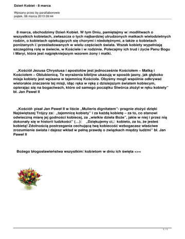 Dzień Kobiet - 8 marca Wpisany przez by parafiaborowie piątek, 08 marca 2013 09:44 8 marca, obchodzimy Dzień Kobiet. W tym Dniu, pamiętajmy w modlitwach o wszystkich kobietach, zwłaszcza o tych najbardziej utrudzonych matkach wielodzietnych rodzin, o kobietach opiekujących się chorymi i niedołężnymi, a także o kobietach poniżanych i prześladowanych w wielu częściach świata. Wszak kobiety wypełniają szczególną rolę w świecie, w Kościele i w rodzinie. Polecajmy ich trud i życie Panu Bogu i Maryi, która jest najpiękniejszym wzorem żony i matki. „Kościół Jezusa Chrystusa i apostołów jest jednocześnie Kościołem – Matką i Kościołem – Oblubienicą. Te wyrażenia biblijne ukazują w sposób jasny, jak głęboko misja kobiety jest wpisana w tajemnicę Kościoła. Obyśmy mogli wspólnie odkrywać wielorakie znaczenie tej misji, idąc ręka w rękę z dzisiejszym światem kobiecym, opierając się na bogactwach, które od samego początku Stwórca złożył w ręku kobiety” bł. Jan Paweł II „Kościół- pisał Jan Paweł II w liście „Mulieris dignitatem”- pragnie złożyć dzięki Najświętszej Trójcy za „tajemnicę kobiety” i za każdą kobietę – za to, co stanowi odwieczną miarę jej godności kobiecej, za „wielkie dzieła Boże”, jakie w niej i przez nią dokonały się w historii ludzkości” (…) „Dziękujemy ci, kobieto, za to, że jesteś kobietą! Zdolnością postrzegania cechującą twą kobiecość wzbogacasz właściwe zrozumienie świata i dajesz wkład w pełną prawdę o związkach między ludźmi” bł. Jan Paweł II Bożego błogosławieństwa wszystkim kobietom w dniu ich święta <>< 1/1