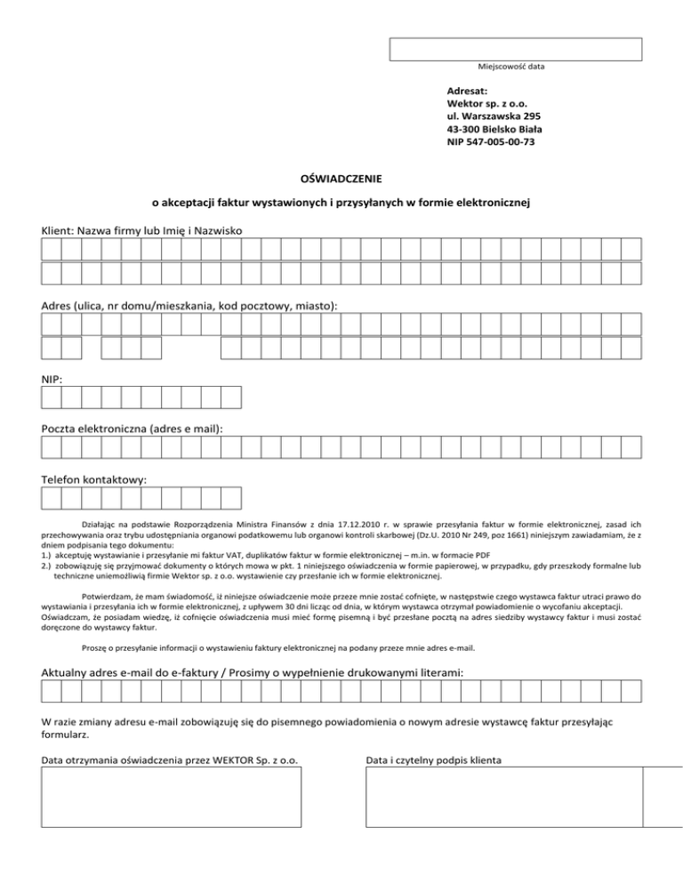 Miejscowość data Adresat: Wektor sp. z o.o. ul. Warszawska 295 43-300 Bielsko Biała NIP 547-005-00-73 OŚWIADCZENIE o akceptacji faktur wystawionych i przysyłanych w formie elektronicznej Klient: Nazwa firmy lub Imię i Nazwisko Adres (ulica, nr domu/mieszkania, kod pocztowy, miasto): NIP: Poczta elektroniczna (adres e mail): Telefon kontaktowy: Działając na podstawie Rozporządzenia Ministra Finansów z dnia 17.12.2010 r. w sprawie przesyłania faktur w formie elektronicznej, zasad ich przechowywania oraz trybu udostępniania organowi podatkowemu lub organowi kontroli skarbowej (Dz.U. 2010 Nr 249, poz 1661) niniejszym zawiadamiam, że z dniem podpisania tego dokumentu: 1.) akceptuję wystawianie i przesyłanie mi faktur VAT, duplikatów faktur w formie elektronicznej – m.in. w formacie PDF 2.) zobowiązuję się przyjmować dokumenty o których mowa w pkt. 1 niniejszego oświadczenia w formie papierowej, w przypadku, gdy przeszkody formalne lub . techniczne uniemożliwią firmie Wektor sp. z o.o. wystawienie czy przesłanie ich w formie elektronicznej. Potwierdzam, że mam świadomość, iż niniejsze oświadczenie może przeze mnie zostać cofnięte, w następstwie czego wystawca faktur utraci prawo do wystawiania i przesyłania ich w formie elektronicznej, z upływem 30 dni licząc od dnia, w którym wystawca otrzymał powiadomienie o wycofaniu akceptacji. Oświadczam, że posiadam wiedzę, iż cofnięcie oświadczenia musi mieć formę pisemną i być przesłane pocztą na adres siedziby wystawcy faktur i musi zostać doręczone do wystawcy faktur. Proszę o przesyłanie informacji o wystawieniu faktury elektronicznej na podany przeze mnie adres e-mail. Aktualny adres e-mail do e-faktury / Prosimy o wypełnienie drukowanymi literami: W razie zmiany adresu e-mail zobowiązuję się do pisemnego powiadomienia o nowym adresie wystawcę faktur przesyłając formularz. Data otrzymania oświadczenia przez WEKTOR Sp. z o.o. Data i czytelny podpis klienta