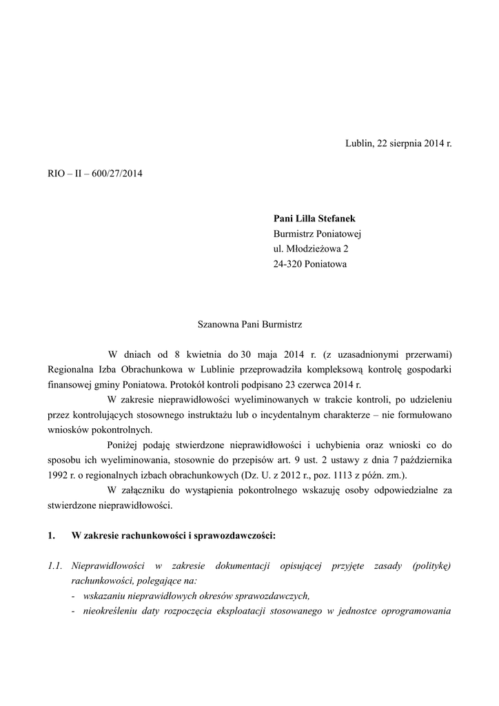 Lublin, 22 sierpnia 2014 r. RIO – II – 600/27/2014 Pani Lilla Stefanek Burmistrz Poniatowej ul. Młodzieżowa 2 24-320 Poniatowa Szanowna Pani Burmistrz W dniach od 8 kwietnia do 30 maja 2014 r. (z uzasadnionymi przerwami) Regionalna Izba Obrachunkowa w Lublinie przeprowadziła kompleksową kontrolę gospodarki finansowej gminy Poniatowa. Protokół kontroli podpisano 23 czerwca 2014 r. W zakresie nieprawidłowości wyeliminowanych w trakcie kontroli, po udzieleniu przez kontrolujących stosownego instruktażu lub o incydentalnym charakterze – nie formułowano wniosków pokontrolnych. Poniżej podaję stwierdzone nieprawidłowości i uchybienia oraz wnioski co do sposobu ich wyeliminowania, stosownie do przepisów art. 9 ust. 2 ustawy z dnia 7 października 1992 r. o regionalnych izbach obrachunkowych (Dz. U. z 2012 r., poz. 1113 z późn. zm.). W załączniku do wystąpienia pokontrolnego wskazuję osoby odpowiedzialne za stwierdzone nieprawidłowości. 1. W zakresie rachunkowości i sprawozdawczości: 1.1. Nieprawidłowości w zakresie dokumentacji opisującej przyjęte zasady (politykę) rachunkowości, polegające na: - wskazaniu nieprawidłowych okresów sprawozdawczych, - nieokreśleniu daty rozpoczęcia eksploatacji stosowanego w jednostce oprogramowania 2 finansowo-księgowego, - niewprowadzeniu do zakładowego planu kont jednostki konta 245 „Wpływy do wyjaśnienia”, mimo występowania operacji podlegających ujęciu na tym koncie, - ustaleniu nieprawidłowej zasady ewidencji wpływu dochodów budżetowych od urzędów skarbowych na koncie 130 „Rachunek bieżący jednostki” (w okresach kwartalnych) – str. 4-6 protokołu. Uzupełnić dokumentację opisującą przyjęte zasady rachunkowości, przez: - określenie daty rozpoczęcia eksploatacji oprogramowania wykorzystywanego w jednostce, - ujęcie w zakładowym planie kont jednostki konta 245 „Wpływy do wyjaśnienia” oraz określenie zasad klasyfikacji na nim zdarzeń, - wprowadzenie obowiązku bieżącego ewidencjonowania na koncie 130 „Rachunek bieżący jednostki”operacji dotyczących wpływu dochodów budżetowych od urzędów skarbowych w okresie sprawozdawczym, w którym miały one miejsce, zgodnie z przepisami art. 20 ust. 1 ustawy z dnia 29 września 1994 r. o rachunkowości (Dz. U. z 2013 r. poz. 330 z późn. zm.) w związku z § 18 ust. 2 rozporządzenia Ministra Finansów z dnia 5 lipca 2010 r. w sprawie szczególnych zasad rachunkowości oraz planów kont dla budżetu państwa, budżetów jednostek samorządu terytorialnego, jednostek budżetowych, samorządowych zakładów budżetowych, państwowych funduszy celowych oraz państwowych jednostek budżetowych mających siedzibę poza granicami Rzeczypospolitej Polskiej (Dz. U. z 2013 r., poz. 289), powoływanego w dalszej części tego wystąpienia jako „rozporządzenie Ministra Finansów z dnia 5 lipca 2010 r.”, stosownie do przepisów art. 10 ust. 1 pkt 3 lit. a i c oraz ust. 2 ustawy o rachunkowości, mając na uwadze przepisy § 15 ust. 1 pkt 1 tego rozporządzenia. 1.2. Prowadzenie wspólnego dziennika budżetu i jednostki dla zdarzeń podlegających ewidencji bilansowej i pozabilansowej – str. 6-7 protokołu. Zapisów operacji podlegających ewidencji pozabilansowej dokonywać w odrębnych urządzeniach księgowych, mając na uwadze zasady prowadzenia dziennika, określone w przepisach art. 14 ust. 1 i 2 ustawy o rachunkowości, w tym obowiązek kolejnego numerowania zapisów. 1.3. Nieujmowanie w księgach rachunkowych budżetu naliczenia i spłaty odsetek od kredytów – str. 8 protokołu. Zapisów o zdarzeniach dokonywać na kontach księgi głównej w ujęciu systematycznym, w związku z przepisami art. 15 ust. 1 ustawy o rachunkowości, 3 w szczególności ujmować w księgach rachunkowych budżetu z naliczaniem i spłatą odsetek od kredytów, dokonując zapisów: - naliczenie przez bank odsetek od kredytu: Wn 909 „Rozliczenia międzyokresowe”, Ma 134 „Kredyty bankowe”, operacje związane - spłata odsetek od kredytu Wn 134 „Kredyty bankowe”, Ma 909 „Rozliczenia międzyokresowe”, zgodnie z zasadami funkcjonowania tych kont, określonymi w załączniku Nr 2 do rozporządzenia Ministra Finansów z dnia 5 lipca 2010 r. 1.4. Wykazanie w sprawozdaniach Rb – 27 S Urzędu Miejskiego w 2013 r. nieprawidłowych kwot dochodów otrzymanych i wykonanych w zakresie udziałów w podatku dochodowym od osób fizycznych i prawnych, w wyniku niewłaściwego ujmowania operacji na koncie 130/JD „Rachunek bieżący jednostki” – str. 20-23 protokołu Zapisów w ewidencji analitycznej do konta 130 „Rachunek bieżący jednostki” – subkonto dochodów, dokonywać na bieżąco, zgodnie z przepisami art. 20 ust. 1 ustawy o rachunkowości, w miesiącu ich wpływu na rachunek budżetu miasta, jako powtórzenie zapisu dokonanego na koncie 133 „Rachunek budżetu”, mając na uwadze, że jednostkowe sprawozdania budżetowe sporządza się na podstawie danych wynikających z prawidłowo prowadzonych ksiąg rachunkowych, stosownie do przepisów § 6 ust. 1 pkt 1 rozporządzenia Ministra Finansów z dnia 16 stycznia 2014 r. w sprawie sprawozdawczości budżetowej (Dz. U. z 2014 r. poz. 119). Udziały we wpływach z podatku dochodowego od osób fizycznych i prawnych wykazywać w jednostkowym sprawozdaniu Rb-27S „Miesięczne/roczne sprawozdanie z wykonania planu dochodów budżetu jednostki samorządu terytorialnego”: w kolumnie „Dochody wykonane (wpływu minus zwroty) – przekazane kwoty udziałów należne za okres, którego sprawozdanie dotyczy, zaś w kolumnie „Dochody otrzymane” - kwoty, które wpłynęły na rachunek bankowy w okresie sprawozdawczym, zgodnie z przepisami § 2 ust. 1 pkt 1 i ust. 3 oraz § 3 ust. 3 pkt 3 i 4 „Instrukcji sporządzania sprawozdań budżetowych w zakresie budżetów jednostek samorządu terytorialnego”, stanowiącej załącznik Nr 39 do rozporządzenia. 1.5. Dokonywanie zapisów na