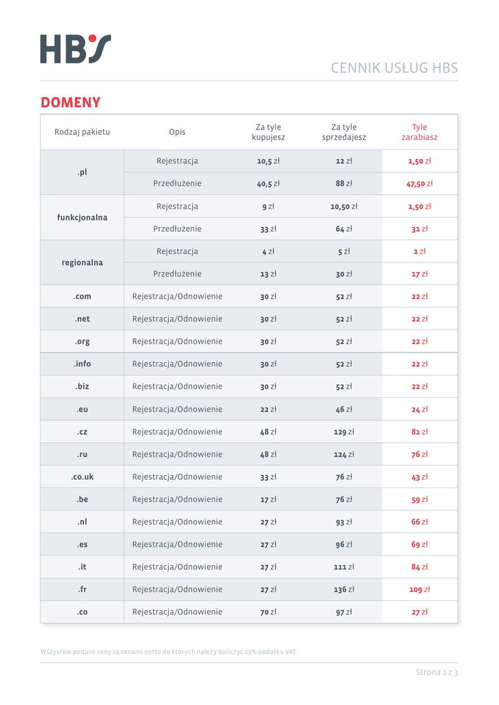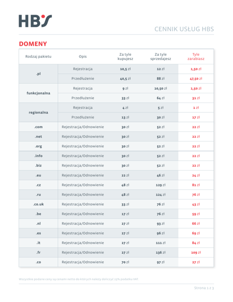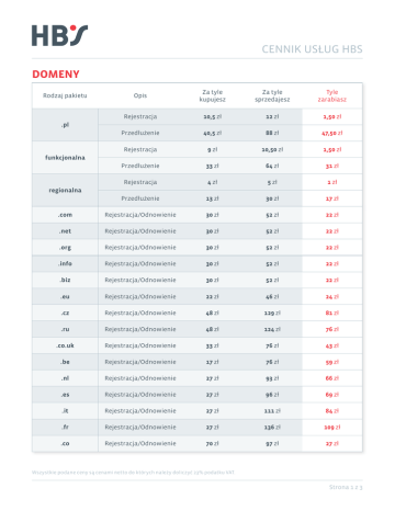 cennik usług HBS domeny Opis Za tyle kupujesz Za tyle sprzedajesz Tyle zarabiasz Rejestracja 10,5 zł 12 zł 1,50 zł Przedłużenie 40,5 zł 88 zł 47,50 zł Rejestracja 9 zł 10,50 zł 1,50 zł Przedłużenie 33 zł 64 zł 31 zł Rejestracja 4 zł 5 zł 1 zł Przedłużenie 13 zł 30 zł 17 zł .com Rejestracja/Odnowienie 30 zł 52 zł 22 zł .net Rejestracja/Odnowienie 30 zł 52 zł 22 zł .org Rejestracja/Odnowienie 30 zł 52 zł 22 zł .info Rejestracja/Odnowienie 30 zł 52 zł 22 zł .biz Rejestracja/Odnowienie 30 zł 52 zł 22 zł .eu Rejestracja/Odnowienie 22 zł 46 zł 24 zł .cz Rejestracja/Odnowienie 48 zł 129 zł 81 zł .ru Rejestracja/Odnowienie 48 zł 124 zł 76 zł .co.uk Rejestracja/Odnowienie 33 zł 76 zł 43 zł .be Rejestracja/Odnowienie 17 zł 76 zł 59 zł .nl Rejestracja/Odnowienie 27 zł 93 zł 66 zł .es Rejestracja/Odnowienie 27 zł 96 zł 69 zł .it Rejestracja/Odnowienie 27 zł 111 zł 84 zł .fr Rejestracja/Odnowienie 27 zł 136 zł 109 zł .co Rejestracja/Odnowienie 70 zł 97 zł 27 zł Rodzaj pakietu .pl funkcjonalna regionalna Wszystkie podane ceny są cenami netto do których należy doliczyć 23% podatku VAT. Strona 1 z 3 cennik usług HBS CERTYFIKATY SSL Rodzaj pakietu Opis Za tyle kupujesz Za tyle sprzedajesz Tyle zarabiasz alphaSSL Rejestracja/Odnowienie 29 zł 49 zł 20 zł RapidSSL Rejestracja/Odnowienie 39 zł 90 zł 51 zł RapidSSL Wildcard Rejestracja/Odnowienie 294 zł 471 zł 177 zł True BusinessID Rejestracja/Odnowienie 245 zł 354 zł 109 zł True BusinessID Wildcard Rejestracja/Odnowienie 980 zł 1167 zł 187 zł True BusinessID EV Rejestracja/Odnowienie 391 zł 958 zł 567 zł E-SKLEPY Rodzaj pakietu Za tyle kupujesz Za tyle sprzedajesz Tyle zarabiasz eShop 430 zł 680 zł 250 zł eShop Pro 530 zł 1080 zł 550 zł SERWERY – VIRTUAL PRIVATE SERVER Rodzaj pakietu Za tyle kupujesz Za tyle sprzedajesz Tyle zarabiasz VPS Micro 20 zł * 39 zł 19 zł VPS Basic 35 zł * 69 zł 34 zł VPS Standard 52 zł * 99 zł 47 zł VPS Professional 78 zł * 159 zł 81 zł * Opłata miesięczna Wszystkie podane ceny są cenami netto do których należy doliczyć 23% podatku VAT. Strona 2 z 3 cennik usług HBS SERWERY – HOSTING WSPÓŁDZIELONY Rodzaj pakietu Za tyle kupujesz Za tyle sprzedajesz Tyle zarabiasz Hosting Web 90 zł 159 zł 69 zł Hosting Starter 138 zł 249 zł 111 zł Hosting Server 216 zł 399 zł 183 zł Hosting Kreator 180 zł 349 zł 169 zł Rodzaj pakietu Za tyle kupujesz Za tyle sprzedajesz Tyle zarabiasz Ox Private 9,6 zł 59 zł 49,4 zł Ox Business 60 zł 99 zł 39 zł Pakiet OX Business 5 216 zł 499 zł 283 zł Pakiet OX Business 10 438 zł 999 zł 561 zł POCZTA E-MAIL Wszystkie podane ceny są cenami netto do których należy doliczyć 23% podatku VAT. Strona 3 z 3
