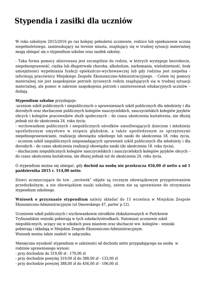 Stypendia i zasiłki dla uczniów W roku szkolnym 2015/2016 po raz kolejny pełnoletni uczniowie, rodzice lub opiekunowie ucznia niepełnoletniego, zamieszkujący na terenie miasta, znajdujący się w trudnej sytuacji materialnej mogą ubiegać się o stypendium szkolne oraz zasiłek szkolny. - Taka forma pomocy skierowana jest szczególnie do rodzin, w których występuje bezrobocie, niepełnosprawność, ciężka lub długotrwała choroba, alkoholizm, narkomania, wielodzietność, brak umiejętności wypełniania funkcji opiekuńczo-wychowawczej lub gdy rodzina jest niepełna informują pracownicy Miejskiego Zespołu Ekonomiczno-Administracyjnego. - Celem tej pomocy materialnej nie jest zaspokojenie potrzeb życiowych rodzin znajdujących się w trudnej sytuacji materialnej, ale pomoc w zakresie zaspokojenia potrzeb i zainteresowań edukacyjnych uczniów – dodają. Stypendium szkolne przysługuje: -uczniom szkół publicznych i niepublicznych o uprawnieniach szkół publicznych dla młodzieży i dla dorosłych oraz słuchaczom publicznych kolegiów nauczycielskich, nauczycielskich kolegiów języków obcych i kolegiów pracowników służb społecznych – do czasu ukończenia kształcenia, nie dłużej jednak niż do ukończenia 24. roku życia; - wychowankom publicznych i niepublicznych ośrodków umożliwiających dzieciom i młodzieży upośledzonym umysłowo w stopniu głębokim, a także upośledzonym ze sprzężonymi niepełnosprawnościami, realizację obowiązku szkolnego lub nauki do ukończenia 18. roku życia, - uczniom szkół niepublicznych nieposiadających uprawnień szkół publicznych dla młodzieży i dla dorosłych – do czasu ukończenia realizacji obowiązku nauki (do ukończenia 18. roku życia), - słuchaczom niepublicznych kolegiów nauczycielskich i nauczycielskich kolegiów języków obcych – do czasu ukończenia kształcenia, nie dłużej jednak niż do ukończenia 24. roku życia. O stypendium można się ubiegać, gdy dochód na osobę nie przekracza 456,00 zł netto a od 1 października 2015 r. 514,00 netto. Dzieci uczęszczające do tzw. „zerówek” objęte są rocznym obowiązkowym przygotowaniem przedszkolnym, a nie obowiązkiem nauki szkolnej, zatem nie są uprawnione do otrzymania stypendium szkolnego. Wniosek o przyznanie stypendium należy składać do 15 września w Miejskim Zespole Ekonomiczno-Administracyjnym (ul Dmowskiego 47, parter p.12). Uczniowie szkół publicznych i wychowankowie ośrodków zlokalizowanych w Piotrkowie Trybunalskim wnioski pobierają w tych szkołach/ośrodkach. Natomiast uczniowie szkół niepublicznych, uczący się w szkołach poza miastem oraz słuchacze ww. kolegiów - wnioski pobierają i składają w Miejskim Zespole Ekonomiczno-Administracyjnym. Wniosek można także znaleźć w załączniku. Miesięczna wysokość stypendium w zależności od dochodu netto przypadającego na osobę w rodzinie uprawnionego wynosi: - przy dochodzie do 319,00 zł - 170,00 zł - przy dochodzie powyżej 319,00 zł do 388,00 zł - 133,00 zł - przy dochodzie powyżej 388,00 zł do 456,00 zł - 106,00 zł. Od 1 października 2015 r. wysokość stypendium w zależności od dochodu netto przypadającego na osobę w rodzinie uprawnionego wynosi miesięcznie: - przy dochodzie do 360,00 zł - 170,00 zł - przy dochodzie powyżej 360,00 zł do 437,00 zł - 133,00 zł - przy dochodzie powyżej 437,00 zł do 514,00 zł - 106,00 zł. Od 1 listopada 2015 r. wysokość stypendium w zależności od dochodu netto przypadającego na osobę w rodzinie uprawnionego wynosi miesięcznie (wysokość ustalona na podstawie projektu Rozporządzenia Rady Ministrów z dnia 7 sierpnia 2015 r. w sprawie wysokości dochodu rodziny albo dochodu osoby uczącej się stanowiących podstawę ubiegania się o zasiłek rodzinny i specjalny zasiłek opiekuńczy, wysokości świadczeń rodzinnych oraz wysokości zasiłku dla opiekuna): - przy dochodzie do 360,00 zł - 189,00 zł - przy dochodzie powyżej 360,00 zł do 437,00 zł - 148,00 zł - przy dochodzie powyżej 437,00 zł do 514,00 zł -118,00 zł. Formami stypendium szkolnego są: - całkowite lub częściowe pokrycie kosztów udziału w zajęciach edukacyjnych, w tym wyrównawczych wykraczających poza zajęcia realizowane przez szkołę w ramach planu nauczania, np. wyjście/wyjazdy do teatru, kina muzeum, wycieczki szkolne, „Zielone Szkoły” itp., - całkowite lub częściowe pokrycie kosztów udziału w zajęciach edukacyjnych realizowanych poza szkołą, w tym udziału w zajęciach organizowanych w zakresie poszerzenia wiedzy ucznia w zakresie przedmiotów ogólnokształcących, nauki języków obcych, zajęć plastycznych, zajęć muzycznych, komputerowych, sportowych, zajęć na basenie i innych, - pomoc rzeczowa o charakterze edukacyjnym, w tym w szczególności zakup: 1. podręczników, lektur, encyklopedii, słowników i innych książek pomocniczych oraz pomocy naukowych niezbędnych i wskazanych do procesu dydaktycznego; 2. przyborów szkolnych, np. zeszytów, długopisów, piórników, plecaków szkolnych itp.; 3. stroju na zajęcia sportowe, w tym również na pływalni (dresy, koszulki, strój kąpielowy, czepek, okulary, spodenki, obuwie sportowe, klapki na basen itp.) - jednak nie więcej niż dwie pary/komplety na semestr, i innego wyposażenia uczniów wymaganego przez szkołę; 4. komputera, oprogramowania, części do komputera, drukarki, urządzenia wielofunkcyjnego, monitora komputerowego; 5. multimedialnych programów edukacyjnych; 6. tuszu, tonera i papieru do drukarki, płyt CD i DVD, dyskietek; 7. pokrycie kosztów abonamentu internetowego; 8. związane z pobieraniem nauki poza miejscem zamieszkania, np. zakup miesięcznych biletów związanych z dojazdem do szkół, opłacenie internatu, bursy itp. Jak informują pracownicy MZEA stypendia wypłacane są na zasadzie refundacji (zwrotu pieniędzy) po przedstawieniu dowodów zakupu (faktur, rachunków imiennych) przedmiotów i a