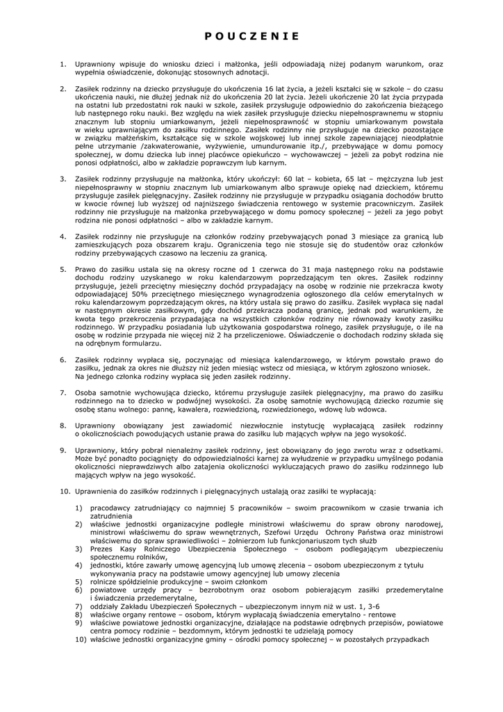 POUCZENIE 1. Uprawniony wpisuje do wniosku dzieci i małżonka, jeśli odpowiadają niżej podanym warunkom, oraz wypełnia oświadczenie, dokonując stosownych adnotacji. 2. Zasiłek rodzinny na dziecko przysługuje do ukończenia 16 lat życia, a jeżeli kształci się w szkole – do czasu ukończenia nauki, nie dłużej jednak niż do ukończenia 20 lat życia. Jeżeli ukończenie 20 lat życia przypada na ostatni lub przedostatni rok nauki w szkole, zasiłek przysługuje odpowiednio do zakończenia bieżącego lub następnego roku nauki. Bez względu na wiek zasiłek przysługuje dziecku niepełnosprawnemu w stopniu znacznym lub stopniu umiarkowanym, jeżeli niepełnosprawność w stopniu umiarkowanym powstała w wieku uprawniającym do zasiłku rodzinnego. Zasiłek rodzinny nie przysługuje na dziecko pozostające w związku małżeńskim, kształcące się w szkole wojskowej lub innej szkole zapewniającej nieodpłatnie pełne utrzymanie /zakwaterowanie, wyżywienie, umundurowanie itp./, przebywające w domu pomocy społecznej, w domu dziecka lub innej placówce opiekuńczo – wychowawczej – jeżeli za pobyt rodzina nie ponosi odpłatności, albo w zakładzie poprawczym lub karnym. 3. Zasiłek rodzinny przysługuje na małżonka, który ukończył: 60 lat – kobieta, 65 lat – mężczyzna lub jest niepełnosprawny w stopniu znacznym lub umiarkowanym albo sprawuje opiekę nad dzieckiem, któremu przysługuje zasiłek pielęgnacyjny. Zasiłek rodzinny nie przysługuje w przypadku osiągania dochodów brutto w kwocie równej lub wyższej od najniższego świadczenia rentowego w systemie pracowniczym. Zasiłek rodzinny nie przysługuje na małżonka przebywającego w domu pomocy społecznej – jeżeli za jego pobyt rodzina nie ponosi odpłatności – albo w zakładzie karnym. 4. Zasiłek rodzinny nie przysługuje na członków rodziny przebywających ponad 3 miesiące za granicą lub zamieszkujących poza obszarem kraju. Ograniczenia tego nie stosuje się do studentów oraz członków rodziny przebywających czasowo na leczeniu za granicą. 5. Prawo do zasiłku ustala się na okresy roczne od 1 czerwca do 31 maja następnego roku na podstawie dochodu rodziny uzyskanego w roku kalendarzowym poprzedzającym ten okres. Zasiłek rodzinny przysługuje, jeżeli przeciętny miesięczny dochód przypadający na osobę w rodzinie nie przekracza kwoty odpowiadającej 50% przeciętnego miesięcznego wynagrodzenia ogłoszonego dla celów emerytalnych w roku kalendarzowym poprzedzającym okres, na który ustala się prawo do zasiłku. Zasiłek wypłaca się nadal w następnym okresie zasiłkowym, gdy dochód przekracza podaną granicę, jednak pod warunkiem, że kwota tego przekroczenia przypadająca na wszystkich członków rodziny nie równoważy kwoty zasiłku rodzinnego. W przypadku posiadania lub użytkowania gospodarstwa rolnego, zasiłek przysługuje, o ile na osobę w rodzinie przypada nie więcej niż 2 ha przeliczeniowe. Oświadczenie o dochodach rodziny składa się na odrębnym formularzu. 6. Zasiłek rodzinny wypłaca się, poczynając od miesiąca kalendarzowego, w którym powstało prawo do zasiłku, jednak za okres nie dłuższy niż jeden miesiąc wstecz od miesiąca, w którym zgłoszono wniosek. Na jednego członka rodziny wypłaca się jeden zasiłek rodzinny. 7. Osoba samotnie wychowująca dziecko, któremu przysługuje zasiłek pielęgnacyjny, ma prawo do zasiłku rodzinnego na to dziecko w podwójnej wysokości. Za osobę samotnie wychowującą dziecko rozumie się osobę stanu wolnego: pannę, kawalera, rozwiedzioną, rozwiedzionego, wdowę lub wdowca. 8. Uprawniony obowiązany jest zawiadomić niezwłocznie instytucję wypłacającą zasiłek o okolicznościach powodujących ustanie prawa do zasiłku lub mających wpływ na jego wysokość. 9. Uprawniony, który pobrał nienależny zasiłek rodzinny, jest obowiązany do jego zwrotu wraz z odsetkami. Może być ponadto pociągnięty do odpowiedzialności karnej za wyłudzenie w przypadku umyślnego podania okoliczności nieprawdziwych albo zatajenia okoliczności wykluczających prawo do zasiłku rodzinnego lub mających wpływ na jego wysokość. rodzinny 10. Uprawnienia do zasiłków rodzinnych i pielęgnacyjnych ustalają oraz zasiłki te wypłacają: 1) pracodawcy zatrudniający co najmniej 5 pracowników – swoim pracownikom w czasie trwania ich zatrudnienia 2) właściwe jednostki organizacyjne podległe ministrowi właściwemu do spraw obrony narodowej, ministrowi właściwemu do spraw wewnętrznych, Szefowi Urzędu Ochrony Państwa oraz ministrowi właściwemu do spraw sprawiedliwości – żołnierzom lub funkcjonariuszom tych służb 3) Prezes Kasy Rolniczego Ubezpieczenia Społecznego – osobom podlegającym ubezpieczeniu społecznemu rolników, 4) jednostki, które zawarły umowę agencyjną lub umowę zlecenia – osobom ubezpieczonym z tytułu wykonywania pracy na podstawie umowy agencyjnej lub umowy zlecenia 5) rolnicze spółdzielnie produkcyjne – swoim członkom 6) powiatowe urzędy pracy – bezrobotnym oraz osobom pobierającym zasiłki przedemerytalne i świadczenia przedemerytalne, 7) oddziały Zakładu Ubezpieczeń Społecznych – ubezpieczonym innym niż w ust. 1, 3-6 8) właściwe organy rentowe – osobom, którym wypłacają świadczenia emerytalno - rentowe 9) właściwe powiatowe jednostki organizacyjne, działające na podstawie odrębnych przepisów, powiatowe centra pomocy rodzinie – bezdomnym, którym jednostki te udzielają pomocy 10) właściwe jednostki organizacyjne gminy – ośrodki pomocy społecznej – w pozostałych przypadkach