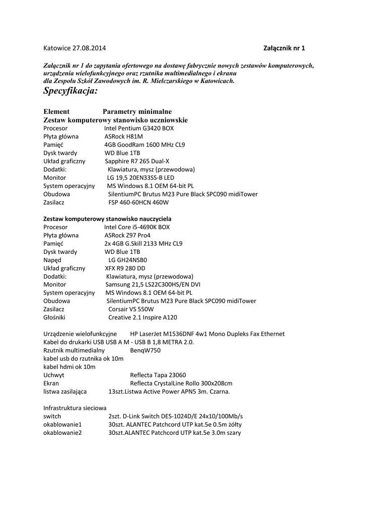 Katowice 27.08.2014 Załącznik nr 1 Załącznik nr 1 do zapytania ofertowego na dostawę fabrycznie nowych zestawów komputerowych, urządzenia wielofunkcyjnego oraz rzutnika multimedialnego i ekranu dla Zespołu Szkół Zawodowych im. R. Mielczarskiego w Katowicach. Specyfikacja: Element Parametry minimalne Zestaw komputerowy stanowisko uczniowskie Procesor Płyta główna Pamięć Dysk twardy Układ graficzny Dodatki: Monitor System operacyjny Obudowa Zasilacz Intel Pentium G3420 BOX ASRock H81M 4GB GoodRam 1600 MHz CL9 WD Blue 1TB Sapphire R7 265 Dual-X Klawiatura, mysz (przewodowa) LG 19,5 20EN33SS-B LED MS Windows 8.1 OEM 64-bit PL SilentiumPC Brutus M23 Pure Black SPC090 midiTower FSP 460-60HCN 460W Zestaw komputerowy stanowisko nauczyciela Procesor Intel Core i5-4690K BOX Płyta główna ASRock Z97 Pro4 Pamięć 2x 4GB G.Skill 2133 MHz CL9 Dysk twardy WD Blue 1TB Napęd LG GH24NSB0 Układ graficzny XFX R9 280 DD Dodatki: Klawiatura, mysz (przewodowa) Monitor Samsung 21,5 LS22C300HS/EN DVI System operacyjny MS Windows 8.1 OEM 64-bit PL Obudowa SilentiumPC Brutus M23 Pure Black SPC090 midiTower Zasilacz Corsair VS 550W Głośniki Creative 2.1 Inspire A120 Urządzenie wielofunkcyjne HP LaserJet M1536DNF 4w1 Mono Dupleks Fax Ethernet Kabel do drukarki USB USB A M - USB B 1,8 METRA 2.0. Rzutnik multimedialny BenqW750 kabel usb do rzutnika ok 10m kabel hdmi ok 10m Uchwyt Reflecta Tapa 23060 Ekran Reflecta CrystalLine Rollo 300x208cm listwa zasilająca 13szt.Listwa Active Power APN5 3m. Czarna. Infrastruktura sieciowa switch 2szt. D-Link Switch DES-1024D/E 24x10/100Mb/s okablowanie1 30szt. ALANTEC Patchcord UTP kat.5e 0.5m żółty okablowanie2 30szt.ALANTEC Patchcord UTP kat.5e 3.0m szary