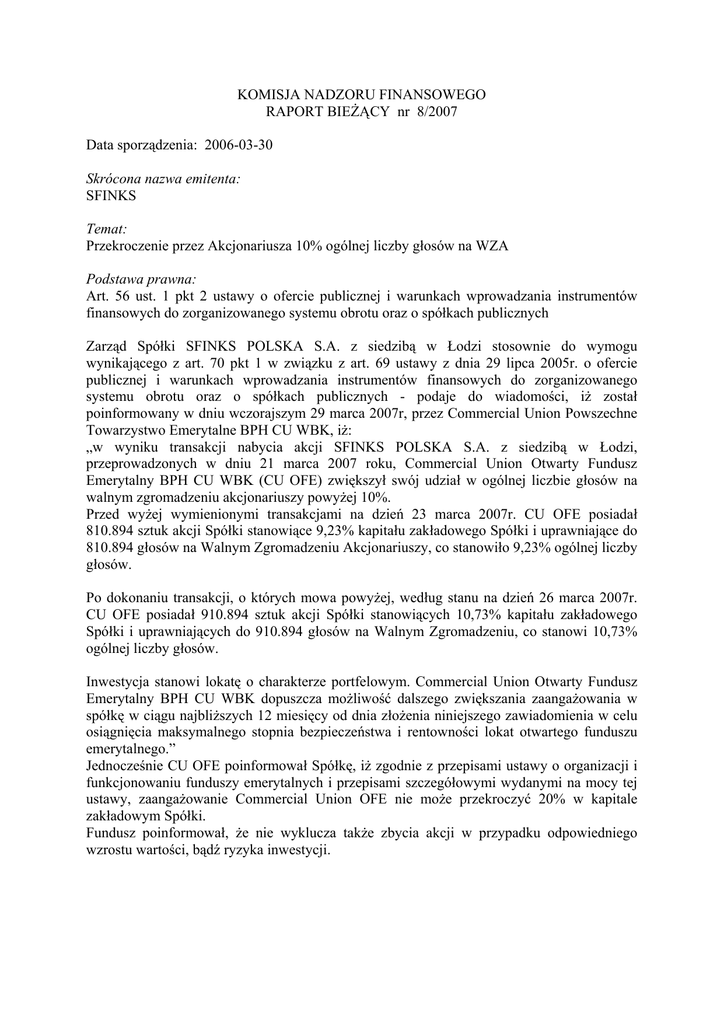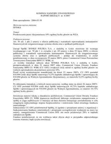 KOMISJA NADZORU FINANSOWEGO RAPORT BIEŻĄCY nr 8/2007 Data sporządzenia: 2006-03-30 Skrócona nazwa emitenta: SFINKS Temat: Przekroczenie przez Akcjonariusza 10% ogólnej liczby głosów na WZA Podstawa prawna: Art. 56 ust. 1 pkt 2 ustawy o ofercie publicznej i warunkach wprowadzania instrumentów finansowych do zorganizowanego systemu obrotu oraz o spółkach publicznych Zarząd Spółki SFINKS POLSKA S.A. z siedzibą w Łodzi stosownie do wymogu wynikającego z art. 70 pkt 1 w związku z art. 69 ustawy z dnia 29 lipca 2005r. o ofercie publicznej i warunkach wprowadzania instrumentów finansowych do zorganizowanego systemu obrotu oraz o spółkach publicznych - podaje do wiadomości, iż został poinformowany w dniu wczorajszym 29 marca 2007r, przez Commercial Union Powszechne Towarzystwo Emerytalne BPH CU WBK, iż: „w wyniku transakcji nabycia akcji SFINKS POLSKA S.A. z siedzibą w Łodzi, przeprowadzonych w dniu 21 marca 2007 roku, Commercial Union Otwarty Fundusz Emerytalny BPH CU WBK (CU OFE) zwiększył swój udział w ogólnej liczbie głosów na walnym zgromadzeniu akcjonariuszy powyżej 10%. Przed wyżej wymienionymi transakcjami na dzień 23 marca 2007r. CU OFE posiadał 810.894 sztuk akcji Spółki stanowiące 9,23% kapitału zakładowego Spółki i uprawniające do 810.894 głosów na Walnym Zgromadzeniu Akcjonariuszy, co stanowiło 9,23% ogólnej liczby głosów. Po dokonaniu transakcji, o których mowa powyżej, według stanu na dzień 26 marca 2007r. CU OFE posiadał 910.894 sztuk akcji Spółki stanowiących 10,73% kapitału zakładowego Spółki i uprawniających do 910.894 głosów na Walnym Zgromadzeniu, co stanowi 10,73% ogólnej liczby głosów. Inwestycja stanowi lokatę o charakterze portfelowym. Commercial Union Otwarty Fundusz Emerytalny BPH CU WBK dopuszcza możliwość dalszego zwiększania zaangażowania w spółkę w ciągu najbliższych 12 miesięcy od dnia złożenia niniejszego zawiadomienia w celu osiągnięcia maksymalnego stopnia bezpieczeństwa i rentowności lokat otwartego funduszu emerytalnego.” Jednocześnie CU OFE poinformował Spółkę, iż zgodnie z przepisami ustawy o organizacji i funkcjonowaniu funduszy emerytalnych i przepisami szczegółowymi wydanymi na mocy tej ustawy, zaangażowanie Commercial Union OFE nie może przekroczyć 20% w kapitale zakładowym Spółki. Fundusz poinformował, że nie wyklucza także zbycia akcji w przypadku odpowiedniego wzrostu wartości, bądź ryzyka inwestycji. Podpisy osób reprezentujących Spółkę: Michał Seider Wiceprezes Zarządu Otrzymują: 1. Giełda Papierów Wartościowych w Warszawie 2. Komisja Nadzoru Finansowego 3. Polska Agencja Prasowa S.A.