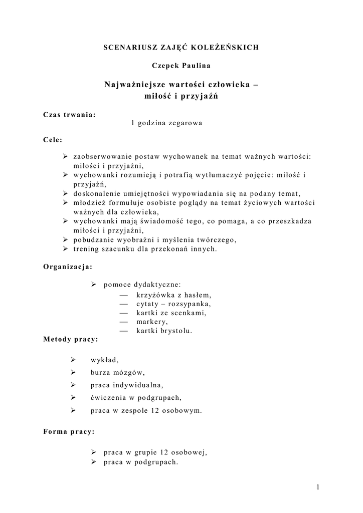 S CENARIUS Z ZAJ ĘĆ K O LEŻEŃS K IC H Czep e k Pau li n a Najwa żnie js ze wartości c zł owie ka – mił ość i pr zy ja źń Cza s t rwa n i a: 1 go dz ina zegar o wa Cele: Ø zao bser wo wanie po st aw wyc ho wanek na t emat ważnyc h war t o ści: m i ło śc i i pr z yjaź ni, Ø w yc ho wa nk i r o zu mie ją i po t r afią w yt łu m acz yć po jęc ie: m i ło ść i p r z yjaź ń, Ø d o sko na le nie u mie jęt no śc i w ypo w iad a ni a s ię na po dany t e mat , Ø m ło dz ież fo r mu łu je o so bist e po gląd y na t emat ż yc io w yc h war t o śc i ważnyc h d la cz ło w ieka, Ø w yc ho wa nk i ma ją św iado mo ść t ego , co po maga, a co pr zeszkadza m i ło śc i i pr z yjaź ni, Ø p o budzanie w yo br aź ni i m yś le nia t wór czego , Ø t r ening szacu nku d la pr zeko nań inn yc h. O rg a n i zacj a: Ø po mo ce M et o d y p racy: d ydakt ycz ne: kr z yżó wka z has łe m, c yt at y – r o zsyp a nka, kar t ki ze sce nka m i, mar ker y, kar t ki br yst o lu. Ø w yk ład, Ø bur za mó zgó w, Ø pr aca ind yw idua lna, Ø ćw ic ze nia w po dgr upach, Ø pr aca w zespo le 12 o so bo wym. Fo rma p racy: Ø pr aca w gr upie 12 o so bo we j, Ø pr aca w po dgr upach. 1 PRZEBIEG ZAJĘĆ WP RO WADZE NI E DO TE MAT U: Ch c ia ła bym, a byś m y na dz is ie jsz ym sp ot kaniu za st ano w ił y s ię na d na jwa ż n ie jsz ym i war t o śc ia m i d la ka żde go czło w ieka. Wo la ła bym jed nak , ab y t e mat nasz ego spot kania jesz cze pr zez chw i lę zo st a ł d la na s t aje mnic ą. Kr z yżó wk a, kt ór ą dla Wa s pr z ygot o wa ła m, kr yje w so bie k luczo we s ło wa d z is ie jsz yc h za jęć, zat e m pr o szę t er az o je j r o zw ią za nie. (Po ro z wi ązani u kr zyżó wki ) P yt a m w yc ho wank i, co kr yje s ię po d sło we m „pr z yjaź ń”, a co po d s ło we m „ mi ło ść” ? Jak do k ład nie mo że m y t o wyt łu macz yć ? Cz y pr z yjaź ń t o zw yk łe k o leże ńst wo czy r acze j mo c na w ięź mię dz y dwo ma o so ba mi? Cz y m r ó żn i s ię pr awdz iw a mi ło ść o d pr zyjaź ni ? ĆW IC ZEN IE 1: T wo rzym y def i ni cj ę sł ów – przyj a źń i mi łość Dz ie lę dz iewc zęt a na dwa zespo ły 6- c io o so bo we nast ępnie mó w ię: wielu z was marzy o przyjaźni i miło ści. Porozmawia jcie ze sobą i zapiszcie krót ko : Ø 1 g r upa - co cechu je ludz i, kt ór zy s ię pr z yjaź nią ? Ø 2 g r upa - co cechu je ludz i, kt ór zy s ię da r zą s ię uczuc ie m mi ło śc i? Wyc ho wa nk i d ys kut ują, zap isu ją pr ze m yś le nia na kar t kach br yst o lu , a p o t em p r zedst aw ic ie le gr up o dcz yt u ją je. W t ak i w łaś nie spo só b po wst ają d e fin ic je mi ło ś c i i pr z yja ź ni. Zast ana w ia my s ię jak ie cec hy wspó lne są d la pr z yja ź ni i m i ło śc i – p r o szę o po dkr eś le nie t yc h cec h i je szcz e r az wspó lnie je o dcz yt u je m y. ĆW IC ZEN IE 2: Cyt a t o wa ukł adanka Dz ie lę w yc ho wa nk i na gr up y 2 o so bo we. Każda lo su je c yt at w po st ac i r o zsyp a nk i. Zada nie m dz iewcz ąt je st st wo r zenie c yt at u i w yjaś nie nie s łó w. Cyt a t y: • M iło ść je st wie lk a , lecz m i ja jak mg ła, • P r z yjaź ń je st cic ha, lecz d ługo t r wa. .. , • P r awdz iwa mi ło ść nie w ycz er pu je s ię ni gd y. I m w ięc e j da je sz, t ym w ięc e j c i je j zo st anie, • M iło ść pr zekszt a łca dusz ę na po do bie ńst wo o so by uko cha ne j, • M iło ść wsz yst ko zwyc ię ża i m y u lega m y mi ło śc i, • P r z yjac ie le są jak c ic he anio ł y, kt ó r e podno szą na s, gd y nasze sk r z yd ła zapo mnia ł y jak lat ać. 2 ĆW IC ZEN IE 3: Ki ed y kończy si ę pr zyj a źń a zaczyna mi ł ość? A. Mi cki ewi cz – Ni epewn o ść Kied y po ło ż ysz r ękę na d ło nie, Lu ba mię jakaś spo ko jno ść o wio nie, Zda, s ię że lekk im s ne m zako ńczę ż yc ie ; Lecz mnie po budza ż yw sze ser ca bic ie, Kt ó r e mi g ło ś no zada je p yt a nie: Cz y t o pr zyjaź ń?, cz yl i t eż ko chanie ? P o o dcz yt aniu w ier s za p yt a m w yc ho wa nk i cz y w ied zą k ied y ko ńcz y s ię p r z yjaź ń a zacz yna mi ło ść o r az czy w ier zą w pr z yjaź ń m iędz y d z iew cz yn ą a ch ło pak ie m? ĆW IC ZEN IE 4: M i n i t ea t r P r zedst awia my 2 sce nk i, kt ó r e po kazu ją zac ho wania pr z yja c ió ł i zac ho wania o só b dar ząc yc h s ię m iło śc i ą zadanie m gr up y jest wskaza nie, k t ó r a co po kazuje i d lac zego ? S C E N K A I ( przy j a źń) : Ad a m d zwo ni do Ani: - Cześć Aniu, co ro bis z ? An ia: - Odr abia m lekc je, a pot em id ę na spacer z pse m. Ad a m: - H mm, jest eś za jęt a?, szko da. An ia: - A co , masz pr o ble m?, mó w ś mia ł o. Ad a m: - T ej mat my nic nie r o zumie m, a jut ro spr awdzia n. An ia: - Cz ym T y s ię mar t wisz, za pó ł godz iny bądź u mnie. Mat mę r o zumie m, w yt łu maczę C i sz ybko , bez obaw o spr awdz ia n. Ad a m: - A spacer ? An ia: - P r zec ież nie uc iek nie, T wó j pr o ble m je st ważnie jsz y. S C E N K A I I ( mił o ś ć) : Ad a m: po dcho dz i do Ani i ca łu je ją w r ękę. Ania ś le mu p ięk n y u ś mie c h. Ad a m po chw i l i z bl iża s ię do Ani i mó w i je j: w iesz ! Jest eś p ięk na m yś lę o To bie c iąg le w dz ie ń i w no c y! Aniu ! Ja ju ż nie po t r afię bez C ie b ie p o p ro st u ż yć. Ania z no wu s ię u ś mie c ha i o dpo wiada: Ad as iu ja bez c ie bie t eż n ie! PO DS UM O WANIE: P yt a m w yc ho wank i o ko r zyśc i, kt ó r e prz ynio s ły i m d z is ie jsz e za jęc ia o r az co na jbar dz ie j i m s ię po do ba ło a co nie ? Na ko niec in fo r mu ję w yc ho wa nk i, o pr zygo t o wane j pr zez e mnie niespo dz ia nce za p ięk ny ud z ia ł w za ję c iac h, na st ępnie pr zedst aw ia m ją w yc ho wanko m - co o mi ło ś c i i p r z y jaź ni t w ier dzą ma łe dz ie c i. 3 1