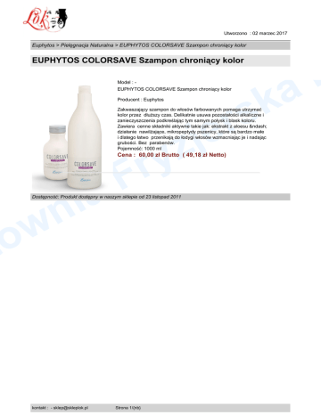 Utworzono : 02 marzec 2017 Euphytos > Pielęgnacja Naturalna > EUPHYTOS COLORSAVE Szampon chroniący kolor L a EUPHYTOS COLORSAVE Szampon chroniący kolor Model : - k s r EUPHYTOS COLORSAVE Szampon chroniący kolor Producent : Euphytos Zakwaszający szampon do włosów farbowanych pomaga utrzymać kolor przez dłuższy czas. Delikatnie usuwa pozostałości alkaliczne i zanieczyszczenia podkreślając tym samym połysk i blask koloru. Zawiera cenne składniki aktywne takie jak: ekstrakt z aloesu – działanie nawilżające, mikropeptydy pszenicy, które są bardzo małe i dlatego łatwo przenikają do łodygi włosów wzmacniając je i nadając grubości. Bez parabenów. Pojemność: 1000 ml e j z y r F Cena : 60,00 zł Brutto ( 49,18 zł Netto) a i n w to Dostępność: Produkt dostępny w naszym sklepie od 23 listopad 2011 kontakt : - [email protected] Strona 1/{nb}