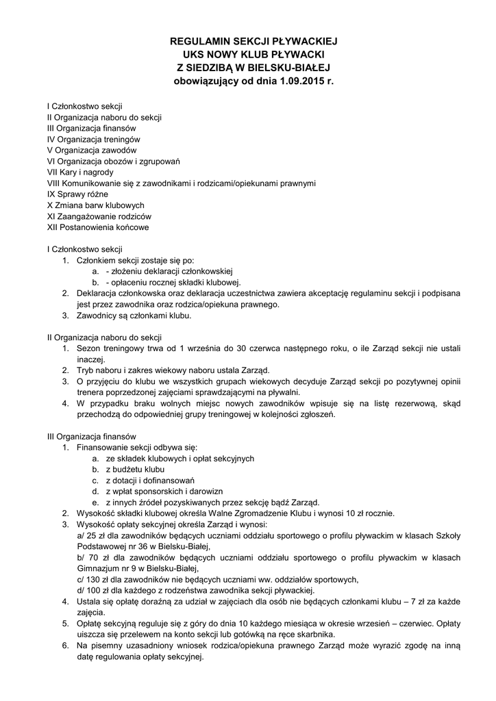 REGULAMIN SEKCJI PŁYWACKIEJ UKS NOWY KLUB PŁYWACKI Z SIEDZIBĄ W BIELSKU-BIAŁEJ obowiązujący od dnia 1.09.2015 r. I Członkostwo sekcji II Organizacja naboru do sekcji III Organizacja finansów IV Organizacja treningów V Organizacja zawodów VI Organizacja obozów i zgrupowań VII Kary i nagrody VIII Komunikowanie się z zawodnikami i rodzicami/opiekunami prawnymi IX Sprawy różne X Zmiana barw klubowych XI Zaangażowanie rodziców XII Postanowienia końcowe I Członkostwo sekcji 1. Członkiem sekcji zostaje się po: a. - złożeniu deklaracji członkowskiej b. - opłaceniu rocznej składki klubowej. 2. Deklaracja członkowska oraz deklaracja uczestnictwa zawiera akceptację regulaminu sekcji i podpisana jest przez zawodnika oraz rodzica/opiekuna prawnego. 3. Zawodnicy są członkami klubu. II Organizacja naboru do sekcji 1. Sezon treningowy trwa od 1 września do 30 czerwca następnego roku, o ile Zarząd sekcji nie ustali inaczej. 2. Tryb naboru i zakres wiekowy naboru ustala Zarząd. 3. O przyjęciu do klubu we wszystkich grupach wiekowych decyduje Zarząd sekcji po pozytywnej opinii trenera poprzedzonej zajęciami sprawdzającymi na pływalni. 4. W przypadku braku wolnych miejsc nowych zawodników wpisuje się na listę rezerwową, skąd przechodzą do odpowiedniej grupy treningowej w kolejności zgłoszeń. III Organizacja finansów 1. Finansowanie sekcji odbywa się: a. ze składek klubowych i opłat sekcyjnych b. z budżetu klubu c. z dotacji i dofinansowań d. z wpłat sponsorskich i darowizn e. z innych źródeł pozyskiwanych przez sekcję bądź Zarząd. 2. Wysokość składki klubowej określa Walne Zgromadzenie Klubu i wynosi 10 zł rocznie. 3. Wysokość opłaty sekcyjnej określa Zarząd i wynosi: a/ 25 zł dla zawodników będących uczniami oddziału sportowego o profilu pływackim w klasach Szkoły Podstawowej nr 36 w Bielsku-Białej, b/ 70 zł dla zawodników będących uczniami oddziału sportowego o profilu pływackim w klasach Gimnazjum nr 9 w Bielsku-Białej, c/ 130 zł dla zawodników nie będących uczniami ww. oddziałów sportowych, d/ 100 zł dla każdego z rodzeństwa zawodnika sekcji pływackiej. 4. Ustala się opłatę doraźną za udział w zajęciach dla osób nie będących członkami klubu – 7 zł za każde zajęcia. 5. Opłatę sekcyjną reguluje się z góry do dnia 10 każdego miesiąca w okresie wrzesień – czerwiec. Opłaty uiszcza się przelewem na konto sekcji lub gotówką na ręce skarbnika. 6. Na pisemny uzasadniony wniosek rodzica/opiekuna prawnego Zarząd może wyrazić zgodę na inną datę regulowania opłaty sekcyjnej. 7. Nieobecność na zajęciach nie upoważnia do pomniejszenia opłaty sekcyjnej. Opłaty sekcyjne i składka klubowa nie podlegają zwrotowi. 8. W przypadku kontuzji lub choroby skutkującej nieobecnością na zajęciach przez cały miesiąc kalendarzowy i udokumentowanej przez lekarza obniża się opłatę sekcyjną w kolejnym miesiącu o połowę. 9. W przypadkach uzasadnionych ciężkimi wydarzeniami losowymi Zarząd może odstąpić od pobrania opłaty sekcyjnej na pisemny wniosek rodzica. 10. Z budżetu sekcji finansuje się: a. wynajem pływalni b. wynagrodzenie trenerów c. opłaty związane z bieżącym funkcjonowaniem sekcji d. opłaty statutowe Polskiego Związku Pływackiego i Okręgowego Związku Pływackiego e. komunikaty i listy startowe na zawodach f. zakup sprzętu treningowego g. inne wydatki niezbędne do funkcjonowania sekcji 11. Sekcja pokrywa koszty opłat startowych zawodników reprezentujących klub w mistrzostwach okręgu i mistrzostwach Polski i innych imprezach centralnych. 12. Sekcja dofinansowuje uczestnictwo w mistrzostwach Polski od 14 roku życia w wysokości kosztów pobytu 1 dnia, w przypadku udziału w finale B – dwóch dni, udziału w finale A – trzech dni. 13. Po zakończeniu sezonu skarbnik przedstawia dokumentację finansową do wglądu Komisji Rewizyjnej i Prezesowi Klubu. 14. Rodzice/opiekunowie prawni finansują: a. opłatę klubową i opłaty sekcyjne b. wyposażenie pływackie (we własnym zakresie) – 2 pary okularków, 2 czepki, 2 stroje pływackie, klapki , płetwy c. odzież klubową – koszulka i bluza dresowa, ewentualnie czepek d. opłaty startowe oraz koszty transportu i pobytu na zawodach e. obowiązkowe badania lekarskie f. ubezpieczenie zawodników g. licencje zawodnicze h. obozy i zgrupowania. 15. W przypadku możliwości finansowych klubu Zarząd może ustalić dofinansowanie wydatków przypadających na rodziców. IV Organizacja treningów 1. Przed rozpoczęciem sezonu Zarząd w porozumieniu z trenerami ustala podział na grupy treningowe. 2. Treningi odbywają się na obiektach sportowych Zespołu Szkół Ogólnokształcących im. Armii Krajowej na Osiedlu Beskidzkim w Bielsku-Białej oraz na Pływalni AQUA przy ul. Langiewicza w Bielsku-Białej. W ramach rocznego cyklu treningowego zajęcia mogą odbywać się w innych ustalonych przez trenerów miejscach. 3. Do zajęć dopuszczany zostaje zawodnik: a. po złożeniu podpisanej deklaracji członkowskiej/uczestnictwa b. po uiszczeniu rocznej składki klubowej c. bez zaległości w opłatach sekcyjnych d. posiadający ważne badania lekarskie potwierdzone przez uprawnionego lekarza medycyny sportowej e. zdrowy w dniu treningu – bez trwających infekcji wirusowych, grzybiczych chorób skóry, kłopotów oddechowych itp. 4. Zawodnik zalegający z opłatami sekcyjnymi do dnia 15-tego danego miesiąca nie zostaje dopuszczony do zajęć. 5. Zawodnik stawia się na trening na 10 minut przed jego rozpoczęciem z niezbędnym wyposażeniem pływackim: strój pływacki, czepek, okularki, płetwy, ręcznik oraz kompletem zapasowym. 6. Zawodnik zobowiązany jest do: a. kulturalnego i zgodnego z wewnętrznym regulaminem zachowania się na terenie obiektu b. koleżeńskiego zachowania wobec innych zawodników c. bezwzględnego wykonywania poleceń trenera dotyczących organizacji zajęć d. zgłaszania trenerowi 