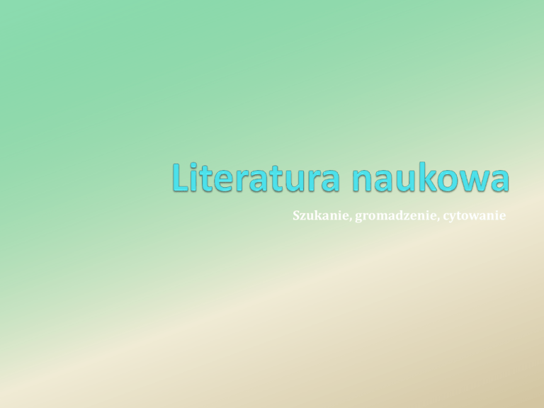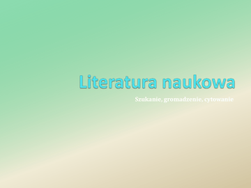 Szukanie, gromadzenie, cytowanie Zasady Wszelkie informacje w pracy, dotyczą informacji a obiekcie badań i których nie wykazujemy w części „wyniki” powinny pochodzić z literatury naukowej. Literatura naukowa - to wszystko co posiada: 1. Autora 2. Tytuł 3. Wydawcę 4. Rok wydania / datę ostatniej modyfikacji Literaturą naukową nie są strony internetowe, za wyjątkiem tych, które posiadają autora, tytuł, wydawcę i rok wydania. W pracach dyplomowych nie powołujemy się na Wikipedię, EOL i inne nawet wiarygodne strony internetowe (źródła wtórne), fora dyskusyjne, prywatne strony różnych osób, choć niekiedy są jedynymi miejscami, gdzie znajduje się dana informacja. Z takich informacji trzeba wtedy rezygnować. Skąd bierzemy literaturę Wykazy interesującej literatury znajdujemy w EOL, Wikipedii, innych pokazywanych wcześniej stronach internetowych. Trzeba dotrzeć do tych artykułów i książek. Biblioteka Biblioteka www.biol.uw.edu.pl/library Artykuły cytowane w znalezionych pracach Google search, strony autorów pracy, przesłanie prośby o artykuł do autora korespondencyjnego (dotyczy ostatnio wydanych artykułów) Szukanie osób zajmujących się danym tematem i korzystanie z ich zgromadzonej literatury Gromadzenie znalezionej literatury Utworzyć sobie folder o nazwie „Literatura dotycząca ….”. W pliku tym gromadzić będziemy PDFy artykułów naukowych dotyczących danego zagadnienia. Utworzyć nowy plik worda. Dać mu tytuł typu „Wykaz literatury o ….”. Wstawić tabelę o pięciu kolumnach i 21 wierszach. Pierwszą kolumnę zatytułować Autorzy, drugą – Rok, trzecią – Tytuł, czwartą – Źródło, piątą – Uwagi. W każdym wierszu wstawiać będziemy notkę biograficzną znalezionego artykułu. Prywatna biblioteka Katalog prywatnej biblioteki Zadanie Zadaniem studentów będzie zgromadzenie: 1. około 15 artykułów naukowych znajdujących się w bazach internetowych dotyczących biologii, behawioru, występowania, zagrożeń i ewentualnie zaszeregowania taksonomicznego badanego gatunku / rodzaju / rodziny 2. około 5 artykułów dotyczących stężenia analizowanego pierwiastka/związku w organizmach należących do danego rzędu (w niektórych wypadkach gromady, a w innych rodziny) Skopiowanie artykułów do swojego folderu Uwaga! Przy kopiowaniu każdego artykułu jednocześnie kopiujemy notkę biograficzną do pliku wordowego z wykazem literatury Całą notkę wstawiamy jako tekst nieformatowany do środkowej kolumny, przenosimy autorów do pierwszej kolumny, a nazwę czasopisma, numer, datę wydania, strony do trzeciej Artykuły zacytowane w Wikipedii, EOL, ADW i stronach internetowych gromadzących informacje 1. Skopiować wykazy literatury z EOL i innych źródeł internetowych do pliku wordowego 2. Wyselekcjonować artykuły naukowe i zaznaczyć je na czerwono. 3. Sprawdzić czy artykuły te są dostępne w naszej bibliotece poprzez listę czasopism A-Z. 4. Ściągnąć ich PDF znalezionych artykułów i zapamiętać je w zrobionym katalogu. 5. Zrobić notatkę o artykule w „Wykazie literatury” JAK TO ZROBIĆ DLA SKUNKSA? Elsevier/ICM ELSEVIER/ICM - wyszukiwarka artykułów z ok. 2000 czasopism wydawanych przez Elsevier i Springer Uruchomić. Przejść na search (ściślej advanced search). Wpisać angielska nazwę analizowanego gatunku/rodzaju/rodziny. Kliknąć submit query. Policzyć ile stron z pracami wydanymi po 1995 ukazało się, zwrócić uwagę na kolejność artykułów. Zawęzić pole poszukiwań do abstraktu, tytułu, słów kluczowych, policzyć liczbę stron. Wpisać angielska nazwę analizowanego związku/pierwiastka dodać concentration, policzyć liczbę stron. Zawęzić poszukiwania do rzędu lub rodziny analizowanego gatunku. ISSN - International Standard Serial Number - ośmiocyfrowy niepowtarzalny identyfikator wydawnictw ciągłych tradycyjnych oraz elektronicznych PII - Personally Identifiable Information Elsevier/ICM Przykłady selekcji wykonane w systemie expert Zapytanie Liczba stron ( title=(mus musculus) ) 211 (title=(mus musculus) OR title=(mouse) OR title=(mice) ) 83086 ((title=(mus musculus) OR title=(mouse) OR title=(mice) ) AND title=(population)) 256 (((title=(mus musculus) OR title=(mouse) OR title=(mice) ) AND title=(population)) NOT (title=(gene) OR title=(genetics) OR title=(chromosome) OR title=(enzyme))) 228 Przy większej liczbie nawiasów wyszukiwarka robi błędy Jstor Jstor – płatna, biblioteka cyfrowa artykułów naukowych. Obejmuje 1700 tytułów, w tym wiele z lat sprzed 1995 roku. Uwaga – tylko 10% tytułów ma wprowadzone do bazy Jstor abstrakty. Szukanie poprzez abstrakty nie ma sensu. Baza Jstor jest możliwa do przeglądania dla niezarejestrowanych użytkowników. Nie udostępnia wtedy tekstu artykułów. Uruchomić. Znaleźć artykuły dotyczące analizowanego gatunku/rodzaju/rodziny. Znaleźć artykuły dotyczące stężenia analizowanego związku/pierwiastka w organizmach należących do tego samego rzędu lub rodziny co analizowany gatunek. ProQuest ProQuest – podobna „firma” jak Jstor, ale znacznie młodsza. Działa od 2009 roku. Ma lepiej rozbudowany dział informatyczny i szerszy zakres baz czasopism i artykułów. Niestety gromadzi też artykuły nienaukowe. Ale na szczęście można ograniczyć selekcję do artykułów naukowych W naszej bibliotece jest polskojęzyczna wersja wyszukiwarki. Uruchomić. Zaznaczyć pełny tekst i recenzowane Znaleźć artykuły dotyczące analizowanego gatunku/rodzaju/rodziny. Zawęzić poszukiwania do artykułów naukowych Znaleźć artykuły dotyczące stężenia analizowanego związku/pierwiastka w organizmach należących do tego samego rzędu lub rodziny co analizowany gatunek. Zawęzić poszukiwania do artykułów naukowych Inne bazy danych w serwisie biblioteki Wyszukiwarka tematyczna BioMed central Cambridge Journals EBSCOhost HighWire Press PubMed Centra Journals Wiley Online Library Brak wyszukiwarki