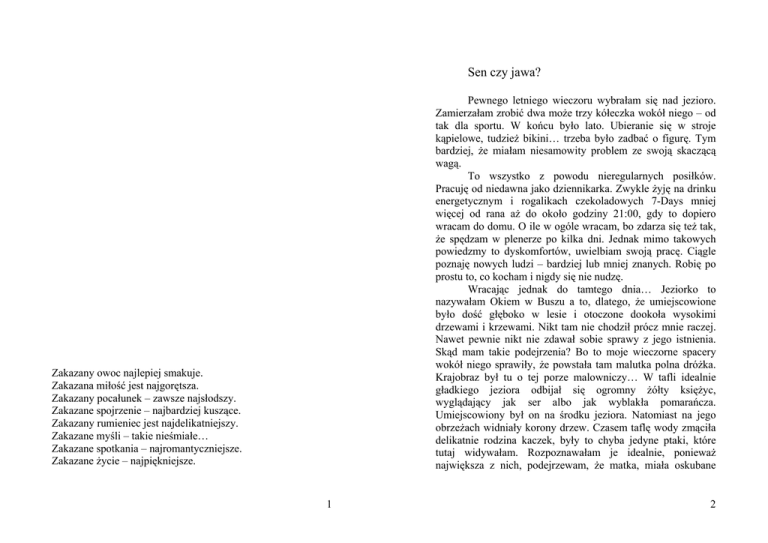 Sen czy jawa? Pewnego letniego wieczoru wybrałam się nad jezioro. Zamierzałam zrobić dwa może trzy kółeczka wokół niego – od tak dla sportu. W końcu było lato. Ubieranie się w stroje kąpielowe, tudzież bikini… trzeba było zadbać o figurę. Tym bardziej, że miałam niesamowity problem ze swoją skaczącą wagą. To wszystko z powodu nieregularnych posiłków. Pracuję od niedawna jako dziennikarka. Zwykle żyję na drinku energetycznym i rogalikach czekoladowych 7-Days mniej więcej od rana aż do około godziny 21:00, gdy to dopiero wracam do domu. O ile w ogóle wracam, bo zdarza się też tak, że spędzam w plenerze po kilka dni. Jednak mimo takowych powiedzmy to dyskomfortów, uwielbiam swoją pracę. Ciągle poznaję nowych ludzi – bardziej lub mniej znanych. Robię po prostu to, co kocham i nigdy się nie nudzę. Wracając jednak do tamtego dnia… Jeziorko to nazywałam Okiem w Buszu a to, dlatego, że umiejscowione było dość głęboko w lesie i otoczone dookoła wysokimi drzewami i krzewami. Nikt tam nie chodził prócz mnie raczej. Nawet pewnie nikt nie zdawał sobie sprawy z jego istnienia. Skąd mam takie podejrzenia? Bo to moje wieczorne spacery wokół niego sprawiły, że powstała tam malutka polna dróżka. Krajobraz był tu o tej porze malowniczy… W tafli idealnie gładkiego jeziora odbijał się ogromny żółty księżyc, wyglądający jak ser albo jak wyblakła pomarańcza. Umiejscowiony był on na środku jeziora. Natomiast na jego obrzeżach widniały korony drzew. Czasem taflę wody zmąciła delikatnie rodzina kaczek, były to chyba jedyne ptaki, które tutaj widywałam. Rozpoznawałam je idealnie, ponieważ największa z nich, podejrzewam, że matka, miała oskubane Zakazany owoc najlepiej smakuje. Zakazana miłość jest najgorętsza. Zakazany pocałunek – zawsze najsłodszy. Zakazane spojrzenie – najbardziej kuszące. Zakazany rumieniec jest najdelikatniejszy. Zakazane myśli – takie nieśmiałe… Zakazane spotkania – najromantyczniejsze. Zakazane życie – najpiękniejsze. 1 2 nieco prawe skrzydło. Zapewne została kontuzjowana w walce z jakimś drapieżnikiem broniąc czterech mniejszych kaczuszek. Lubiłam przesiadywać sobie pod jednym z drzew i przyglądać się temu całemu widokowi. Gdybym potrafiła malować, to już na pewno miałabym taki obraz na całej ścianie, aby móc oglądać go w dzień i w nocy. Bardzo mnie to wyciszało. Było tak spokojnie… Wiatr szeptał mi do ucha jakąś nieznaną mi melodię złożoną z ćwierkania ptaków leśnych i szelestu liści w powietrzu. Nigdy nie słyszałam chyba niczego piękniejszego. Każdy dźwięk pieścił moje bębenki słuchowe. Po prostu coś wspaniałego! Żaden Beethoven, Chopin czy Vivaldi nigdy w życiu nie potrafiliby stworzyć czegoś tak idealnego jak natura, która jest perfekcyjna sama w sobie. Długo siedziałam tak pod drzewem na swojej turkusowej bluzie od dresu. Nie wiem ile czasu minęło, ponieważ powietrze nie zdawało się ochładzać, wręcz przeciwnie miałam wrażenie, że robi się coraz cieplej. Stwierdziłam, że wskoczę do wody, tak dla odprężenia. Rozebrałam się do naga. Często tak robiłam tutaj. Czułam się tak niesamowicie swobodnie… i bezpiecznie. Wskoczyłam do wody na główkę. Rodzina kaczuszek raptownie skręciła w drugą stronę i skierowała się w jak najodleglejszy koniec jeziora. Uwielbiam to uczucie, gdy moje gorące, rozżarzone i zmęczone ciało pokrywa nagle delikatna powłoka ciepłej wody, która chłodzi je, ale nie sprawia, że jest mi zimno, a przy tym rozluźnia moje spięte mięśnie. W wodzie czuję się człowiek taki lekki, jak gdyby nic nie ważył. Żadne kremy ani inne wyroby chemiczne nie dawały takiego efektu soft skin. Jednak, gdy zauważyłam, że moje palce u dłoni nadmiernie zaczynają się marszczyć, gdyż za długo przebywały w wodzie, stwierdziłam, że czas wyjść z jeziora. Oczywiście nie trudno było mi odnaleźć miejsce, w którym się rozebrałam, ponieważ swoje rzeczy zawsze zostawiałam pod tym samym wielkim dębem, którego kora była pokryta do połowy mchem, zaś obok niego stał krzaczek z jagodami. Ale, gdy wydostałam się z Oczka moich ubrań tam nie było! Ktoś je ukradł! Zostawiając natomiast ręcznik. Wystraszyłam się. Zaczęłam rozglądać się w panice mając nadzieję, że znajdę kogokolwiek, kto mógłby być za to odpowiedzialny, bądź zauważyłabym jakiś cień człowieka, który mógłby to wszystko widzieć. Krzyk nie miał sensu. W pobliżu nie było żadnej żywej duszy… ale jednak? Jednak ktoś tu był w ciągu ostatnich kilku minut. A może wciąż jest? Okryłam się ręcznikiem... którego osobnik musiał najwidoczniej zostawić… Wytarłam swoje mokre ciało, a następnie zasłoniłam je nim… nie ze wstydu przed swoją nagością, a przez to, że zrobiło mi się zimno. Był różowy i bardzo miękki… Ktoś idealnie trafił w mój gust. Do tego pachniał lawendą… Zostawiono mi również buty. Uff.. Przynajmniej nie będę musiała wracać na boso po tych wszystkich badylach i robalach i innych dziwnych rzeczach żyjących i pełzających po leśnej ścieżce. Po wzięciu kilku oddechów postanowiłam ruszyć naprzód. Szłam dość powoli, ponieważ w tym ręczniku było mi strasznie niewygodnie, krępował moje ruchy. Zazwyczaj wracałam do domu truchtem, jednak w tym wypadku było to niemożliwe. Dlatego też droga dłużyła mi się niezmiernie. Zwykle zajmowała mi pół godziny, dzisiaj pół godziny zajęło mi przejście może jednej czwartej. Cały czas bacznie rozglądałam się na boki mając nadzieję ujrzeć tego złodzieja, który postanowił sobie zabrać moje rzeczy. W ogóle, co za głupota kraść jakiś stary, przepocony turkusowy dresik i damską bieliznę? No dobra, może spodobała mu się moja różowa 3 4 koronka. To jeszcze zrozumiem. Pewnie to facet w takim razie… Ale po co mu do cholery mój przepoc