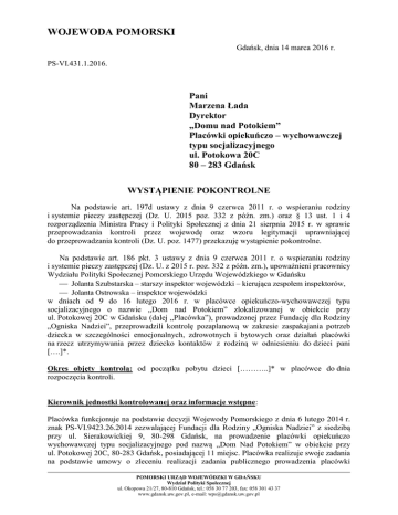 WOJEWODA POMORSKI Gdańsk, dnia 14 marca 2016 r. PS-VI.431.1.2016. Pani Marzena Łada Dyrektor „Domu nad Potokiem” Placówki opiekuńczo – wychowawczej typu socjalizacyjnego ul. Potokowa 20C 80 – 283 Gdańsk WYSTĄPIENIE POKONTROLNE Na podstawie art. 197d ustawy z dnia 9 czerwca 2011 r. o wspieraniu rodziny i systemie pieczy zastępczej (Dz. U. 2015 poz. 332 z późn. zm.) oraz § 13 ust. 1 i 4 rozporządzenia Ministra Pracy i Polityki Społecznej z dnia 21 sierpnia 2015 r. w sprawie przeprowadzania kontroli przez wojewodę oraz wzoru legitymacji uprawniającej do przeprowadzania kontroli (Dz. U. poz. 1477) przekazuję wystąpienie pokontrolne. Na podstawie art. 186 pkt. 3 ustawy z dnia 9 czerwca 2011 r. o wspieraniu rodziny i systemie pieczy zastępczej (Dz. U. z 2015 r. poz. 332 z późn. zm.), upoważnieni pracownicy Wydziału Polityki Społecznej Pomorskiego Urzędu Wojewódzkiego w Gdańsku Jolanta Szubstarska – starszy inspektor wojewódzki – kierująca zespołem inspektorów, Jolanta Ostrowska – inspektor wojewódzki w dniach od 9 do 16 lutego 2016 r. w placówce opiekuńczo-wychowawczej typu socjalizacyjnego o nazwie „Dom nad Potokiem” zlokalizowanej w obiekcie przy ul. Potokowej 20C w Gdańsku (dalej „Placówka”), prowadzonej przez Fundację dla Rodziny „Ogniska Nadziei”, przeprowadzili kontrolę pozaplanową w zakresie zaspakajania potrzeb dziecka w szczególności emocjonalnych, zdrowotnych i bytowych oraz działań placówki na rzecz utrzymywania przez dziecko kontaktów z rodziną w odniesieniu do dzieci pani [….]*. Okres objęty kontrolą: od początku pobytu dzieci [………..]* w placówce do dnia rozpoczęcia kontroli. Kierownik jednostki kontrolowanej oraz informacje wstępne: Placówka funkcjonuje na podstawie decyzji Wojewody Pomorskiego z dnia 6 lutego 2014 r. znak PS-VI.9423.26.2014 zezwalającej Fundacji dla Rodziny „Ogniska Nadziei” z siedzibą przy ul. Sierakowickiej 9, 80-298 Gdańsk, na prowadzenie placówki opiekuńczo wychowawczej typu socjalizacyjnego pod nazwą „Dom Nad Potokiem” w obiekcie przy ul. Potokowej 20C, 80-283 Gdańsk, posiadającej 11 miejsc. Placówka realizuje swoje zadania na podstawie umowy o zleceniu realizacji zadania publicznego prowadzenia placówki POMORSKI URZĄD WOJEWÓDZKI W GDAŃSKU Wydział Polityki Społecznej ul. Okopowa 21/27, 80-810 Gdańsk, tel.: 058 30 77 203, fax: 058 301 43 37 www.gdansk.uw.gov.pl, e-mail: [email protected] opiekuńczo-wychowawczej typu socjalizacyjnego, zawartej z ogłaszającym konkurs, zgodnie z Zarządzeniem Nr 1764/14 Prezydenta Miasta Gdańska z dnia 31 grudnia 2014 roku w sprawie rozstrzygnięcia otwartego konkursu ofert na realizację w latach 2015 – 2017 zadań z zakresu pomocy społecznej, wspierania rodziny i systemu pieczy zastępczej, przeciwdziałania przemocy w rodzinie oraz profilaktyki rozwiązywania problemów alkoholowych, których adresatami są mieszkańcy Gdańska, ogłoszonego na podstawie Zarządzenia Nr 1554/14 Prezydenta Miasta Gdańska z dnia 17 listopada 2014 r. Podmiotem prowadzącym placówkę jest, jak wskazano powyżej, Fundacja dla Rodziny „Ogniska Nadziei” prowadząca, poza kontrolowaną placówką, jeszcze jedną placówkę opiekuńczo - wychowawcza typu socjalizacyjnego. Dyrektorem placówki, zgodnie z art. 97 ust. 2a ustawy o wspieraniu rodziny i systemie pieczy zastępczej (dalej „ustawa”) jest pani Marzena Łada. Dyrektor kieruje placówką przy pomocy wyznaczonego wychowawcy, wskazanym w Regulaminie Organizacyjnym Placówki jako koordynator zespołu wychowawców. W okresie podlegającym kontroli w „Domu Nad Potokiem” funkcje te sprawowały: pani [………]*, a od grudnia 2015 r. pani Helena Zielińska. Placówka funkcjonuje w oparciu o Regulamin Organizacyjny [akta kontroli str. 1934], opracowany przez dyrektora placówki z dniem 9.02.2015 r. W regulaminie, oprócz formalnych podstaw funkcjonowania i organizacji placówki, zawarto także zapisy poświęcone jej wychowankom. Określono zasady i podstawy przyjmowania dzieci do „Domu Nad Potokiem”, zasady urlopowania do domu rodzinnego, samowolnego opuszczania placówki. W regulaminie zawarto także uregulowania dotyczące obszaru praw i obowiązków dzieci oraz zakres zobowiązań placówki. Ponadto, w regulaminie znajdują się odniesienia do pracowników i wolontariuszy, zatrudnianych w placówce oraz prowadzonej dokumentacji dziecka. W kontrolowanej placówce przyjęte zostały jeszcze inne dokumenty, uszczegółowiające wewnętrzne zasady funkcjonowania. Należą do nich: Regulamin przyznawania kieszonkowego wychowankom „Domu Nad Potokiem” Fundacji dla Rodziny „Ogniska Nadziei”, Regulamin i godziny odwiedzin rodziców, osób zaprzyjaźnionych w „Domu Nad Potokiem”, a także indywidualna informacja dla wychowanków o nazwie „Co powinien wiedzieć i wprowadzać w czyn każdy mieszkaniec „Domu Nad Potokiem” aby się nam wszystkim lepiej żyło” [akta kontroli str. 35-39]. W toku kontroli ustalono, że dokumenty zostały tak formułowane, aby wszyscy wychowankowie rozumieli ustalenia w nich zawarte. Napisane są dostępnym i zrozumiałym słownictwem i każdy wychowanek zapoznawany jest z nimi indywidualnie. Oceny działalności placówki w kontrolowanym zakresie dokonano na podstawie analizy dokumentacji indywidualnej dzieci, rozmów z dyrektorem, koordynatorem i wychowawcami placówki, rozmów z dziećmi, oględzin obiektu placówki, obserwacji dzieci, przedłożonych do kontroli, przygotowanych wykazów informacji. Ocena skontrolowanej działalności Działalność placówki opiekuńczo – wychowawczej typu socjalizacyjnego „Dom Nad Potokiem” w zakresie podlegającym kontroli oceniono pozytywnie. 1. Sytuacja prawna i opiekuńcza dzieci pani Izabeli Kubackiej W toku czynności kontrolnych ustalono, że […………….]* jest matką ośmiorga dzieci. Troje rodzeństwa: […………..]* w placówce opiekuńczo – wychowawczej typu socj