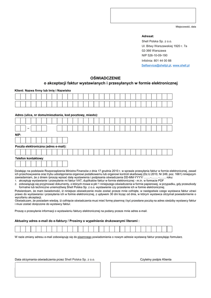 Miejscowość, data Adresat: Shell Polska Sp. z o.o. Ul. Bitwy Warszawskiej 1920 r. 7a 02-366 Warszawa NIP 526-10-09-190 Infolinia: 801 44 00 88 [email protected], www.shell.pl OŚWIADCZENIE o akceptacji faktur wystawianych i przesyłanych w formie elektronicznej Klient: Nazwa firmy lub Imię i Nazwisko Działając na podstawie Rozporządzenia Ministra Finansów z dnia 17 grudnia 2010 r. w sprawie przesyłania faktur w formie elektronicznej, zasad ich przechowywania oraz trybu udostępniania organowi podatkowemu lub organowi kontroli skarbowej (Dz.U.2010, Nr 249, poz. 1661) niniejszym zawiadamiam, że z dniem /proszę wpisać datę wystawienia i podpisania oświadczenia DD-MM-YYYY/ ….…-……. -……. roku: 1. akceptuję wystawianie i przesyłanie mi faktur VAT, duplikatów faktur w formie elektronicznej - m.in. w formacie PDF 2. zobowiązuję się przyjmować dokumenty, o których mowa w pkt 1 niniejszego oświadczenia w formie papierowej, w przypadku, gdy przeszkody formalne lub techniczne uniemożliwią Shell Polska Sp. z o.o. wystawienie czy przesłanie ich w formie elektronicznej. Potwierdzam, że mam świadomość, iż niniejsze oświadczenie może zostać przeze mnie cofnięte, w następstwie czego wystawca faktur utraci prawo do wystawiania i przesyłania ich w formie elektronicznej, z upływem 30 dni licząc od dnia, w którym wystawca otrzymał powiadomienie o wycofaniu akceptacji. Oświadczam, że posiadam wiedzę, iż cofnięcie oświadczenia musi mieć formę pisemną i być przesłane pocztą na adres siedziby wystawcy faktur i musi zostać doręczone do wystawcy faktur. Proszę o przesyłanie informacji o wystawieniu faktury elektronicznej na podany przeze mnie adres e-mail. Aktualny adres e-mail do e-faktury / Prosimy o wypełnienie drukowanymi literami : W razie zmiany adresu e-mail zobowiązuję się do pisemnego powiadomienia o nowym adresie wystawcę faktur przesyłając formularz. Data otrzymania oświadczenia przez Shell Polska Sp. z o.o. Czytelny podpis Klienta