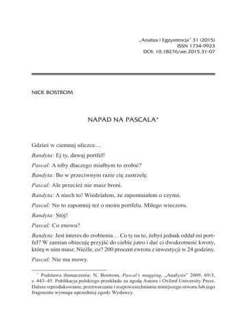 „Analiza i Egzystencja” 31 (2015) ISSN 1734-9923 DOI: 10.18276/aie.2015.31-07 NICK BOSTROM NAPAD NA PASCALA* Gdzieś w ciemnej uliczce… Bandyta: Ej ty, dawaj portfel! Pascal: A niby dlaczego miałbym to zrobić? Bandyta: Bo w przeciwnym razie cię zastrzelę. Pascal: Ale przecież nie masz broni. Bandyta: A niech to! Wiedziałem, że zapomniałem o czymś. Pascal: No to zapomnij też o moim portfelu. Miłego wieczoru. Bandyta: Stój! Pascal: Co znowu? Bandyta: Jest interes do zrobienia… Co ty na to, żebyś jednak oddał mi portfel? W zamian obiecuję przyjść do ciebie jutro i dać ci dwukrotność kwoty, którą w nim masz. Nieźle, co? 200 procent zwrotu z inwestycji w 24 godziny. Pascal: Nie ma mowy. * Podstawa tłumaczenia: N. Bostrom, Pascal’s mugging, „Analysis” 2009, 69/3, s. 443–45. Publikacja polskiego przekładu za zgodą Autora i Oxford University Press. Dalsze reprodukowanie, przetwarzanie i rozpowszechnianie niniejszego utworu lub jego fragmentu wymaga uprzedniej zgody Wydawcy. 136 Nick Bostrom Bandyta: Aaa… pewnie mi nie wierzysz, że faktycznie to zrobię? Ostrożności nigdy za wiele w dzisiejszych czasach… To powiem ci tak: dajesz mi portfel, a ja przychodzę do ciebie jutro i płacę ci 10 razy tyle. Pascal: Przykro mi. Bandyta: Rozumiem, ale pozwól, że cię o coś zapytam. Jest wielu oszustów, ale zdarzają się i uczciwi ludzie. Jakie jest twoim zdaniem prawdopodobieństwo hipotezy, że dotrzymam słowa? Pascal: Jak jeden do 1000? Bandyta: Świetnie! No to dawaj portfel, a dostaniesz ode mnie jutro 2000 razy tyle, ile w nim jest. Wartość oczekiwana jest dla ciebie bardzo korzystna. Pascal: Mam w portfelu 10 liwrów. Jeśli dobilibyśmy targu, żebyś wziąłbyś mój portfel i przyniósł mi jutro 10 razy tyle, ile liczy jego zawartość, to być może faktycznie byłaby szansa, jedna na 1000, że zobaczyłbym te 100 liwrów, które byłbyś mi dłużny. Ale szanse, że przyniesiesz mi jutro 20 000 liwrów są znacznie mniejsze. Wątpię, żebyś miał takie pieniądze. Bandyta: Twój sceptycyzm jest zrozumiały, jednak w tym konkretnym przypadku wydaje się chybiony. Jeśli się nie mylę, mam przyjemność z Blaise’em Pascalem? Słyszałem, że jesteś zagorzałym zwolennikiem maksymalizowania oczekiwanej użyteczności i że według ciebie funkcja użyteczności pozwala sumować wartości kolejnych szczęśliwych dni życia? Nieprawdaż? Pascal: To prawda. Moim zdaniem funkcja użyteczności jest nieograniczona. Uznaję też, że dwa szczęśliwe dni są dwa razy tak dobre jak jeden; a 2000 dni – dwa razy tak dobre jak 1000. Nie uznaję awersji do ryzyka ani dyskontowania. Bandyta: Świetnie. Nie musiałeś mi tego mówić, ale to ułatwia sprawę. W takim razie mam dla ciebie dobrą wiadomość! Jestem obdarzony magicznymi zdolnościami. Mogę dać ci dowolną skończoną sumę pieniędzy, o jaką poprosisz dziś wieczór. Co więcej, mogę dać ci dowolną skończoną ilość użyteczności, jaką zechcę ci dziś obiecać. Pascal: Ale dlaczego miałbym ci wierzyć? Bandyta: Zaufaj mi! Rozumiem, że to nie jest rozstrzygające świadectwo, ale z pewnością przemawia choć trochę na rzecz prawdziwości tego, co mówię. Zapewniam cię, że naprawdę mam te zdolności. Napad na Pascala 137 Pascal: Twoje dzisiejsze zachowanie nie wzbudza we mnie przekonania o twojej uczciwości. Bandyta: Dobrze, już dobrze, pełna zgoda. Ale czy nie jest możliwe, że mówię prawdę? Pascal: Jest możliwe, że masz magiczne zdolności, o których zapewniasz, ale muszę powiedzieć, że przypisuję temu bardzo, bardzo małe prawdopodobieństwo. Bandyta: W porządku. Ale powiedz mi dokładnie, jak bardzo małe? Pamiętaj, że możesz uważać tę propozycję za niewiarygodną, ale wszyscy jesteśmy omylni, nieprawdaż? I musisz przyznać, na podstawie tego, co już słyszałeś i widziałeś, że jestem raczej nietypowym bandytą. Spójrz na moje blade oblicze, na moje ciemne oczy; na to, że jestem ubrany na czarno od stóp do głów. To znaki charakterystyczne Spekulanta Siódmego Wymiaru. To stamtąd przybywam i tam tkwi źródło magii. Pascal: O rety! Nie bierz tego do siebie, ale mój stopień przekonania, że masz zdolności, o których opowiadasz, jest jak jeden do kwadryliona. Bandyta: A niech mnie, jesteś bardzo pewny swoich zdolności odróżniania kłamcy od uczciwego człowieka! Ale to bez znaczenia. Pozwól, że zadam ci pytanie: jakie prawdopodobieństwo przypisałbyś nie tylko temu, że mam magiczne zdolności, ale także temu, że użyję ich, by spełnić dowolną obietnicę złożoną ci dziś wieczór – bez względu na to, jak ekstrawagancko hojna by się ona nie wydawała? Pascal: No cóż, jeśli faktycznie byłbyś Spekulantem Siódmego Wymiaru, jak twierdzisz, to nietrudno byłoby sobie wyobrazić, że możesz mieć rację w sprawie tego dodatkowego założenia. Więc powiedziałbym, że jak jeden do 10 kwadrylionów. Bandyta: Świetnie. To dokonajmy teraz obliczeń. Załóżmy, że 10 liwrów, które masz w portfelu, jest dla ciebie warte tyle, co jeden szczęśliwy dzień. Określmy tę ilość dobra 1 Utilem. Proszę cię więc o oddanie mi 1 Utila. W zamian mógłbym obiecać zrobienie jutro magicznej sztuczki, która da ci dodatkowe 10 kwadrylionów szczęśliwych dni, to jest 10 kwadrylionów Utili. Byłaby to uczciwa transakcja, ponieważ twierdzisz, że prawdopodobieństwo, iż spełnię swoją obietnicę, wynosi jeden do 10 kwadrylionów. Oczekiwana użyteczność byłaby dla ciebie równa zeru. Ale dziś wieczór jestem hojny i zaproponuję ci 138 Nick Bostrom lepszą transakcję: jeśli oddasz mi portfel, zrobię magiczną sztuczkę, która da ci dodatkowo 1000 kwadrylionów szczęśliwych dni życia. Pascal: Przyznaję, że nie widzę żadnego błędu w twoich obliczeniach. Bandyta: To moja ostateczna propozycja. Nie zamierzasz chyba przepuścić transakcji, która – jak przed chwilą obliczyliśmy – da ci 