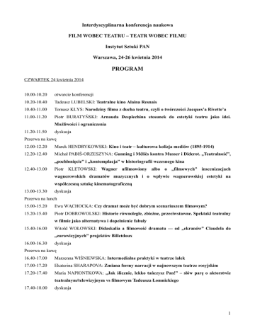 Interdyscyplinarna konferencja naukowa FILM WOBEC TEATRU – TEATR WOBEC FILMU Instytut Sztuki PAN Warszawa, 24-26 kwietnia 2014 PROGRAM CZWARTEK 24 kwietnia 2014 10.00-10.20 otwarcie konferencji 10.20-10.40 Tadeusz LUBELSKI: Teatralne kino Alaina Resnais 10.40-11.00 Tomasz KŁYS: Narodziny filmu z ducha teatru, czyli o twórczości Jacques’a Rivette’a 11.00-11.20 Piotr BURATYŃSKI: Arnauda Desplechina stosunek do estetyki teatru jako idei. Możliwości i ograniczenia 11.20-11.50 dyskusja Przerwa na kawę 12.00-12.20 Marek HENDRYKOWSKI: Kino i teatr – kulturowa kolizja mediów (1895-1914) 12.20-12.40 Michał PABIŚ-ORZESZYNA: Gunning i Méliès kontra Musser i Diderot. „Teatralność”, „pochłonięcie” i „kontemplacja” w historiografii wczesnego kina 12.40-13.00 Piotr KLETOWSKI: Wagner ufilmowiony albo o „filmowych” inscenizacjach wagnerowskich dramatów muzycznych i o wpływie wagnerowskiej estetyki na współczesną sztukę kinematograficzną 13.00-13.30 dyskusja Przerwa na lunch 15.00-15.20 Ewa WĄCHOCKA: Czy dramat może być dobrym scenariuszem filmowym? 15.20-15.40 Piotr DOBROWOLSKI: Historie równoległe, zbieżne, przeciwstawne. Spektakl teatralny w filmie jako alternatywa i dopełnienie fabuły 15.40-16.00 Witold WOŁOWSKI: Didaskalia a filmowość dramatu — od „ekranów” Claudela do „eurowizyjnych” projektów Billetdoux 16.00-16.30 dyskusja Przerwa na kawę 16.40-17.00 Marzenna WIŚNIEWSKA: Intermedialne praktyki w teatrze lalek 17.00-17.20 Ekaterina SHARAPOVA: Zmiana formy narracji w najnowszym teatrze rosyjskim 17.20-17.40 Maria NAPIONTKOWA: „Jak ślicznie, lekko tańczysz Pan!” – słów parę o aktorstwie teatralnym/telewizyjnym vs filmowym Tadeusza Łomnickiego 17.40-18.00 dyskusja 1 PIĄTEK 25 kwietnia 2014 9.00-9.20 Konrad WOJNOWSKI: Nareszcie wyjść z jaskini – krytyka esencjalizmu medialnego w teoriach filmu i teatru 9.20-9.40 Ewa BAL: Historyczna zmienność kategorii „nażywości” w relacji teatru i kina na przykładzie sposobów ukazywania cielesności w teatralnych, kinowych i dramatycznych dziełach Piera Paola Pasoliniego 9.40-10.00 Katarzyna FAZAN: Iluzja, powtórzenie, rozproszenie obrazowe w polskim teatrze nowoczesnym. Między obecnością żywą i filmowo zapośredniczoną 10.00-10.30 dyskusja Przerwa na kawę 10.40-11.00 Joanna JOPEK: Dream Factory. Gry z medium filmowym w teatrze Krzysztofa Garbaczewskiego 11.00-11.20 Marcin KOŚCIELNIAK: „IWONA” THE MOVIE. Pogranicze teatru i filmu w Iwonie, księżniczce Burgunda Krzysztofa Garbaczewskiego 11.20-11.40 Monika BŁASZCZAK: Filmowe cytaty w teatralnej dekoracji – o Dyskretnym uroku burżuazji Marcina Libera 11.40-12.00 Jan CIECHOWICZ: Teatr z filmu 12.00-12.30 dyskusja Przerwa na lunch 14.00-14.20 Łucja DEMBY: Cyrano de Bergerac w teatrze i w filmie. Struktura mis en abyme w spektaklu Cyrano de Bergerac Denisa Podalydèsa 14.20-14.40 Anna R. BURZYŃSKA: „Fragment bardziej nadaje się do sfilmowania niż dramat”. Wozzeck Georga C. Klarena i Woyzeck Wernera Herzoga 14.40-15.00 Joanna SARBIEWSKA: Wobec Nieprzedstawialnego – estetyka negatywna i efekt obcości w audiowizualnych realizacjach Beli Tarra i Krystiana Lupy 15.00-15.20 Paweł BILIŃSKI: Możliwości i ograniczenia filmowego „brechtianizmu”, czyli jak kino adaptowało metodę Bertolda Brechta 15.20-15.50 dyskusja Przerwa na kawę 16.00-16.20 Jacek MIKOŁAJCZYK: „I Am Not Dead Yet”. O tym, jak Hollywood reanimuje Broadway, a Broadway Hollywood 16.20-16.40 Dawid JUNKE: Od bulwarówek do prime-time’u. Sitcom jako telewizyjny gatunek teatralny 16.40-17.00 Joanna PUZYNA-CHOJKA: Nowe media w teatrze dokumentalnym 17.00-17.20 Grzegorz ZYZIK: Bycie… i Sufferrosa. Rozważania o teatralności w filmie interaktywnym 17.20-18.00 dyskusja 2 SOBOTA 26 kwietnia 2014 10.00-10.20 Krystyna DUNIEC: Found-footage – dokumentalny recykling, zmysłowe archiwum czy ideologiczny konstrukt. Z doświadczeń historyka teatru 10.20-10.40 Dorota SOSNOWSKA: Rejestracja spektaklu – źródło, medium, rekonstrukcja. Na przykładzie rejestracji Księcia Niezłomnego Jerzego Grotowskiego i Umarłej klasy Tadeusza Kantora 10.40-11.00 Dawid MLEKICKI: Jak zapisać arcydzieło? Strategie narracyjne dokumentalistów spektaklu Wielopole, Wielopole Tadeusza Kantora 11.00-11.30 dyskusja Przerwa na kawę 11.40-12.00 Magdalena HASIUK-ŚWIERZBIŃSKA: Teatr w filmie, film w teatrze – o wybranych realizacjach Ariane Mnouchkine 12.00-12.20 Joanna SASS: Na pograniczu sztuk – o eklektycznej formie teatru Christopha Schlingensiefa 12.20-12.40 Ryszard W. KLUSZCZYŃSKI: Nowe media jako środowisko dialogu między teatrem i filmem. There Is Still Time… Brother The Wooster Group oraz Eavesdrop Davida Pledgera i Jeffreya Shawa na platformie AVIE (Advanced Visualisation and Interaction Environment) 12.40-13.00 Jakub KŁECZEK: Zagadnienie „czasu rzeczywistego” w teatrze i mediach cyfrowych 13.00-13.30 dyskusja Przerwa kanapkowa 14.00-14.20 Tomasz SZCZĘSNY: Teatr w filmie czy filmowy teatr telewizji? Rozważania teoretyczne o estetyce Rzezi i Wenus w futrze Romana Polańskiego 14.20-14.40 Elżbieta ZIMNA: Film czy teatr? Debiut Václava Havla w roli reżysera filmowego 14.40-15.00 dyskusja 15.00-15.30 podsumowanie konferencji 3