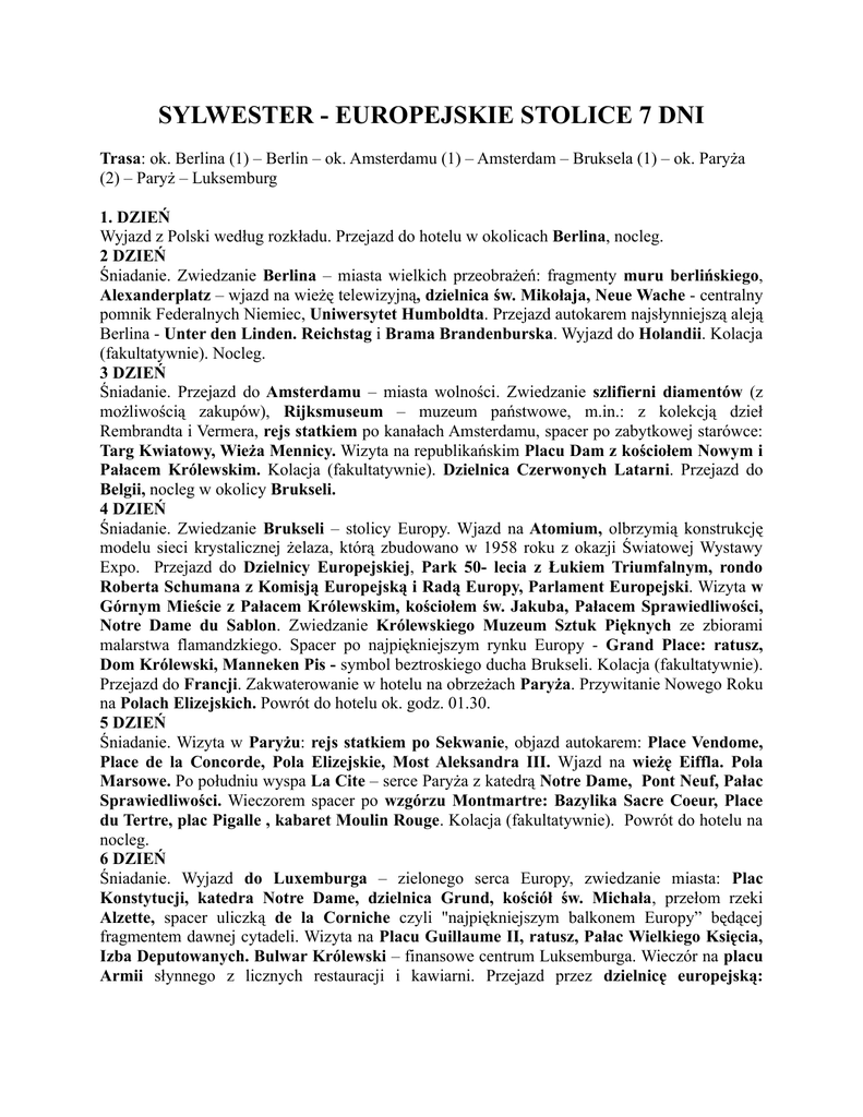 SYLWESTER - EUROPEJSKIE STOLICE 7 DNI Trasa: ok. Berlina (1) – Berlin – ok. Amsterdamu (1) – Amsterdam – Bruksela (1) – ok. Paryża (2) – Paryż – Luksemburg 1. DZIEŃ Wyjazd z Polski według rozkładu. Przejazd do hotelu w okolicach Berlina, nocleg. 2 DZIEŃ Śniadanie. Zwiedzanie Berlina – miasta wielkich przeobrażeń: fragmenty muru berlińskiego, Alexanderplatz – wjazd na wieżę telewizyjną, dzielnica św. Mikołaja, Neue Wache - centralny pomnik Federalnych Niemiec, Uniwersytet Humboldta. Przejazd autokarem najsłynniejszą aleją Berlina - Unter den Linden. Reichstag i Brama Brandenburska. Wyjazd do Holandii. Kolacja (fakultatywnie). Nocleg. 3 DZIEŃ Śniadanie. Przejazd do Amsterdamu – miasta wolności. Zwiedzanie szlifierni diamentów (z możliwością zakupów), Rijksmuseum – muzeum państwowe, m.in.: z kolekcją dzieł Rembrandta i Vermera, rejs statkiem po kanałach Amsterdamu, spacer po zabytkowej starówce: Targ Kwiatowy, Wieża Mennicy. Wizyta na republikańskim Placu Dam z kościołem Nowym i Pałacem Królewskim. Kolacja (fakultatywnie). Dzielnica Czerwonych Latarni. Przejazd do Belgii, nocleg w okolicy Brukseli. 4 DZIEŃ Śniadanie. Zwiedzanie Brukseli – stolicy Europy. Wjazd na Atomium, olbrzymią konstrukcję modelu sieci krystalicznej żelaza, którą zbudowano w 1958 roku z okazji Światowej Wystawy Expo. Przejazd do Dzielnicy Europejskiej, Park 50- lecia z Łukiem Triumfalnym, rondo Roberta Schumana z Komisją Europejską i Radą Europy, Parlament Europejski. Wizyta w Górnym Mieście z Pałacem Królewskim, kościołem św. Jakuba, Pałacem Sprawiedliwości, Notre Dame du Sablon. Zwiedzanie Królewskiego Muzeum Sztuk Pięknych ze zbiorami malarstwa flamandzkiego. Spacer po najpiękniejszym rynku Europy - Grand Place: ratusz, Dom Królewski, Manneken Pis - symbol beztroskiego ducha Brukseli. Kolacja (fakultatywnie). Przejazd do Francji. Zakwaterowanie w hotelu na obrzeżach Paryża. Przywitanie Nowego Roku na Polach Elizejskich. Powrót do hotelu ok. godz. 01.30. 5 DZIEŃ Śniadanie. Wizyta w Paryżu: rejs statkiem po Sekwanie, objazd autokarem: Place Vendome, Place de la Concorde, Pola Elizejskie, Most Aleksandra III. Wjazd na wieżę Eiffla. Pola Marsowe. Po południu wyspa La Cite – serce Paryża z katedrą Notre Dame, Pont Neuf, Pałac Sprawiedliwości. Wieczorem spacer po wzgórzu Montmartre: Bazylika Sacre Coeur, Place du Tertre, plac Pigalle , kabaret Moulin Rouge. Kolacja (fakultatywnie). Powrót do hotelu na nocleg. 6 DZIEŃ Śniadanie. Wyjazd do Luxemburga – zielonego serca Europy, zwiedzanie miasta: Plac Konstytucji, katedra Notre Dame, dzielnica Grund, kościół św. Michała, przełom rzeki Alzette, spacer uliczką de la Corniche czyli "najpiękniejszym balkonem Europy” będącej fragmentem dawnej cytadeli. Wizyta na Placu Guillaume II, ratusz, Pałac Wielkiego Księcia, Izba Deputowanych. Bulwar Królewski – finansowe centrum Luksemburga. Wieczór na placu Armii słynnego z licznych restauracji i kawiarni. Przejazd przez dzielnicę europejską: Sekretariat Generalny Parlamentu Europejskiego, Europejski Fundusz Monetarny, Europejski Bank Inwestycyjny, wyjazd do Polski. 7 DZIEŃ Przyjazd do kraju, powrót do poszczególnych miejscowości. Program imprezy jest ramowy. Kolejność zwiedzania może ulec zmianie. Numer imprezy Termin 01-011-BX 28.12.08–03.01.09 Dopłata do 4 kolacji (bez napoi): 320 zł Dopłata do pokoju 1-osobowego: 440 zł Cena w zł 1385 CENA IMPREZY OBEJMUJE: - 5 noclegów w hotelach**/*** w pokojach 2-os. z łazienkami - 5 śniadań - przejazd autokarem (barek, klimatyzacja, WC) - program turystyczny - ubezpieczenie - opiekę pilota CENA NIE OBEJMUJE: - biletów wstępu do zwiedzanych obiektów – ok. 90 EUR Trasy I/II/III/IV