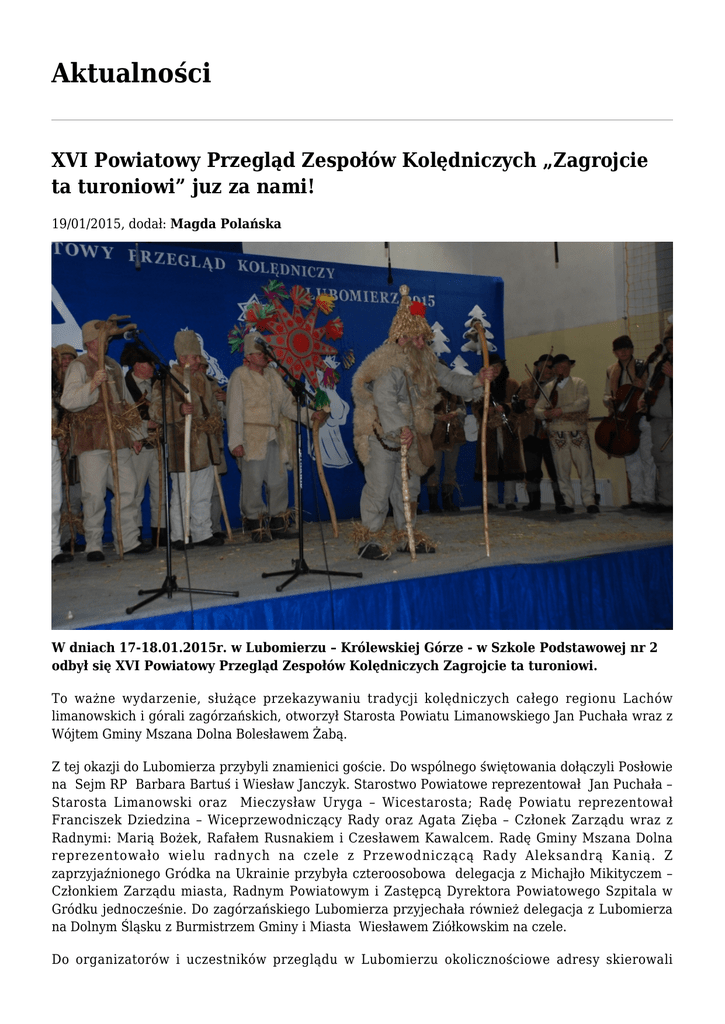 Aktualności XVI Powiatowy Przegląd Zespołów Kolędniczych „Zagrojcie ta turoniowi” juz za nami! 19/01/2015, dodał: Magda Polańska W dniach 17-18.01.2015r. w Lubomierzu – Królewskiej Górze - w Szkole Podstawowej nr 2 odbył się XVI Powiatowy Przegląd Zespołów Kolędniczych Zagrojcie ta turoniowi. To ważne wydarzenie, służące przekazywaniu tradycji kolędniczych całego regionu Lachów limanowskich i górali zagórzańskich, otworzył Starosta Powiatu Limanowskiego Jan Puchała wraz z Wójtem Gminy Mszana Dolna Bolesławem Żabą. Z tej okazji do Lubomierza przybyli znamienici goście. Do wspólnego świętowania dołączyli Posłowie na Sejm RP Barbara Bartuś i Wiesław Janczyk. Starostwo Powiatowe reprezentował Jan Puchała – Starosta Limanowski oraz Mieczysław Uryga – Wicestarosta; Radę Powiatu reprezentował Franciszek Dziedzina – Wiceprzewodniczący Rady oraz Agata Zięba – Członek Zarządu wraz z Radnymi: Marią Bożek, Rafałem Rusnakiem i Czesławem Kawalcem. Radę Gminy Mszana Dolna reprezentowało wielu radnych na czele z Przewodniczącą Rady Aleksandrą Kanią. Z zaprzyjaźnionego Gródka na Ukrainie przybyła czteroosobowa delegacja z Michajło Mikityczem – Członkiem Zarządu miasta, Radnym Powiatowym i Zastępcą Dyrektora Powiatowego Szpitala w Gródku jednocześnie. Do zagórzańskiego Lubomierza przyjechała również delegacja z Lubomierza na Dolnym Śląsku z Burmistrzem Gminy i Miasta Wiesławem Ziółkowskim na czele. Do organizatorów i uczestników przeglądu w Lubomierzu okolicznościowe adresy skierowali Marszałek Województwa Małopolskiego Marek Sowa oraz Wojewoda Małopolski Jerzy Miller życząc wielu wrażeń artystycznych podczas wspólnej zabawy. Panowie złożyli również organizatorom przeglądu gratulacje za dbałość o zachowanie tradycji bożonarodzeniowych. Nad sprawnym przeprowadzeniem konkursu czuwali prowadzący: Józefa Nachman - nauczycielka ze SP nr1 w Lubomierzu oraz Piotr Lulek - inspektor ds. kultury i współpracy z organizacjami pozarządowymi. Popisy grup biorących udział w przeglądzie oceniała komisja w składzie: mgr Aleksandra Bogucka – etnomuzykolog, mgr Benedykt Kafel – etnograf, dr hab. Stanisław Węglarz – etnolog. W konkursie wzięło udział 27 grup kolędniczych, które rywalizowały w trzech kategoriach wiekowych: dorośli, młodzież (od 14 do 17 lat) i dzieci (od 7 do 13 lat). Po obejrzeniu 11 grup dziecięcych, 5 młodzieżowych i 11 grup dorosłych oraz omówieniu zaprezentowanych programów, komisja postanowiła przyznać następujące nagrody i wyróżnienia: A. w kategorii dziecięcej (od 7 do lat 13) - dwa równorzędne I miejsca i nagrody pieniężne w wysokości po 300 zł otrzymały grupy kolędnicze: „,Pastuszki” z Sadku Kostrzy, „Z Szopką (rekwizyt)” z Siekierczyny; - dwa równorzędne II miejsca i nagrody pieniężne w wysokości po 200 zł otrzymały grupy kolędnicze „Z Gwiazdą” z Zasadnego i „Z Gwiazdą ” z Ujanowic; - pięć równorzędnych III miejsc i nagrody pieniężne w wysokości po 150 zł otrzymały grupy kolędnicze „Z Gwiazdą” z Pasierbca, „Herody” z Raby Niżnej, „Z Gwiazdą” z Mszany Górnej, „Z Gwiazdą” z Olszówki, „Z Gwiazdą” z Krasnych Lasocic; - dwa równorzędne wyróżnienia i nagrody pieniężne w wysokości po 100 zł trafiły do grup kolędniczych: „Z Gwiazdą” z Kamienicy i „Z Gwiazdą” z Łostówki; B. w kategorii młodzieżowej (od 14 do lat 17) - I miejsce i nagrodę pieniężną w wysokości 300 zł otrzymała grupa kolędnicza „Z Gwiazdą” z Sadku Kostrzy; - cztery równorzędne II miejsca i nagrody pieniężne w wysokości po 200 zł otrzymały grupy kolędnicze: „Herody” z Jodłownika, „Pasterze” ze Szczyrzyca, „Z Gwiazdą” z Walowej Góry, „Z Gwiazdą” z Ujanowic. Ponadto na Ogólnopolski Przegląd Grup Kolędniczych „Pastuszkowe kolędowanie” w Podegrodziu komisja zakwalifikowała cztery grupy dziecięce i tj. „,Pastuszki” z Sadku Kostrzy , „Z szopką (rekwizyt)” z Siekierczyny, „Z Gwiazdą” z Zasadnego, „Z Gwiazdą ” z Ujanowic oraz jedną grupę młodzieżową „Z Gwiazdą” z Sadku Kostrzy. C. w kategorii dorosłych: - trzy równorzędne I miejsca i nagrody pieniężne w wysokości po 550 zł otrzymały grupy kolędnicze: „Z Gwiazdą” ze Starej Wsi, „Z Turoniem” z Sadku Kostrzy i „Z Turoniem” z Lubomierza; - pięć równorzędnych II miejsc i nagrody pieniężne po 400 zł otrzymały grupy kolędnicze: „Trzej Królowie” z Jodłownika, „Z Turoniem” z Jurkowa, „Z Gwiazdą” z Makowicy, „Z Szopką (lalkową)” ze Szczawy, „Z Turoniem” z Jaworznej; - dwa równorzędne III miejsca i nagrody pieniężne w wysokości po 300 zł otrzymały grupy kolędnicze: „Z Gwiazdą” z Krasnych Lasocic i „Herody” z Kamienicy; - wyróżnienie specjalne za zrekonstruowanie XIX- wiecznego widowiska wraz z nagrodą pieniężną w wysokości 200 zł otrzymała grupa kolędnicza „Fedory” z Mordarki. Ponadto na Ogólnopolski Konkurs Grup Kolędniczych w ramach „Karnawału Góralskiego” w Bukowinie Tatrzańskiej komisja zakwalifikowała wszystkie dorosłe grupy kolędnicze, których występ organizatorzy przewidują 5 lutego 2015 (czwartek). XVI Powiatowy Przegląd Zespołów Kolędniczych Zagrojcie ta turoniowi nie odbyłby się, gdyby nie pomoc sponsorów i zaangażowanie całej społeczności przysiółka Królewska Góra. Głównymi organizatorami XVI Powiatowego Przeglądu Kolędniczego, fundatorami nagród i poczęstunku, zarówno dla grup kolędniczych, jak i gości powiatowego święta, był Wójt Gminy Mszana Dolna oraz Starosta Limanowski. Swój udział w organizację uroczystości poprzez wsparcie finansowe tegorocznego przeglądu zaznaczyli również: - Joanna i Jan Wojtyczka - Handel Transport Usługi "Usie", Lubomierz; - Tadeusz Dragon - Inspektor Lasów Państwowych z Dyrekcji Generalnej w Warszawie wraz z