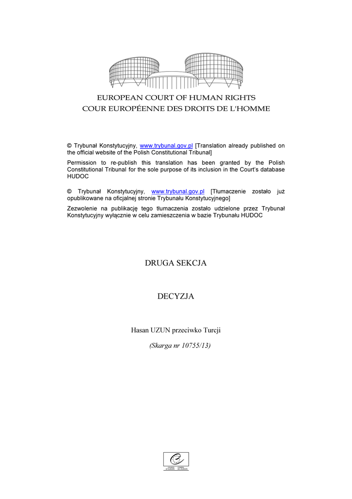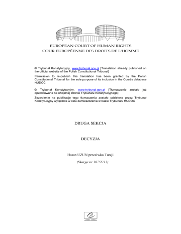 © Trybunał Konstytucyjny, www.trybunal.gov.pl [Translation already published on the official website of the Polish Constitutional Tribunal] Permission to re-publish this translation has been granted by the Polish Constitutional Tribunal for the sole purpose of its inclusion in the Court’s database HUDOC © Trybunał Konstytucyjny, www.trybunal.gov.pl [Tłumaczenie opublikowane na oficjalnej stronie Trybunału Konstytucyjnego] zostało już Zezwolenie na publikację tego tłumaczenia zostało udzielone przez Trybunał Konstytucyjny wyłącznie w celu zamieszczenia w bazie Trybunału HUDOC DRUGA SEKCJA DECYZJA Hasan UZUN przeciwko Turcji (Skarga nr 10755/13) DECYZJA HASAN UZUN przeciwko Turcji 2 W dniu 30 kwietnia 2013 r. Europejski Trybunał Praw Człowieka (druga sekcja), jako izba składająca się z następujących sędziów: Guido Raimondi, przewodniczący, Danutė Jočienė, Peer Lorenzen, András Sajó, Işıl Karakaş, Nebojša Vučinić, Helen Keller, oraz Stanley Naismith, kanclerz sekcji, Po zapoznaniu się z wyżej wymienioną skargą wniesioną w dniu 3 stycznia 2013 roku, Zważywszy na postanowienie o priorytetowym potraktowaniu sprawy na podstawie artykułu 41 Regulaminu Trybunału. Wydaje następującą decyzję: STAN FAKTYCZNY 1. Skarżący Pan Hasan Uzun, jest obywatelem tureckim, urodził się w 1937 roku i zamieszkuje w Muğla. I. OKOLICZNOŚCI SPRAWY 2. Stan faktyczny sprawy, tak jak został on przedstawiony przez skarżącego, można streścić w następujący sposób. 3. W dniu 1 czerwca 2009 roku, I.U. złożył wniosek o sprostowanie wpisu w księdze wieczystej na niekorzyść skarżącego, w następstwie sporu o granice własności dwóch sąsiadujących działek. 4. W dniu 22 września 2011 roku, Sąd Okręgowy w Muğla, powołując się na opinie biegłych, oględziny terenu i zeznania świadków, postanowił o wpisie części terenu o wielkości około 75 m2, użytkowanego przez skarżącego na rzecz tej osoby trzeciej. 5. Skarżący złożył odwołanie opierając się, w szczególności, na nieprawidłowościach w czasie powoływania stron postępowania w celu oględzin terenu. 6. W dniu 25 września 2012 roku Sąd Kasacyjny utrzymał w mocy zaskarżone postanowienie. DECYZJA HASAN UZUN przeciwko Turcji 3 II. WŁAŚCIWE PRAWO KRAJOWE A. Konstytucja Republiki Turcji 1. Wprowadzenie 7. W wyniku poprawek do Konstytucji wprowadzonych ustawą nr 5982 ogłoszoną w Dzienniku Urzędowym z dnia 13 maja 2010 roku, a która weszła w życie w dniu 23 września 2010 roku po przeprowadzeniu referendum, liczba sędziów tureckiego Trybunału Konstytucyjnego („TTK”) zmieniła się z 11 na 17; na mocy artykułu przejściowego nr 18 tej ustawy, czterej sędziowie zastępcy uzyskali w tym dniu status członków stałych, natomiast wybór dwóch nowych sędziów miał miejsce w terminie 30 dni przewidzianym przez ustawę nr 5982. 8. Aby Trybunał Konstytucyjny mógł sprostać zwiększonemu obciążeniu pracą zostały utworzone dwie nowe izby. Niektóre uprawnienia wchodzą wyłącznie w zakres właściwości Zgromadzenia Ogólnego. 9. Każdej z dwóch izb, składających się z pięciu sędziów w każdej izbie, przewodniczą dwaj zastępcy Prezesa TTK. Rozpatrywanie skarg konstytucyjnych należy do izb składających się z dwóch sekcji mających w składzie po 8 sędziów. 2. Właściwe przepisy Konstytucji 10. Artykuł 90 § 5 Konstytucji brzmi jak następuje : „Porozumienia międzynarodowe wprowadzone we właściwym trybie mają moc ustawy. Nie dopuszcza się wystąpienia do Trybunału Konstytucyjnego o zbadanie ich zgodności z Konstytucją. W przypadku wystąpienia rozbieżności między postanowieniami porozumień międzynarodowych wprowadzonych w życie we właściwym trybie i dotyczących podstawowych praw i wolności, a postanowieniami ustaw dotyczących tej samej materii, pierwszeństwo przysługuje postanowieniom porozumień międzynarodowych.” 11. Artykuł 148 Konstytucji zmieniony ustawą nr 5982, brzmi jak następuje : „1. Trybunał Konstytucyjny bada zgodność z Konstytucją ustaw, dekretów z mocą ustawy oraz Regulaminu Wielkiego Zgromadzenia Narodowego Turcji pod względem formy i treści , a także rozpatruje skargi konstytucyjne. Poprawki do Konstytucji bada jedynie pod względem formy (…) 3. Każdy ma prawo wnieść do Trybunału Konstytucyjnego skargę konstytucyjną opartą na zarzucie naruszenia przez władze publiczne jednego z jego podstawowych wolności lub jednego z jego praw gwarantowanych Konstytucją i przewidzianych w Europejskiej Konwencji Praw Człowieka. Warunkiem złożenia skargi jest wcześniejsze wyczerpanie przysługujących środków odwoławczych (…) 5. Podstawa kasacji nie może być rozpatrywana przez Trybunału Konstytucyjny w ramach skargi konstytucyjnej (...) » DECYZJA HASAN UZUN przeciwko Turcji 4 12. Artykuł 149, zmieniony ustawą nr 5982, otrzymał następujące brzmienie : „1. W celu rozpatrzenia wniesionych do niego spraw, Trybunał Konstytucyjny zbiera się w dwóch izbach i na Zgromadzeniu Ogólnym. Izby zbierają się pod przewodnictwem zastępcy prezesa Trybunału w składzie 4 sędziów. Zgromadzenie Ogólne składa się z co najmniej 12 sędziów i zbiera się pod przewodnictwem Prezesa Trybunału Konstytucyjnego lub wyznaczonego przez niego zastępcy. Zgromadzenie Ogólne zbiera się pod przewodnictwem Prezesa Trybunału Konstytucyjnego lub wyznaczonego przez niego zastępcy w składzie co najmniej 12 członków. Izby i Zgromadzenie Ogólne podejmują orzeczenia bezwzględną ilością głosów. Do badania dopuszczalności skargi konstytucyjnej mogą być powołane komisje. 2. Zgromadzenie Ogólne orzeka o sprawach i wnioskach dotyczących partii politycznych oraz o uchyleniu ustawy i zarzutach niekonstytucyjności podnoszonych w postępowaniu sądowym, w sprawach, w których Trybunał Konstytucyjny orzeka jako Trybunał Stanu, zaś Izby orzekają w sprawach skargi konstytucyjnej (…) 4. Try