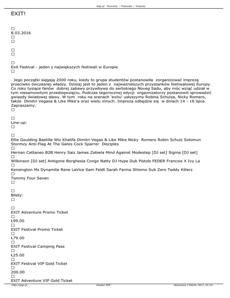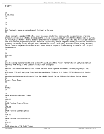 Gigs.pl - Koncerty :: Festiwale :: Imprezy EXIT! 8.03.2016 Exit Festival - jeden z największych festiwali w Europie . Jego początki sięgają 2000 roku, kiedy to grupa studentów postanowiła zorganizować imprezę przeciwko ówczesnej władzy. Dzisiaj jest to jeden z najważnieszych przystanków festiwalowej Europy. Co roku tysiące fanów dobrej zabawy przywbywa do serbskiego Noveg Sadu, aby móc wziąć udział w tym niesamowitym przedsięwzięciu. Podczas tegorocznej edycji orgaznizatorzy postanowili sprowadzić gwiazdy światowej sławy. W tym roku na scenach 'exitu' usłyszymy Robina Schulza, Nicky Romero, także Dimitri Vegasa & Like Mike'a oraz wielu innych. Impreza odbędzie się w dniach 14 - 16 lipca. Zapraszamy. Line-up: Ellie Goulding Bastille Wiz Khalifa Dimitri Vegas & Like Mike Nicky Romero Robin Schulz Solomun Stormzy Anti-Flag At The Gates Cock Sparrer Disciples Hernan Cattaneo B2B Henry Saiz James Zabiela Mind Against Modestep [DJ set] Sigma [DJ set] Wilkinson [DJ set] Antigone Borghesia Congo Natty DJ Hype Dub Pistols FEDER Francois X Ivy La Kensington Ms Dynamite Rene LaVice Sam Feldt Sarah Farina Shlomo Sub Zero Teddy Killerz Tommy Four Seven Bilety: EXIT Adventure Promo Ticket Ł99.00 EXIT Festival Promo Ticket Ł79.00 EXIT Festival Camping Pass Ł25.00 EXIT Festival VIP Gold Ticket 200.00 EXIT Adventure VIP Gold Ticket http://gigs.pl Kreator PDF Utworzono 2 March, 2017, 01:14 Gigs.pl - Koncerty :: Festiwale :: Imprezy Ł250.00 Sea Dance Festival Promo Ticket Ł49.00 http://gigs.pl Kreator PDF Utworzono 2 March, 2017, 01:14