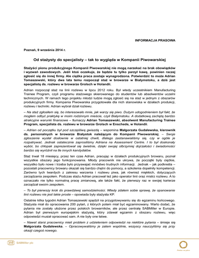 INFORMACJA PRASOWA Poznań, 9 września 2014 r. Od stażysty do specjalisty – tak to wygląda w Kompanii Piwowarskiej Stażyści pionu produkcyjnego Kompanii Piwowarskiej nie mogą narzekać na brak obowiązków i wyzwań zawodowych. Jeśli ktoś oczekuje, że będzie tu tylko parzył kawę, powinien raczej zgłosić się do innej firmy. Ale ciężka praca zostaje wynagrodzona. Potwierdzić to może Adrian Tomaszewski, który dwa lata temu rozpoczął staż w browarze w Białymstoku, a dziś jest specjalistą ds. rozlewu w browarze Grolsch w Holandii. Adrian rozpoczął staż na linii rozlewu w lipcu 2012 roku. Był wtedy uczestnikiem Manufacturing Trainee Program, czyli programu stażowego skierowanego do studentów lub absolwentów uczelni technicznych. W ramach tego projektu młodzi ludzie mogą zgłosić się na staż w jednym z obszarów produkcyjnych firmy. Kompania Piwowarska przygotowała dla nich stanowiska w działach produkcji, rozlewu i techniki. Adrian wybrał dział rozlewu. – Na staż zgłosiłem się, bo interesowało mnie, jak warzy się piwo. Dużym udogodnieniem był fakt, że mogłem odbyć praktykę w moim rodzinnym mieście, czyli Białymstoku. A dodatkową zachętą bardzo atrakcyjne warunki finansowe – tłumaczy Adrian Tomaszewski, absolwent Manufacturing Trainee Program, specjalista ds. rozlewu w browarze Grolsch w Enschede, w Holandii. – Adrian od początku był pod szczęśliwą gwiazdą – wspomina Małgorzata Gudalewska, kierownik ds. personalnych w browarze Białystok należącym do Kompanii Piwowarskiej. – Swoje zgłoszenie wysłał dosłownie w ostatniej chwili, dlatego zastanawialiśmy się, czy w ogóle je rozpatrywać. Jednak ostatecznie zaprosiliśmy Adriana na Assessment Centre. I to był doskonały wybór, bo chłopak zaprezentował się świetnie, dzięki swojej olbrzymiej dojrzałości i świadomości bardzo się wyróżnił na tle innych kandydatów. Staż trwał 18 miesięcy, przez ten czas Adrian, pracując w działach produkcyjnych browaru, poznał wszystkie obszary jego funkcjonowania. Młody pracownik nie ukrywa, że początki były ciężkie, wszystko było nowe i trzeba było przyswajać mnóstwo trudnych informacji. Jednak – jak podkreśla – pozostali pracownicy browaru okazali się bardzo chętni do pomocy, a szkolenia dopełniły kompetencji. Zarówno tych twardych z zakresu warzenia i rozlewu piwa, jak również miękkich, dotyczących zarządzania zespołem. Podczas stażu Adrian pracował też jako operator linii oraz mistrz rozlewu. A to oznaczało nie tylko normalną pracę zmianową, ale także fakt, że pierwszy raz w swojej karierze zarządzał swoim zespołem. – To był pierwszy krok do prawdziwej samodzielności. Wtedy zdałem sobie sprawę, że opanowanie linii rozlewu nie jest takie proste – opowiada były stażysta KP. Ostatnie kilka tygodni Adrian Tomaszewski spędził na przygotowywaniu się do egzaminu końcowego. Stażysta miał do opracowania 200 pytań, z których potem miał być egzaminowany. Warto dodać, że pytania nie zostały ułożone przez polskich browarników, ale przez centralę SABMiller w Europie. Adrian był pierwszym europejskim stażystą, który zdawał egzamin z obszaru rozlewu, więc odpowiedzi musiał opracować sam. A nie były one łatwe. – Nawet starsi pracownicy mieli problem z udzieleniem odpowiedzi na niektóre pytania – śmieje się Małgorzata Gudalewska. – Opracowywaliśmy je zatem wspólnie, wszyscy nauczyliśmy się przy okazji czegoś nowego. Oprócz odpowiedzi na pytania, Adrian musiał opracować swój własny projekt związany z rozlewem, a następnie zaprezentować go podczas egzaminu. Współpracownicy z browaru w Białymstoku zorganizowali mu próbny egzamin, podczas którego okazało się, że stażysta ma olbrzymią wiedzę, ale kłopot z jej zaprezentowaniem. – W ciągu nocy i kolejnych godzin w pociągu do Poznania zmieniłem prezentację tak, żeby była bardziej atrakcyjna i po prostu ciekawsza dla słuchaczy. Ale zdążyłem! Potem czekały mnie dwa dni egzaminu. Pierwszego dnia zaznajomiłem się z browarem, drugiego odpowiadałem na pytania oraz prezentowałem swój projekt. Najtrudniejsza była chyba część praktyczna, w której musiałem szczegółowo tłumaczyć, jak działają maszyny, jak wyglądają poszczególne procesy rozlewu piwa – opowiada Adrian Tomaszewski. Efekt był świetny – komisja była z Adriana bardzo zadowolona. W jej składzie specjalista ds. produkcji SABMiller w Europie (Manufacturing Executive SABMiller Europe) Elias Zacharias, szef rozlewu browaru w Poznaniu Robert Rymer i menedżer ds. rozwoju rozlewu Krzysztof Cichoń. Mimo, że pytania były bardzo szczegółowe, a odpowiedzi musiały być udzielane po angielsku, Adrian poradził sobie znakomicie i zdał bez problemu. Staż dobiegł końca. Tuż po nim pojawiła się nowa szansa. Browar w Białymstoku otrzymał informację o prowadzonej przez oddział SABMiller w Holandii rekrutacji do browaru Grolsch. Wakat obejmował stanowisko specjalisty ds. rozlewu. Adrian zgłosił się i szybko został zaproszony na telefoniczną rozmowę rekrutacyjną. Przedstawiciele Grolscha byli pod wrażeniem jego wiedzy i umiejętności. Bez problemu dostał tę pracę i już od trzech miesięcy prowadzi w Holandii swoje własnej projekty dotyczące m.in. zaniku piwa oraz tlenu w piwie. Wiedza Adriana jest bardzo cenna dla specjalistów z browaru Grolsch m.in. dlatego, że browar w Białymstoku ma świetne wyniki np. w zakresie zużycia wody, ekologii. – W Holandii nie jest lekko, na pewno mamy co robić, co ulepszać, a specyfika pracy różni się od polskiej. Zespół jest bardzo pomocny, choć wszyscy pracują tu długo: od 8 rano, często do 18 po południu. Jednak otoczenie jest ciekawe, środowisko pracy odrobinę multikulturowe: szef rozlewu pochodzi z RPA, a dyrektor całego browaru z Czech. Bardzo mi pomogli w zaaklimatyzowaniu się w nowym miejscu. Nie sposób się nu