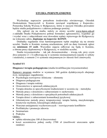 STUDIA PODYPLOMOWE Wychodząc naprzeciw potrzebom środowiska oświatowego, Ośrodek Doskonalenia Nauczycieli w Koninie nawiązał współpracę z KujawskoPomorską Szkołą Wyższą w Bydgoszczy, która w naszym Ośrodku prowadzić będzie studia podyplomowe z zakresu podanego poniżej. Aby zgłosić się na studia, należy ze strony uczelni www.kpsw.edu.pl z zakładki Studia Podyplomowe pobrać formularz zgłoszeniowy, wypełnić go i wysłać wraz z załącznikami oraz dowodem wpłaty wpisowego do Bydgoszczy na wskazany adres, dopisując na kopercie: KONIN. Dokładny regulamin wraz harmonogramem wpłat znajduje się na stronie uczelni. Studia w Koninie zostaną uruchomione, jeśli na dany kierunek zgłosi się minimum 15 osób. Wszystkie zajęcia odbywać się będą w Koninie, a obrona pracy dyplomowej w Bydgoszczy, w siedzibie uczelni. Studia trzysemestralne – tak jak dwusemestralne – trwają rok, przy czym dwa semestry (1 i 3) odbywają się w systemie niestacjonarnym (zjazdy w soboty i niedziele), a semestr 2 w systemie stacjonarnym (w okresie ferii zimowych). Symbol S/1 Diagnoza i terapia pedagogiczna (studia kwalifikacyjne trzysemestralne) Ramowy program studiów w wymiarze 360 godzin dydaktycznych obejmuje m.in. następujące zagadnienia: Psychologia rozwojowa i kliniczna – elementy Diagnoza pedagogiczna Diagnoza i terapia rodziny Orzecznictwo w sprawach edukacyjnych Terapia dziecka ze specyficznymi trudnościami w uczeniu się – metodyka Metody pracy z dzieckiem z zaburzeniami w zachowaniu Metody pracy z dzieckiem o specjalnych potrzebach edukacyjnych Terapia dzieci z zaburzeniami komunikacji językowej Alternatywne metody pracy terapeutycznej: terapia baśnią, muzykoterapia, kreatywne myślenie, kinezjologia edukacyjna Warsztat umiejętności wychowawczych – rozwiązywanie konfliktów Profilaktyka i promocja zdrowia Seminarium Praktyka Opłaty: opłata rekrutacyjna 100 zł (bezzwrotna) koszt uczestnictwa jednej osoby 2700 zł (możliwość uiszczania opłat ratalnie) Symbol S/2 Przygotowanie pedagogiczne (studia kwalifikacyjne trzysemestralne) Ramowy program studiów w wymiarze 460 godzin dydaktycznych obejmuje m.in. następujące zagadnienia: Pedagogika ogólna Teoria wychowania Psychologia Dydaktyka ogólna Warsztat pracy nauczyciela Metodyki przedmiotowe: humanistyczna matematyczna przyrodnicza artystyczna Praktyka pedagogiczna (150 godzin) Seminarium Opłaty: opłata rekrutacyjna 100 zł (bezzwrotna) koszt uczestnictwa jednej osoby 2800 zł (możliwość uiszczania opłat ratalnie) Symbol S/3 Logopedia szkolna – terapia dzieci z zaburzeniami komunikacji językowej (studia kwalifikacyjne trzysemestralne) Ramowy program studiów w wymiarze 360 godzin dydaktycznych obejmuje m.in. następujące zagadnienia: Wstęp do logopedii Anatomia i fizjologia aparatu mowy Kształtowanie się i rozwój mowy dziecka Fonetyka Gramatyka języka polskiego Elementy ortodoncji i foniatrii Pedagogika specjalna Audiologia specjalna Zaburzenia porozumiewania się językowego: słownego i pisemnego Psychologiczne problemy zaburzeń rozwojowych i ich związek z zaburzeniami mowy Specyficzne problemy psychiatrii dziecięcej Metodyka ćwiczeń logopedycznych Ćwiczenia praktyczne w placówce oświatowej Seminarium Praktyka Opłaty: opłata rekrutacyjna 100 zł (bezzwrotna) koszt uczestnictwa jednej osoby 3400 zł (możliwość uiszczania opłat ratalnie) Dla zainteresowanych istnieje możliwość przedłużenia studiów o 1 semestr i uzyskanie dyplomu Logopedia ogólna. Symbol S/4 Terapia zajęciowa (studia kwalifikacyjne trzysemestralne) Ramowy program studiów w wymiarze 360 godzin dydaktycznych obejmuje m.in. następujące zagadnienia: Socjologia i psychologia rodziny Pedagogika specjalna System opieki i wsparcia społecznego Diagnoza indywidualna Diagnoza środowiskowa Anatomia i fizjologia Patologie z zarysem klinicznym chorób Podstawy kompleksowej rehabilitacji Metody i formy terapii w różnych grupach wiekowych Systemy komunikacji alternatywnej Trening umiejętności interpersonalnych Warsztaty terapii zajęciowej Seminarium Praktyka Opłaty: opłata rekrutacyjna 100 zł (bezzwrotna) koszt uczestnictwa jednej osoby 2600 zł (możliwość uiszczania opłat ratalnie) Symbol S/5 Oligofrenopedagogika z komunikacją alternatywną (studia kwalifikacyjne trzysemestralne) Ramowy program studiów w wymiarze 400 godzin dydaktycznych obejmuje m.in. następujące zagadnienia: Pedagogika specjalna Oligofrenopedagogika Podstawy rewalidacji upośledzonych Wybrane zagadnienia z neuropsychiatrii dziecięcej Rewalidacja indywidualna Trening interpersonalny Podstawy psychologii klinicznej Praca z dzieckiem o specjalnych potrzebach edukacyjnych – podstawy prawne Warsztat współpracy z rodziną Samorządowy system edukacyjny – wybrane problemy Metodyka nauczania lekko upośledzonych umysłowo Metodyka nauczania głębiej upośledzonych umysłowo Metodyka nauczania głęboko upośledzonych umysłowo Metodyka nauczania w internacie Komunikacja alternatywna z metodyką Seminarium dyplomowe Praktyka Opłaty: opłata rekrutacyjna 100 zł (bezzwrotna) koszt uczestnictwa jednej osoby 2800 zł (możliwość uiszczania opłat ratalnie) Symbol S/6 Socjoterapia (studia kwalifikacyjne trzysemestralne) Ramowy program studiów w wymiarze 420 godzin dydaktycznych obejmuje m.in. następujące zagadnienia: Trening interpersonalny Umiejętności wychowawcze Praca z grupą Warsztat socjoterapeutyczny Pomoc w kontakcie indywidualnym Warsztat zadaniowy Współpraca z rodziną Praktyka socjoterapeutyczna Seminarium Praktyka Opłaty: opłata rekrutacyjna 100 zł (bezzwrotna) koszt uczestnictwa jednej osoby 2800 zł (możliwość uiszczania opłat ratalnie) Symbol S/7 Resocjalizacja (studia kwalifikacyjne trzysemestralne) Ramowy program studiów w wymiarze 350 godzin dydaktycznych obejmuje m.in. następujące zagadnienia: Elementy psychiatrii i neurologii Elementy psychologii Wybrane zagadnienia z socjologii Pedagogik