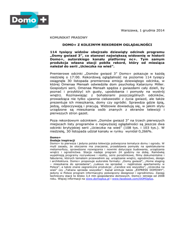 Warszawa, 1 grudnia 2014 KOMUNIKAT PRASOWY DOMO+ Z KOLEJNYM REKORDEM OGLĄDALNOŚCI 114 tysięcy widzów obejrzało dziewiąty odcinek programu „Domy gwiazd 3”, co stanowi największą widownię w historii Domo+, autorskiego kanału platformy nc+. Tym samym produkcja własna stacji pobiła rekord, który od miesiąca należał do serii „Ucieczka na wieś”. Premierowe odcinki „Domów gwiazd 3” Domo+ pokazuje w każdą niedzielę o 17:00. Rekordową oglądalność na poziomie 114 tysięcy osiągnęła 30 listopada premierowa emisja dziewiątego odcinka, w której Omenaa Mensah odwiedziła dom psycholog Katarzyny Miller. Gospodyni serii, Omenaa Mensah spędza z gwiazdami cały dzień, by poznać i przybliżyć ich gusty, upodobania i pomysły na wystrój wnętrz. Rozmawiając z bohaterami poszczególnych odcinków, prowadząca nie tylko ujawnia ciekawostki z życia gwiazd, ale także prezentuje ich mieszkania, domy czy ogródki. Sprawdza gdzie śpią, jedzą, odpoczywają i pracują. Widzowie dowiadują się, w jakim stylu urządzone są mieszkania osób znanych z ekranów telewizji i pierwszych stron gazet. Poza rekordowym odcinkiem „Domów gwiazd 3” na trzech pierwszych miejscach listy programów o najwyższej oglądalności są jeszcze dwa odcinki brytyjskiej serii „Ucieczka na wieś” (108 tys. i 103 tys.). W niedzielę, 30 listopada udział kanału w rynku wyniósł 0,266%. Domo+ Dodaje inspiracji Domo+ to pierwsza i jedyna polska telewizja poświęcona tematyce domu i ogrodu. W myśl zasady, że otoczenie ma znaczenie, przedstawia pomysły na spektakularne metamorfozy, sprawdzone rozwiązania i nowinki dotyczące budowania, urządzania wnętrz i ogrodnictwa. Stacja nadaje program 24 godziny na dobę. Ramówkę wypełniają programy rozrywkowe i reality, serie poradnikowe, filmy dokumentalne i fabularne, których tematem przewodnim są: urządzanie wnętrz, ogrodnictwo, design i architektura. Domo+ proponuje autorskie formaty: „Domy gwiazd”, „Home staging – mieszkania do sprzedania”, „Luksus na sprzedaż – najdroższe apartamenty w Polsce”, a także znane zagraniczne produkcje: „Candice wie wszystko”, „Ucieczka na wieś” czy „Tatiana sprzeda wszystko”. Kanał emituje także „EXPRESS DOMOWY”, jedyny w Polsce program informacyjny poświęcony designowi i ogrodnictwu. Zasięg techniczny stacji to blisko 3,4 mln gospodarstw domowych. Domo+ istnieje od 2008 roku. Więcej informacji na www.domoplus.pl i www.facebook.com/DOMOplus.