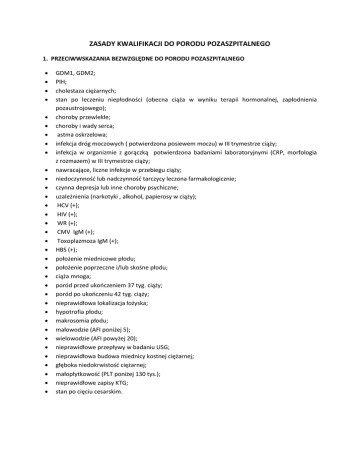 ZASADY KWALIFIKACJI DO PORODU POZASZPITALNEGO 1. PRZECIWWSKAZANIA BEZWZGLĘDNE DO PORODU POZASZPITALNEGO                                    GDM1, GDM2; PIH; cholestaza ciężarnych; stan po leczeniu niepłodności (obecna ciąża w wyniku terapii hormonalnej, zapłodnienia pozaustrojowego); choroby przewlekłe; choroby i wady serca; astma oskrzelowa; infekcja dróg moczowych ( potwierdzona posiewem moczu) w III trymestrze ciąży; infekcja w organizmie z gorączką potwierdzona badaniami laboratoryjnymi (CRP, morfologia z rozmazem) w III trymestrze ciąży; nawracające, liczne infekcje w przebiegu ciąży; niedoczynność lub nadczynność tarczycy leczona farmakologicznie; czynna depresja lub inne choroby psychiczne; uzależnienia (narkotyki , alkohol, papierosy w ciąży); HCV (+); HIV (+); WR (+); CMV IgM (+); Toxoplazmoza IgM (+); HBS (+); położenie miednicowe płodu; położenie poprzeczne i/lub skośne płodu; ciąża mnoga; poród przed ukończeniem 37 tyg. ciąży; poród po ukończeniu 42 tyg. ciąży; nieprawidłowa lokalizacja łożyska; hypotrofia płodu; makrosomia płodu; małowodzie (AFI poniżej 5); wielowodzie (AFI powyżej 20); nieprawidłowe przepływy w badaniu USG; nieprawidłowa budowa miednicy kostnej ciężarnej; głęboka niedokrwistość ciężarnej; małopłytkowość (PLT poniżej 130 tys.); nieprawidłowe zapisy KTG; stan po cięciu cesarskim. 2. PRZECIWWSKAZANIA WZGLĘDNE DO PORODU POZASZPITALNEGO         kolonizacja dróg rodnych Streptococcus Agalactiae; nieleczone, aktywne infekcje pochwy; stan po łyżeczkowaniu jamy macicy - należy wziąć pod uwagę przyczynę łyżeczkowania, przebieg zabiegu, ewentualne wystąpienie krwotoku z dróg rodnych, czy łyżeczkowania były związane z ciążą, poronieniem, powikłaniami III i/lub IV okresu porodu. Te ostatnie traktowane powinny być najostrożniej; wieloletnia antykoncepcja hormonalna lub wkładka domaciczna usunięta na krótko przed bieżącą ciążą; mięśniaki macicy - konieczna kontrola wielkości mięśniaków w badaniu USG, dokładny wywiad (krwotoczność miesiączek, zwiększone krwawienie z dróg rodnych po poprzednich porodach); ciężarna niepełnoletnia (konieczna pisemna zgoda prawnego opiekuna na odbycie porodu poza szpitalem dołączona do dokumentacji medycznej); małopłytkowość (PLT 130-150 tys.); poród poza szpitalem możliwy tylko przy prawidłowym koagulogramie; obciążony wywiad położniczy.