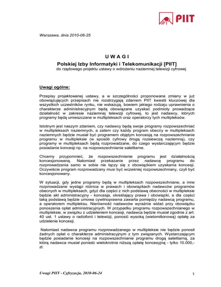 Warszawa, dnia 2010-06-25 UWAGI Polskiej Izby Informatyki i Telekomunikacji [PIIT] do rządowego projektu ustawy o wdrożeniu naziemnej telewizji cyfrowej Uwagi ogólne: Przepisy projektowanej ustawy, a w szczególności proponowane zmiany w już obowiązujących przepisach nie rozstrzygają zdaniem PIIT kwestii kluczowej dla wszystkich uczestników rynku, nie wskazują, bowiem jakiego rodzaju uprawnienia o charakterze administracyjnym będą obowiązane uzyskać podmioty prowadzące działalność w zakresie naziemnej telewizji cyfrowej, to jest nadawcy, których programy będą umieszczane w multipleksach oraz operatorzy tych multipleksów. Istotnym jest naszym zdaniem, czy nadawcy będą swoje programy rozpowszechniać w multipleksach naziemnych, a zatem czy każdy program obecny w multipleksach naziemnych będzie musiał być programem objętym koncesją na rozpowszechnianie programu w multipleksie (w sposób cyfrowy drogą rozsiewczą naziemną), czy programy w multipleksach będą rozprowadzane, do czego wystarczającym będzie posiadanie koncesji np. na rozpowszechnianie satelitarne. Chcemy przypomnieć, że rozpowszechnianie programu jest działalnością koncesjonowaną. Natomiast przekazanie przez nadawcę programu do rozprowadzania samo w sobie nie łączy się z obowiązkiem uzyskania koncesji. Oczywiście program rozprowadzany musi być wcześniej rozpowszechniany, czyli być koncesjonowany. W sytuacji, gdy jedne programy będą w multipleksach rozpowszechniane, a inne rozprowadzane wystąpi różnica w prawach i obowiązkach nadawców programów obecnych w multipleksach, gdyż dla części z nich podstawą obecności w multipleksie będzie akt administracyjny - koncesja, określający prawa i obowiązki, a dla części taką podstawą będzie umowa cywilnoprawna zawarta pomiędzy nadawcą programu, a operatorem multipleksu. Nierówność nadawców wyraźnie widać przy obowiązku ponoszenia opłat administracyjnych. W przypadku programu rozpowszechnianego w multipleksie, w związku z udzieleniem koncesji, nadawca będzie musiał zgodnie z art. 40 ust. 1 ustawy o radiofonii i telewizji, ponosić wysoką (wielomilionową) opłatę za udzielenie koncesji. Natomiast nadawca programu rozprowadzanego w multipleksie nie będzie ponosił żadnych opłat o charakterze administracyjnym z tym związanych. Wystarczającym będzie posiadanie koncesji na rozpowszechnianie programu drogą satelitarną, za którą nadawca musiał ponieść wielokrotnie niższą opłatę koncesyjną - tylko 10.000,zł. Uwagi PIIT - Cyfryzacja, 2010-06-24 1 Wątpliwości w zakresie tego czy w multipleksach naziemnych będzie miało miejsce rozpowszechnianie, czy rozprowadzanie programów telewizyjnych budzi posługiwanie się w projekcie ustawy określeniem „rozpowszechnianie lub rozprowadzanie programu telewizyjnego drogą rozsiewczą naziemną w sposób cyfrowy”. Na marginesie można wskazać, że takie określenie pojawia się również w odniesieniu do sposobu analogowego (art. 23 projektu), podczas gdy w praktyce nie funkcjonuje rozprowadzanie programów telewizyjnych w sposób analogowy drogą rozsiewczą naziemną. W powyższym kontekście, nieprawidłowa wydaje się zmiana w art. 37 ust. 3a ustawy o radiofonii i telewizji, polegająca na wprowadzeniu wyłączenia od zasady, że Prezes UKE dokonuje rezerwacji częstotliwości na rzecz nadawcy, który uzyskał koncesję, w stosunku do programu, który jest rozpowszechniany lub rozprowadzany w sposób cyfrowy drogą rozsiewczą naziemną. Wystarczającym będzie, bowiem wyłączenie posługujące się terminologią chociażby ze zmiany w art. 37 ust 1 pkt 3 tiret 2 ustawy o radiofonii i telewizji i dotyczące programu „rozpowszechnianego drogą rozsiewczą naziemną w multipleksie”. Zdaniem PIIT ustawa powinna w sposób jednolity posługiwać się jedynie pojęciem „rozpowszechniania” programu w multipleksie i wyraźnie wskazywać, ze każdy program umieszczany w multipleksach musi posiadać koncesję na rozpowszechnianie drogą rozsiewczą naziemną w multipleksie wydaną przez Przewodniczącego KRRiT. Zmiany w Prawie telekomunikacyjnym Z brzmienia proponowanych przepisów nie można też jednoznacznie przesądzić, czy projektodawcy ustawy mają zamiar uregulować tylko multipleksy naziemne, czy również satelitarne. Z jednej, bowiem strony proponowane definicje „multipleksu” (dodawany pkt 20a w art. 2 Prawa telekomunikacyjnego), „operatora sieci nadawczej” (dodawany pkt 23c w art. 2 Prawa telekomunikacyjnego), czy „sygnał multipleksu” (dodawany pkt 38a w art. 2 Prawa telekomunikacyjnego) wskazują, iż może chodzić również o multipleksy satelitarne, a z drugiej strony definicja „operatora multipleksu” (dodawany pkt 23b w art. 2 Prawa telekomunikacyjnego) poprzez określenie, iż jest to podmiot, który uzyskał rezerwację częstotliwości. Również przepisy nowych Działów IVa i Działu IVb wprowadzanych do Prawa telekomunikacyjnego wskazują, iż intencją jest regulacja tylko multipleksów naziemnych telewizji cyfrowej, a przepisy nie dotyczą multipleksów satelitarnych (tzw. platform cyfrowych), aczkolwiek nie są one jasne i wzbudzają w tym zakresie wątpliwości. Z jednej strony przepisy wskazują, iż chodzi o multipleks naziemnej telewizji cyfrowej (w art. 131a, 131b, 131e pkt 2 i 131g), a z kolei z drugiej strony, w innych artykułach mowa jest o multipleksach bez tego dodatku (art. 131c, 131d, 131e pkt 1, 131i i 131j). Nie wiadomo, zatem także, czy w intencji projektodawców regulacje z art. 131c, art. 131d i 131e pkt 1, oraz z Działu IVb mają dotyczyć również multipleksów satelitarnych. Naszym zdaniem całkowitym nieporozumieniem jest w stosunku do operatorów multipleksów satelitarnych wprowadzanie takich regulacji jak Działem IVb, czy określanie zasad dostępu nadawców do multipleksów satelitarnych – art. 131c, art. 131d i 131e pkt 1. Na marginesie można zauważyć, że niespójne z ob