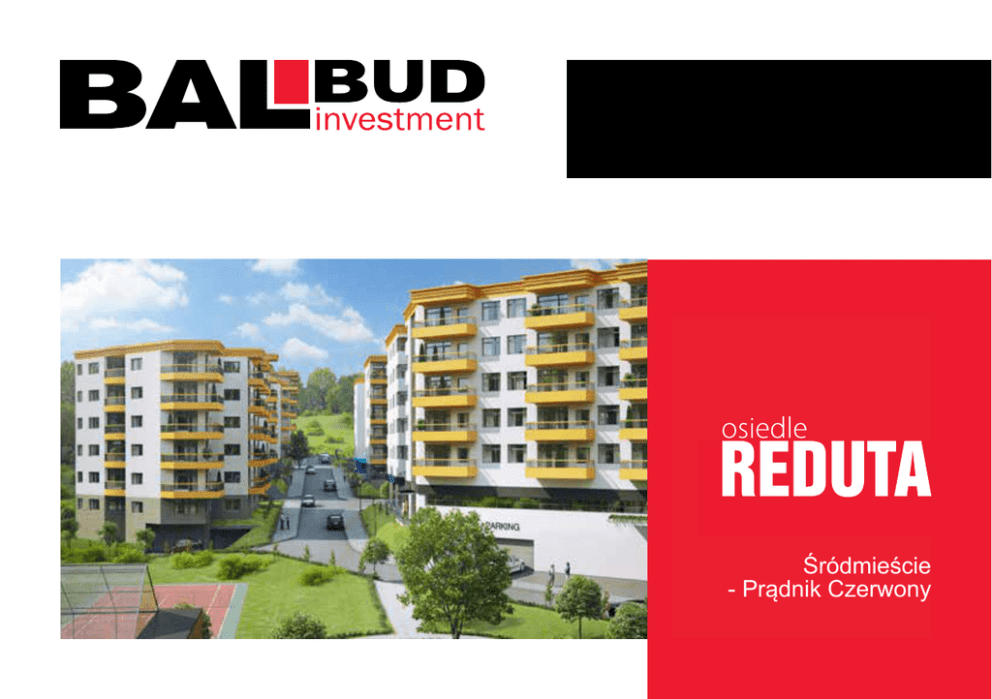 Osiedle REDUTA Śródmieście - Prądnik Czerwony Osiedle Osiedle Reduta to niewątpliwie Inwestycja Przyjazna Mieszkańcom. Nowoczesny kompleks budynków mieszkalno-usługowych przy ul. Reduta: Bliskość od Centrum Krakowa - zaledwie 7 km od Rynku Głównego, a tak daleko od zgiełku dużego miasta. Zielone otoczenie, piękny starodrzew nad spokojnym strumykiem, 40 arów parku rekreacyjno - spacerowego na terenie Osiedla, tworzy Redutę miejscem spokojnym, cichym i przyjaznym. REDUTA • mieszkania od 27 m2 do 65 m2 z opcją łączenia na większe; • miejsca postojowe, komórki lokatorskie w garażach podziemnych; • mieszkania z tarasami lub balkonami; • 6-kondygnacyjne budynki z cichobieżnymi windami; • bezpośrednie sąsiedztwo zielonych terenów spacerowych oraz punktów handlowo-usługowych: Real, Obi, Multikino, Aqua Park, doskonała lokalizacja w Śródmieściu; • planowane korty tenisowe. Tworzone na terenie inwestycji przedszkole, restauracja oraz lokale usługowe i handlowe zapewnią mieszkańcom wygodę i wysoki standard. Z drugiej strony, lokalizacja Inwestycji na Prądniku Czerwonym w Śródmieściu stwarza dogodne warunki zamieszkania blisko Centrum Krakowa, w bezpośrednim sąsiedztwie Multikina, Parku Wodnego i Galerii Krokus. Budynek Nr 4 Budynek mieszkalny posiada: • 6 kondygnacji; • 42 mieszkania - od 40,98 m2 do 59,81 m2; • garaż podziemny - 14 miejsc postojowych. Budynek oddany do użytkowania Budynek Nr 2 Przykładowe rzuty mieszkań Budynek mieszkalny posiada: • 6 kondygnacji; • 66 mieszkań - od 26,85 m2 do 64,92 m2; • dwupoziomowy garaż - 43 miejsca postojowe, 42 komórki lokatorskie; • 2 klatki schodowe. Mieszkanie 2-pokojowe 41,27m2 Mieszkanie 3-pokojowe 64.46m2 www.bal-bud.pl Budynek Nr 1 Przykładowe rzuty mieszkań Budynek mieszkalny posiada: • 6 kondygnacji; • 36 mieszkań - od 39,50 m2 do 65,36 m2; • dwupoziomowy garaż - 30 miejsc postojowych, 30 komórek lokatorskich. Mieszkanie 3-pokojowe 55.52m2 Mieszkanie 2-pokojowe 51.71m2 www.bal-bud.pl Budynek Nr 3 Przykładowe rzuty mieszkań Budynek mieszkalny posiada: • 6 kondygnacji; • 90 mieszkań - od 31,03 m2 do 58,28 m2; • dwupoziomowy garaż - 66 miejsc postojowych, 4 komórki lokatorskie; • 2 klatki schodowe. Mieszkanie 3-pokojowe 58.27m2 Mieszkanie 1-pokojowe 31.03m2 www.bal-bud.pl W przygotowaniu: Przykładowe rzuty mieszkań Budynek Nr 5 Budynek mieszkalny będzie posiadać: • 45 mieszkań; • dwupoziomowy garaż; • lokale usługowe. www.bal-bud.pl W przygotowaniu: Przykładowe rzuty mieszkań Budynek Nr 6 Budynek mieszkalny będzie posiadać: • 50 mieszkań; • dwupoziomowy garaż; • lokale usługowe. www.bal-bud.pl Biuro sprzedaży: ul. Reduta 26c/3 31- 421 Kraków Tel. 12 680 54 45 12 446 46 78 513 091 764 Fax. 12 686 00 36 [email protected] Godziny otwarcia: Poniedziałek - Piątek 9:00 - 17:00