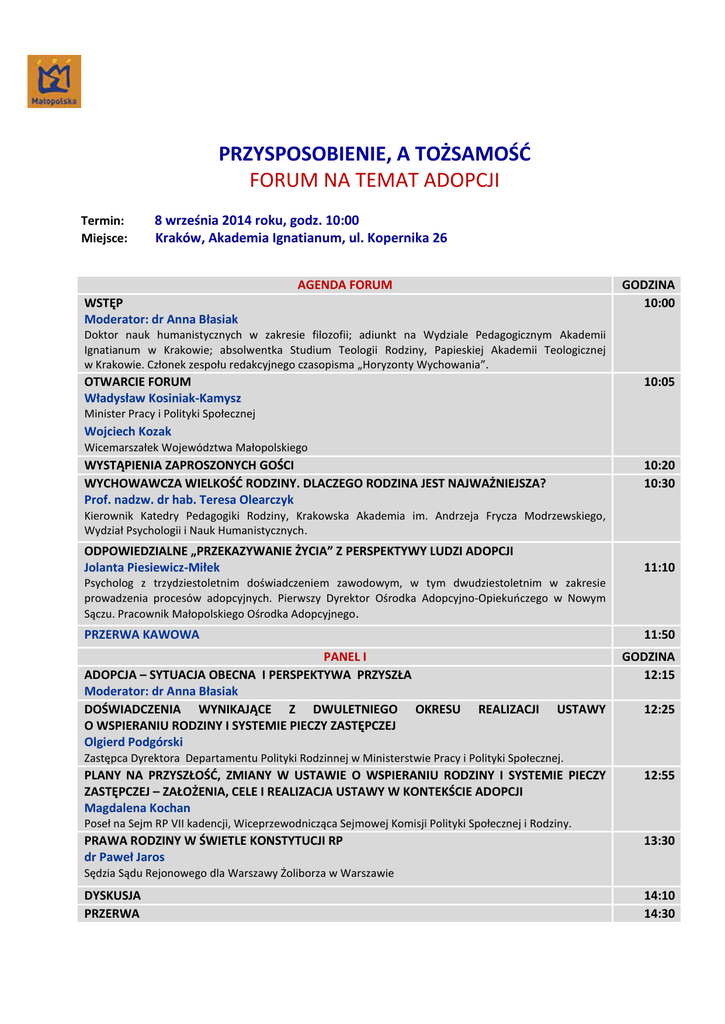 PRZYSPOSOBIENIE, A TOŻSAMOŚĆ FORUM NA TEMAT ADOPCJI Termin: Miejsce: 8 września 2014 roku, godz. 10:00 Kraków, Akademia Ignatianum, ul. Kopernika 26 AGENDA FORUM GODZINA 10:00 WSTĘP Moderator: dr Anna Błasiak Doktor nauk humanistycznych w zakresie filozofii; adiunkt na Wydziale Pedagogicznym Akademii Ignatianum w Krakowie; absolwentka Studium Teologii Rodziny, Papieskiej Akademii Teologicznej w Krakowie. Członek zespołu redakcyjnego czasopisma „Horyzonty Wychowania”. OTWARCIE FORUM Władysław Kosiniak-Kamysz 10:05 Minister Pracy i Polityki Społecznej Wojciech Kozak Wicemarszałek Województwa Małopolskiego WYSTĄPIENIA ZAPROSZONYCH GOŚCI WYCHOWAWCZA WIELKOŚĆ RODZINY. DLACZEGO RODZINA JEST NAJWAŻNIEJSZA? Prof. nadzw. dr hab. Teresa Olearczyk 10:20 10:30 Kierownik Katedry Pedagogiki Rodziny, Krakowska Akademia im. Andrzeja Frycza Modrzewskiego, Wydział Psychologii i Nauk Humanistycznych. ODPOWIEDZIALNE „PRZEKAZYWANIE ŻYCIA” Z PERSPEKTYWY LUDZI ADOPCJI Jolanta Piesiewicz-Miłek 11:10 Psycholog z trzydziestoletnim doświadczeniem zawodowym, w tym dwudziestoletnim w zakresie prowadzenia procesów adopcyjnych. Pierwszy Dyrektor Ośrodka Adopcyjno-Opiekuńczego w Nowym Sączu. Pracownik Małopolskiego Ośrodka Adopcyjnego. PRZERWA KAWOWA PANEL I ADOPCJA – SYTUACJA OBECNA I PERSPEKTYWA PRZYSZŁA Moderator: dr Anna Błasiak DOŚWIADCZENIA WYNIKAJĄCE Z DWULETNIEGO OKRESU O WSPIERANIU RODZINY I SYSTEMIE PIECZY ZASTĘPCZEJ Olgierd Podgórski 11:50 GODZINA 12:15 REALIZACJI USTAWY 12:25 Zastępca Dyrektora Departamentu Polityki Rodzinnej w Ministerstwie Pracy i Polityki Społecznej. PLANY NA PRZYSZŁOŚĆ, ZMIANY W USTAWIE O WSPIERANIU RODZINY I SYSTEMIE PIECZY ZASTĘPCZEJ – ZAŁOŻENIA, CELE I REALIZACJA USTAWY W KONTEKŚCIE ADOPCJI Magdalena Kochan 12:55 Poseł na Sejm RP VII kadencji, Wiceprzewodnicząca Sejmowej Komisji Polityki Społecznej i Rodziny. PRAWA RODZINY W ŚWIETLE KONSTYTUCJI RP dr Paweł Jaros 13:30 Sędzia Sądu Rejonowego dla Warszawy Żoliborza w Warszawie DYSKUSJA PRZERWA 14:10 14:30 PANEL II KIM JESTEM? W POSZUKIWANIU TOŻSAMOŚCI Moderator: Jolanta Piesiewicz -Miłek WIĘŹ PRZERWANA, WIĘŹ ODTWORZONA Dr med. Maciej Pilecki GODZINA 15:00 15:10 Lekarz, specjalista II stopnia z psychiatrii ogólnej, specjalista II stopnia z psychiatrii dzieci i młodzieży, Certyfikat Psychoterapeuty Polskiego Towarzystwa Psychiatrycznego, Konsultant Wojewódzki w Dziedzinie Psychiatrii Dzieci i Młodzieży. DWIE MATKI Katarzyna Kotowska 15:40 Powieściopisarka, autorka książki „ Jeż” „Wieża z klocków”, mama adopcyjna POSZUKIWANIE TOŻSAMOŚCI – DOŚWIADCZENIA WŁASNE Beata Wawrzkiewicz 16:00 Pedagog, absolwentka Akademii Ignatianum w Krakowie. Tomasz Siwa 16:25 Bohater historii opisanej w książce Anny Kamińskiej „Odnalezieni. Prawdziwe historie adoptowanych. DOROSŁY ADOPTOWANY- JAK POSZUKAĆ WŁASNYCH KORZENI? Dr Anna Wilk 16:40 Mgr prawa, dr nauk humanistycznych, mediator, pracownik Ośrodka Adopcyjnego Pro Familia DYSKUSJA/PODSUMOWANIE Moderator: dr Anna Błasiak Moderator: Jolanta Piesiewicz -Miłek Patronat honorowy: Patronat medialny: Małopolski Ośrodek Adopcyjny, Ośrodek Adopcyjny „Dzieło Pomocy Dzieciom ”, Ośrodek Adopcyjny Stowarzyszenia „Pro Familia ”, Ośrodek Adopcyjny Towarzystwa Przyjaciół Dzieci, Departament Zdrowia i Polityki Społecznej Urzędu Marszałkowskiego Województwa Małopolskiego. Udział w konferencji jest bezpłatny, dojazd uczestników na koszt własny. 16:55