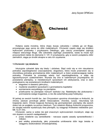 Jerzy Szyran OFMConv Chciwość Kolejna wada moralna, która drąży duszę człowieka i oddala go od Boga, przywiązując jego serce do dóbr materialnych. Chciwość często staje się źródłem wykroczeń przeciwko I przykazaniu Dekalogu, gdy rzeczy przemijalne zajmują miejsce wiecznego Boga. Dla człowieka żądnego posiadania, wada ta może być przyczynkiem także do złamania V, VII i X przykazania, gdy w swoim pożądaniu dóbr ziemskich, sięga po środki skrajne w celu ich uzyskania. 1.Chciwość i jej działanie Intuicyjnie człowiek lęka się biedy i ubóstwa. Stąd rodzi się w nim nieustanna potrzeba zapobiegliwości (oszczędzanie, skąpstwo), która może przerodzić się w chorobliwą potrzebę gromadzenia dóbr materialnych w ilości przekraczającej realne potrzeby. Potrzeba ta przestaje wtedy być zapobiegliwością, a staje się egocentrycznym uzależnieniem. Wyraża się ona w nadmiernym przywiązaniu do posiadania pieniędzy, w niewłaściwych sposobach ich zdobywania, oraz w złym posługiwaniu się posiadanymi środkami materialnymi: skąpstwo w dawaniu jałmużny;, myślenie wszelkimi sposobami o gromadzeniu kapitałów wymienianie wszystkiego na pieniądze; przeliczanie na pieniądze różnych wartości (np. filatelistyka dla ulokowania i pomnażania swego bogactwa, a nie dla szlachetnej pasji hobbysty). W jednej ze swoich homilii św. Jan Chryzostom upomina chrześcijan w Antiochii, że chciwy zawsze prorokuje jakieś nieszczęście; choroba, susza, nieurodzaj lub trzęsienie ziemi. Chciwi bogacze tłumaczą się gromadzeniem pieniędzy dla swoich dzieci lub ze względu na pomoc biednym. Tym ostatnim Biskup Antiochii przypomina, że ubogiej wdowie wystarczyły dwa pieniążki, by osiągnąć Królestwo niebieskie (por. Mk 12,41-44). Chciwość, sama w sobie nie jest znacznym wykroczeniem moralnym; staje się nim dopiero w swoich następstwach: przez działanie czy zaniedbanie - narusza często zasady sprawiedliwości i miłości; jest wielką przeszkodą, jako przesadne umiłowanie dóbr tego świata w osiąganiu doskonałości chrześcijańskiej; praktycznie wyklucza prawdziwą doskonałość jako uleganie „pożądliwości oczu". Serce chciwego krąży wokół skarbca, który wciąż wydaje się nie dość pełny. 2. Formy chciwości Chciwość nie jest wadą jednowymiarową – jest ona matką trzech „synów”, których imiona brzmią: więcej, nowocześniej, modniej. 2.1. Więcej Stara zasada głosi, że ten, kto ma 500000 zł, ma mniej od tego, który ma 1000000 zł. Jeśli kupiłem dom, za jakiś czas zamarzy mi się dom z basenem. A jeśli z basenem, to dlaczego nie z kortem do tenisa? Zachcianki rosną wprost proporcjonalnie do ilości posiadanych pieniędzy. 2.2. Nowocześniej Ta odmiana chciwości w naszych czasach rozbrzmiewa hasłem: „pozwól sobie na odrobinę luksusu”, a jej nagminnym przejawem jest tzw. gadżeciarstwo. Trzyletni komputer jest już zabytkiem w porównaniu z tym, co już jest dostępne na rynku. Komórkę trzeba wymienić na smartfona, a Opla na Ferrari. W ten sposób rośnie w człowieku głód nowości i nowoczesności, który w dzisiejszych czasach nigdy nie ulegnie zaspokojeniu. 2.3. Modniej „Co mam na siebie założyć?”. Odwieczny dylemat. Zeszłoroczna sukienka już nie wchodzi w rachubę. Do nowej zaś trzeba dopasować torebkę, buty i dodatki. Podobnie funkcjonuje wielu mężczyzn, zapełniając szafę garniturami, koszulami i krawatami na jedną okazję. Podobne tendencje można zaobserwować w świecie kosmetyków: „zniewalający zapach”, „wyjątkowy kolor”, „rzęsy pogrubione o 100%”. Spirala mody nakręcana przez jej dyktatorów i wizażystów rośnie bez końca. 3. Z mądrości Ojców Kościoła „Przypatrz się, człowiecze, naturze bogactwa. Czemu cię złoto tak niepokoi i nęci? Złoto - to kamień, srebro to kamień, perła - to kamień, każdy z klejnotów kamień... Kogo oszczędziła śmierć dla jego bogactwa? Kogo ominęła choroba dla jego pieniędzy? Dopókiż trwa przy tobie złoto, ten stryczek dusz, haczyk śmierci, przynęta grzechu? Dopóki trwa przy tobie bogactwo, ta podstawa wojny, dla której kuje się oręż, dla której ostrzy się miecze? Z powodu niego krewni nie znają przyrodzonych więzów, bracia spoglądają na siebie morderczo; z powodu bogactwa pustkowia chowają morderców, morze korsarzy, miasta dusicieli. Kto jest ojcem kłamstwa? Kto podrabiaczem fałszywych dokumentów? Kto ojcem krzywoprzysięstwa? Czy nie bogactwo? Czy nie zabieganie o nie? Co się z wami dzieje ludzie? Kto waszą własność obraca przeciw wam na zasadzkę? Ma to być przecież pomoc w życiu, bo pieniędzy nie dano wam jako zaopatrzenia do złego. Ma to być okup duszy, a nie sposobność do jej zguby" (Bazyli Wielki, Homilia przeciw bogaczom, 7). „Dlatego ktoś powiedział, że nie ma nic gorszego od człowieka chciwego. Sprzedaje on również siebie, krąży jako powszechny nieprzyjaciel rodu ludzkiego, żałując, że ziemia zamiast kłosów, źródła zamiast zdrojów, góry zamiast kamieni nie wydają złota. Zżyma się na urodzajny rok, krzywi się na dobro publiczne; odwraca się od wszelkiej sprawy, gdzie nie można dostać pieniędzy; znosi wszystko tam, gdzie można dostać choćby dwa obole. Nienawidzi wszystkich, biednych i bogatych. Biednych, aby nie udawali się do niego z prośbą, bogatych - ponieważ nie posiada ich majątku. O wszystkich myśli, że posiadają jego mienie i gniewa się na wszystkich, jakby był przez wszystkich pokrzywdzony” (Jan Chryzostom, Homilie do Ewangelii według św. Mateusza, 80, 4). 4. Przeciwstawianie się chciwości Chciwość rodzi się z naturalnej potrzeby człowieka samozachowania, zabezpieczenia przyszłości, przewagi nad innymi. W dzisiejszych czasach posiadanie dóbr jest poniekąd wymogiem ducha cywilizacji opartej na czci złotego cielca. Stąd każdy musi ustawicznie uświadamiać sobie naukę Ewangelii: „Nie gromadź
