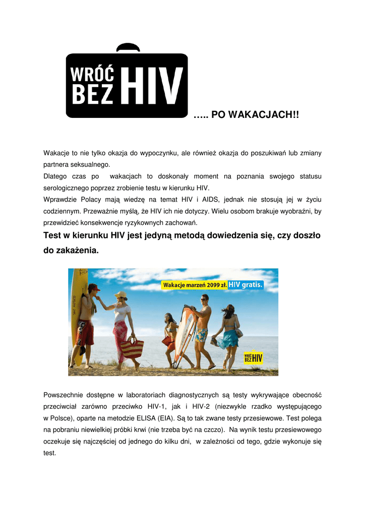 ….. PO WAKACJACH!! Wakacje to nie tylko okazja do wypoczynku, ale również okazja do poszukiwań lub zmiany partnera seksualnego. Dlatego czas po wakacjach to doskonały moment na poznania swojego statusu serologicznego poprzez zrobienie testu w kierunku HIV. Wprawdzie Polacy mają wiedzę na temat HIV i AIDS, jednak nie stosują jej w życiu codziennym. Przeważnie myślą, że HIV ich nie dotyczy. Wielu osobom brakuje wyobraźni, by przewidzieć konsekwencje ryzykownych zachowań. Test w kierunku HIV jest jedyną metodą dowiedzenia się, czy doszło do zakażenia. Powszechnie dostępne w laboratoriach diagnostycznych są testy wykrywające obecność przeciwciał zarówno przeciwko HIV-1, jak i HIV-2 (niezwykle rzadko występującego w Polsce), oparte na metodzie ELISA (EIA). Są to tak zwane testy przesiewowe. Test polega na pobraniu niewielkiej próbki krwi (nie trzeba być na czczo). Na wynik testu przesiewowego oczekuje się najczęściej od jednego do kilku dni, w zależności od tego, gdzie wykonuje się test. - Wynik ujemny (negatywny) testu przesiewowego oznacza, że nie znaleziono przeciwciał anty-HIV. Jeżeli od „ryzykownego zachowania” minęło 12 tygodni i więcej, a wynik testu przesiewowego jest ujemny, oznacza to, iż nie doszło do zakażenia. + Wynik dodatni (pozytywny) testu ELISA (EIA) nie dowodzi jeszcze zakażenia. Z różnych przyczyn taki wynik może być fałszywie dodatni. Wynik taki zawsze musi zostać potwierdzony testem potwierdzenia. Dopiero dodatni wynik testu potwierdzenia upoważnia do stwierdzenia, iż pacjent jest zakażony HIV. Sam decydujesz o miejscu i sposobie wykonania testu! Poradnictwo przed i po teście jest ważne! Zachęcamy do wykonania testu w jednym z punktów konsultacyjno – diagnostycznych (PKD), w których można wykonać test w kierunku HIV anonimowo i bezpłatnie. Badanie w PKD zawsze poprzedzone jest rozmową z doradcą, który poinformuje o przebiegu testu, interpretacji wyniku, oszacuje ryzyko zakażenia oraz co najważniejsze – ustali, czy jest to dobry moment na wykonanie testu. Doradca towarzyszy również podczas otrzymania wyniku testu, aby móc wyjaśnić jego znaczenie, odpowiedzieć na wszelkie wątpliwości, a w przypadku wyniku dodatniego wesprzeć i wskazać dalsze możliwości postępowania. Poza PKD badania możesz wykonać w poradniach przy klinikach chorób zakaźnych, w niektórych stacjach sanitarno-epidemiologicznych oraz w wielu różnych laboratoriach diagnostycznych. W tych miejscach badanie jest płatne (cena zależy od miejsca), często nieanonimowe i rzadko poprzedzone rozmową okołotestową. Podczas kontaktów seksualnych istnieje ryzyko zakażenia wirusem zapalenia wątroby typu B i typu C, a także wieloma innymi chorobami przenoszonymi drogą płciową. Warto, w trosce o zdrowie, wykonać badania także w tym kierunku. Jeżeli stwierdzisz, że Twoje zachowanie mogło narazić Cię na zakażenie wirusem HIV – warto wykonać badania - aby móc właściwie postępować i zaplanować swoją przyszłość. (Źródło: Krajowe Centrum ds. AIDS) W Punkcie Konsultacyjno – Diagnostycznym w Poznaniu można wykonać test na obecność wirusa HIV anonimowo i bezpłatnie. Adres: Nobel Tower IV Piętro , ul. Dąbrowskiego 77 Poznań woj. Wielkopolskie, tel. 730 110 830, czwartki 9.00 – 11.00 Godziny pracy Punktu • poniedziałek 16.00 – 19.00 • czwartek 16.00 – 19.00 • piątek 16.00 – 19.00 e-mail: [email protected] Procedura wykonywania badania: 1. Badania i testy HIV wykonywane są anonimowo i bezpłatnie. 2. Osoba zainteresowana badaniem w pierwszej kolejności udaje się na rozmowę z doradcą podczas. Doradca weryfikuje konieczność wykonania badania w kierunku HIV poprzez zidentyfikowanie ryzykowanych zachowań, podczas których mogłoby dojść do zakażenia. 3. Następnie klient kierowany jest do gabinetu pobrań, gdzie pielęgniarka pobiera krew do badania. 4. Wyniki odbierane są u doradcy osobiście po okazaniu numeru identyfikacyjnego. Punkt prowadzony jest przez Fundację Simontonowski Instytut Zdrowia dzięki wsparciu: • • • • Krajowego Centrum ds. AIDS, Wielkopolskiego Urzędu Wojewódzkiego w Poznaniu, Urzędu Marszałkowskiego Województwa Wielkopolskiego, Urzędu Miasta Poznania. Aktualne adresy i godziny pracy PKD w Polsce znajdują się na stronie internetowej www.aids.gov.pl w zakładce „Testy na HIV”.